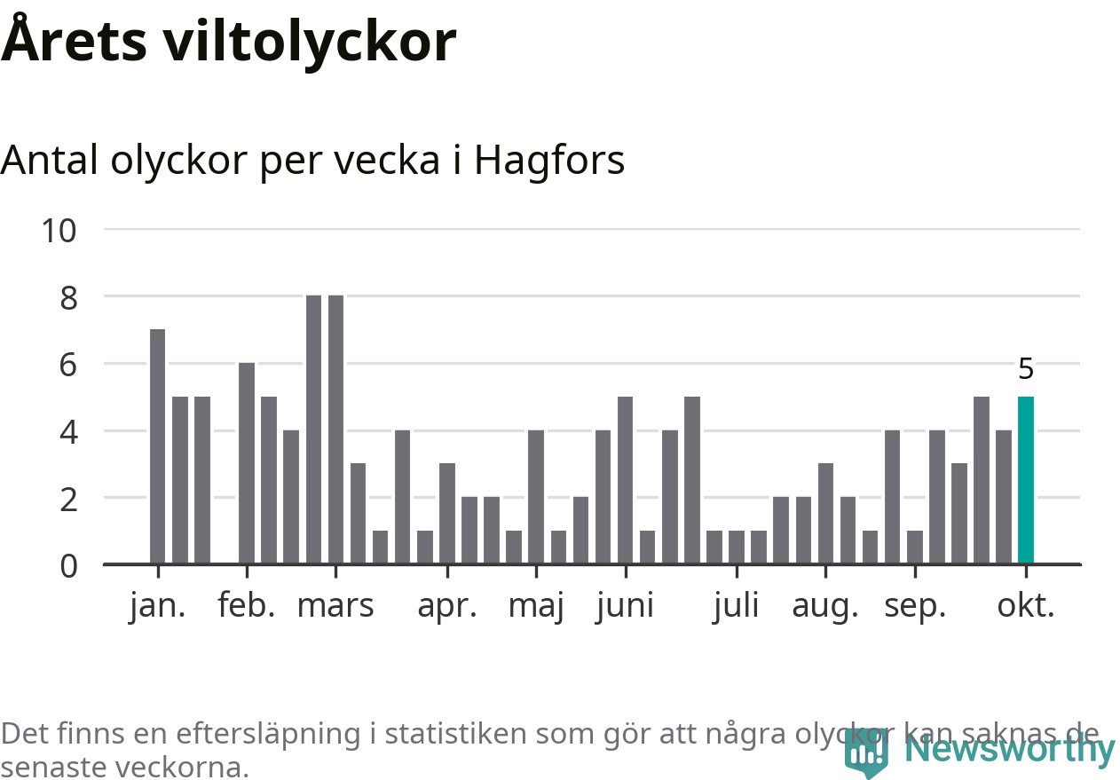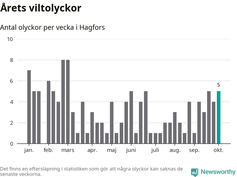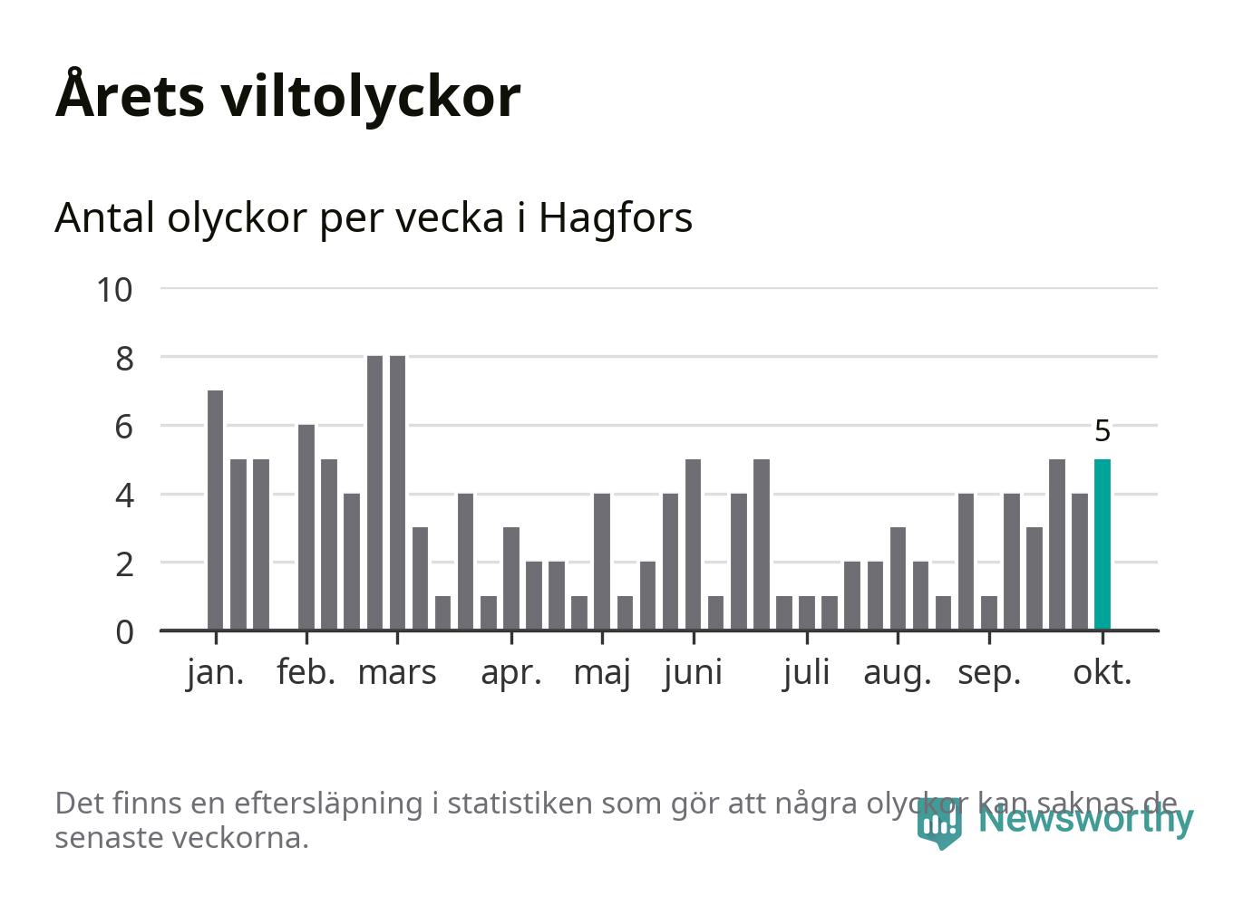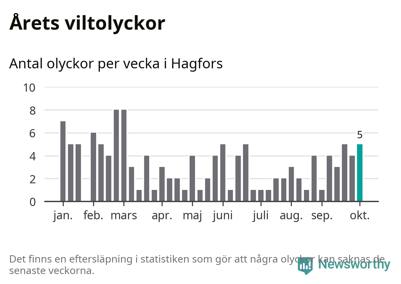 Hittills har fem viltolyckor rapporterats in i Hagfors kommun från vecka 41. Se listan här.