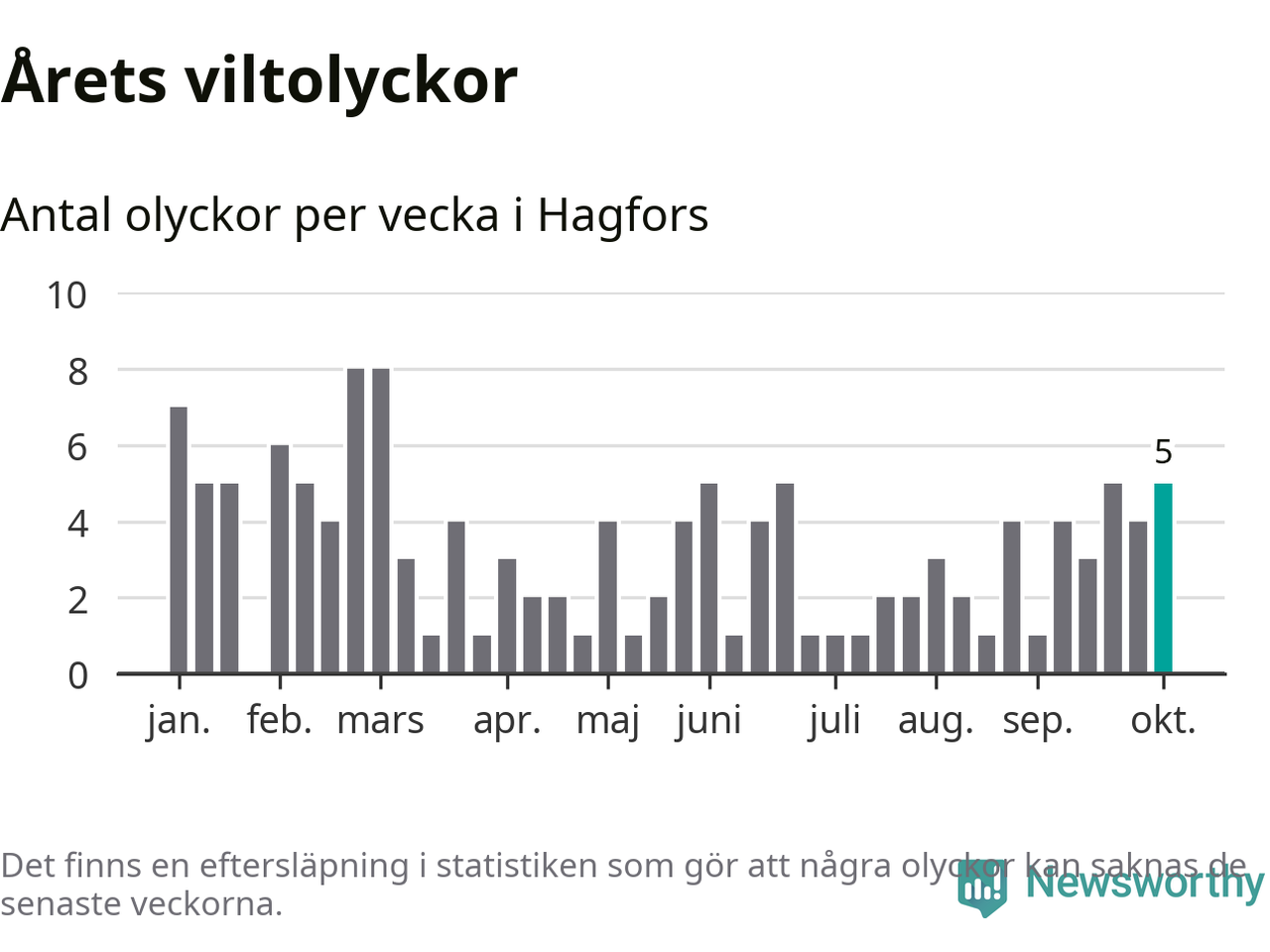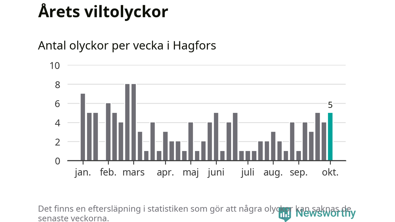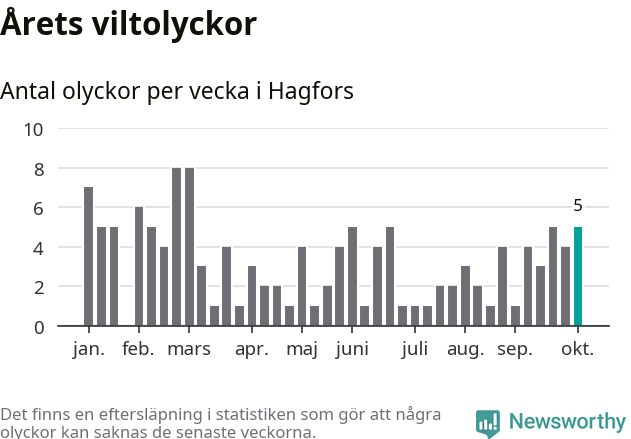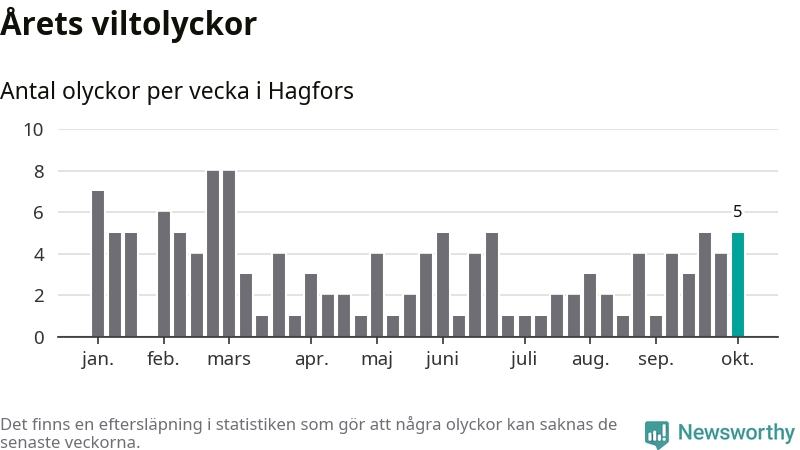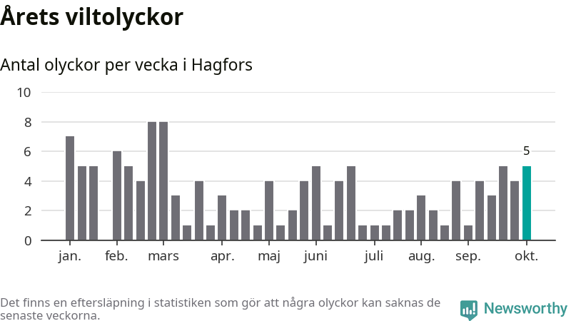 Hittills har fem viltolyckor rapporterats in i Hagfors kommun från vecka 41. Se listan här.