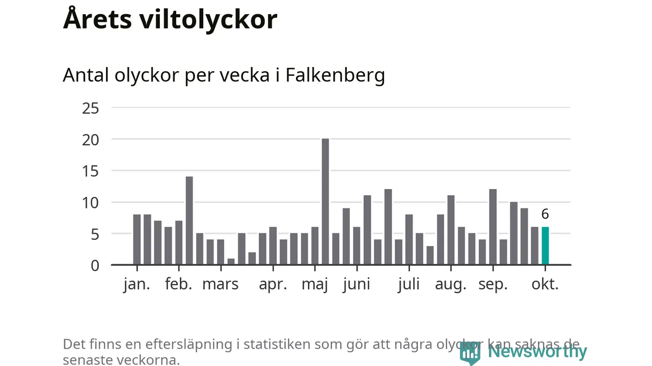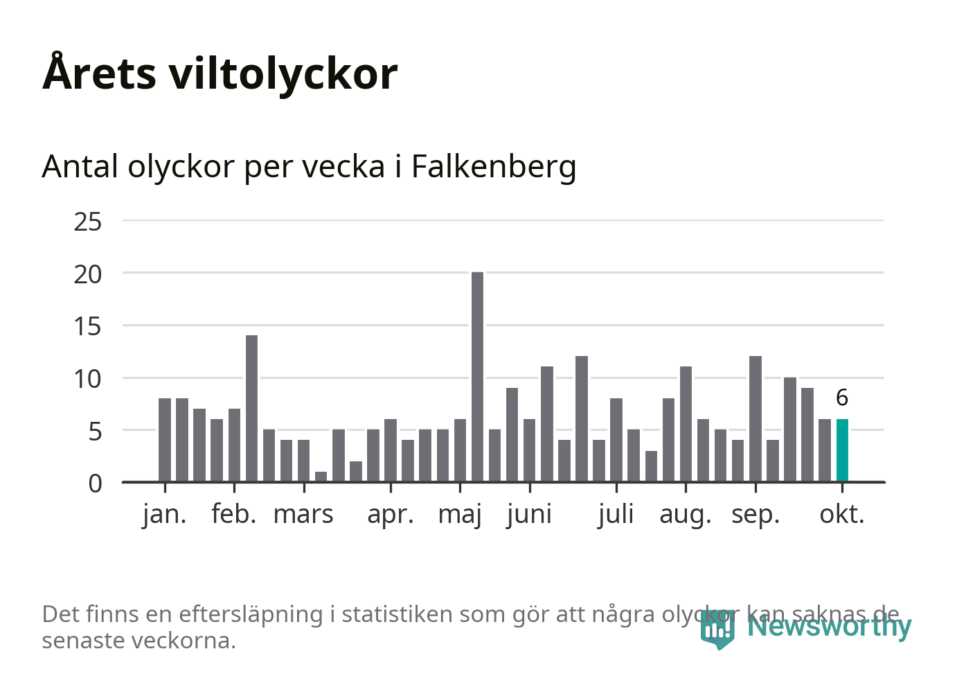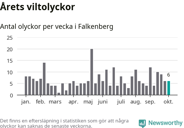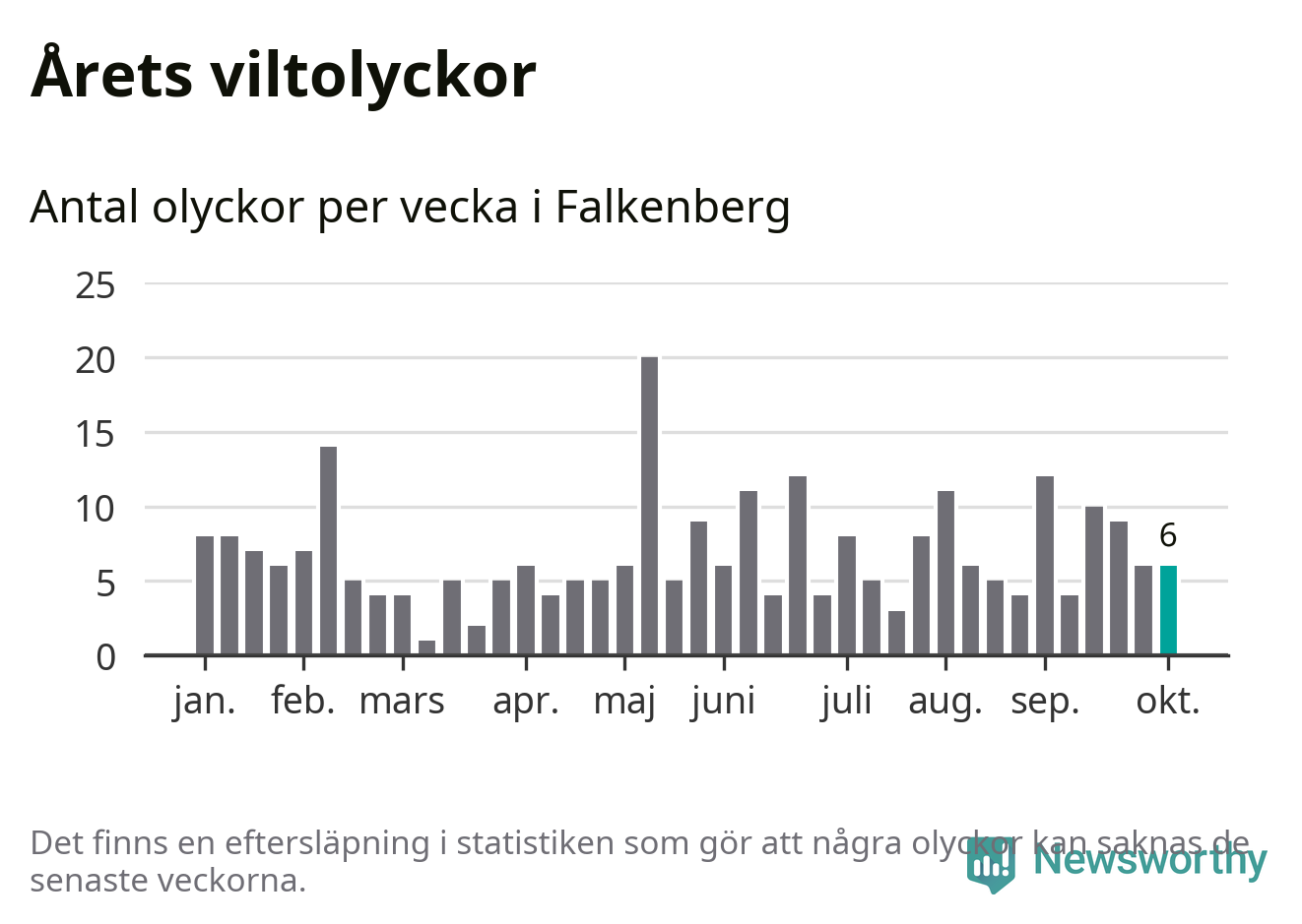 Hittills har sex viltolyckor rapporterats in i Falkenbergs kommun från vecka 41. Se listan här.