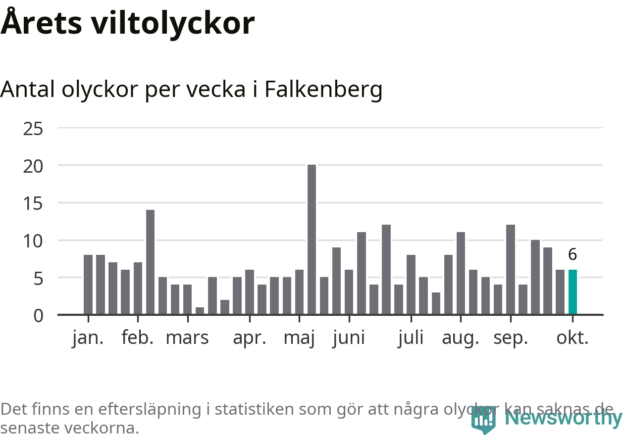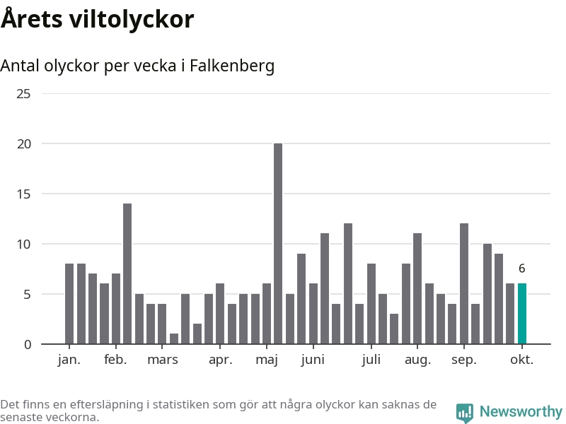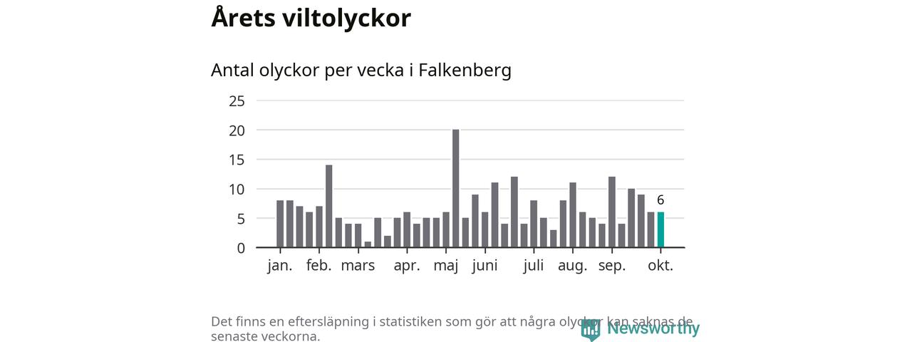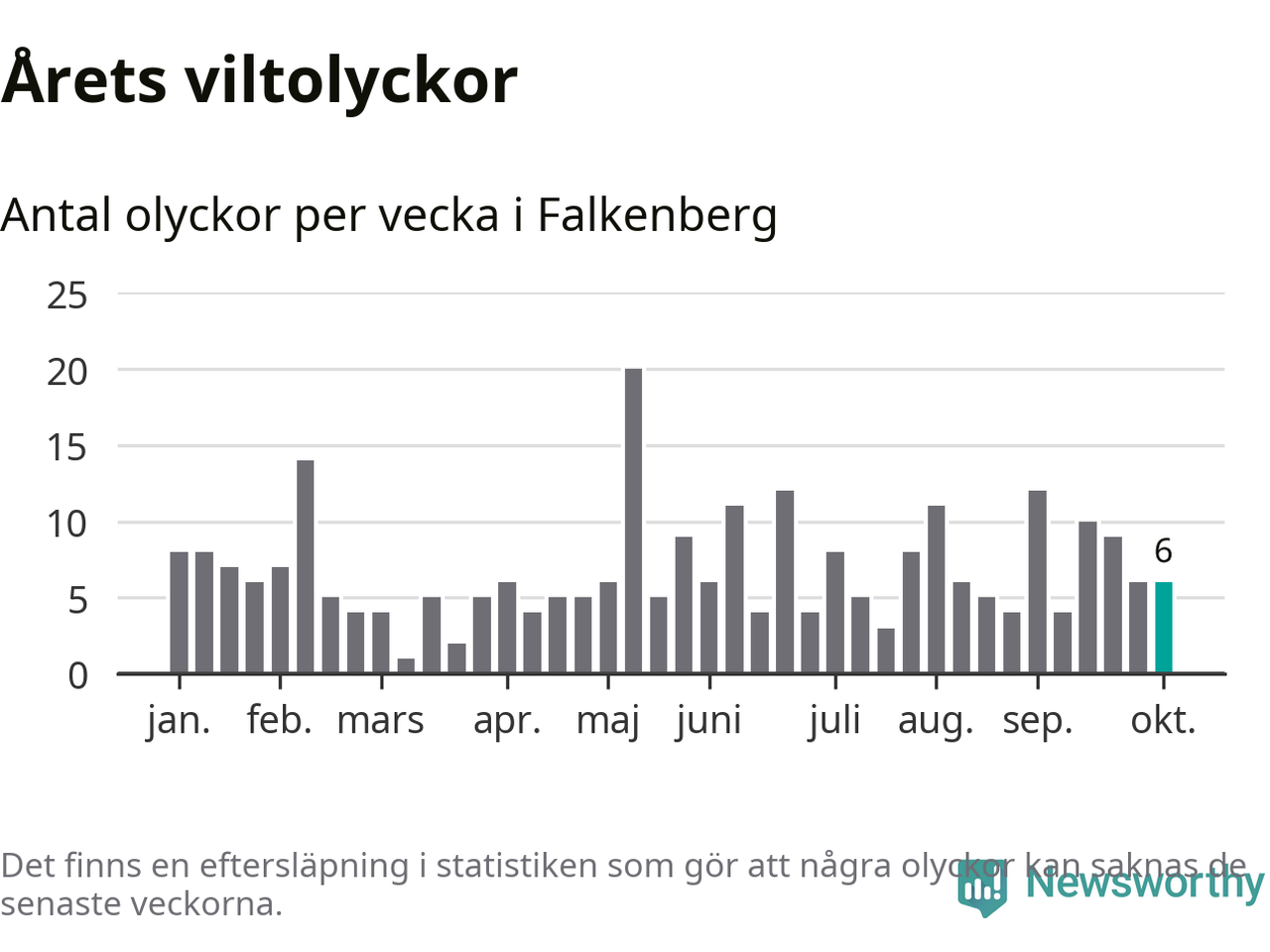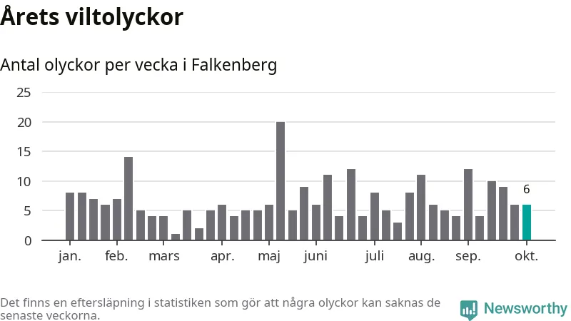 Hittills har sex viltolyckor rapporterats in i Falkenbergs kommun från vecka 41. Se listan här.