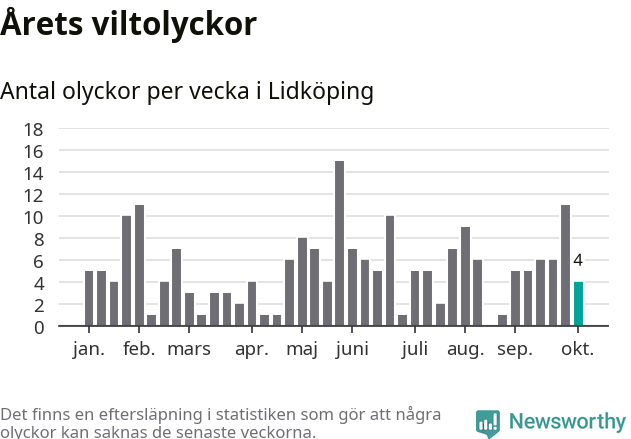 Totalt det här året har det inträffat 209 viltolyckor i kommunen. Det är mer än genomsnittet för motsvarande period (omkring 162) de senaste tio åren.