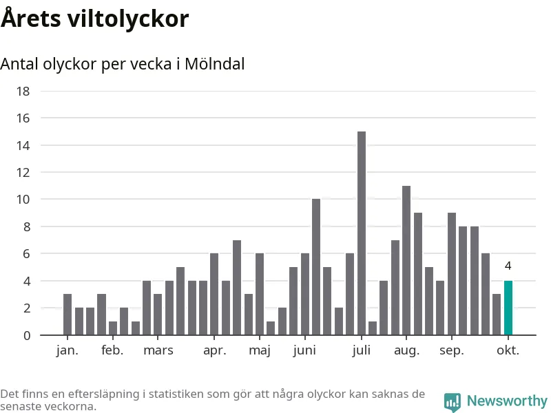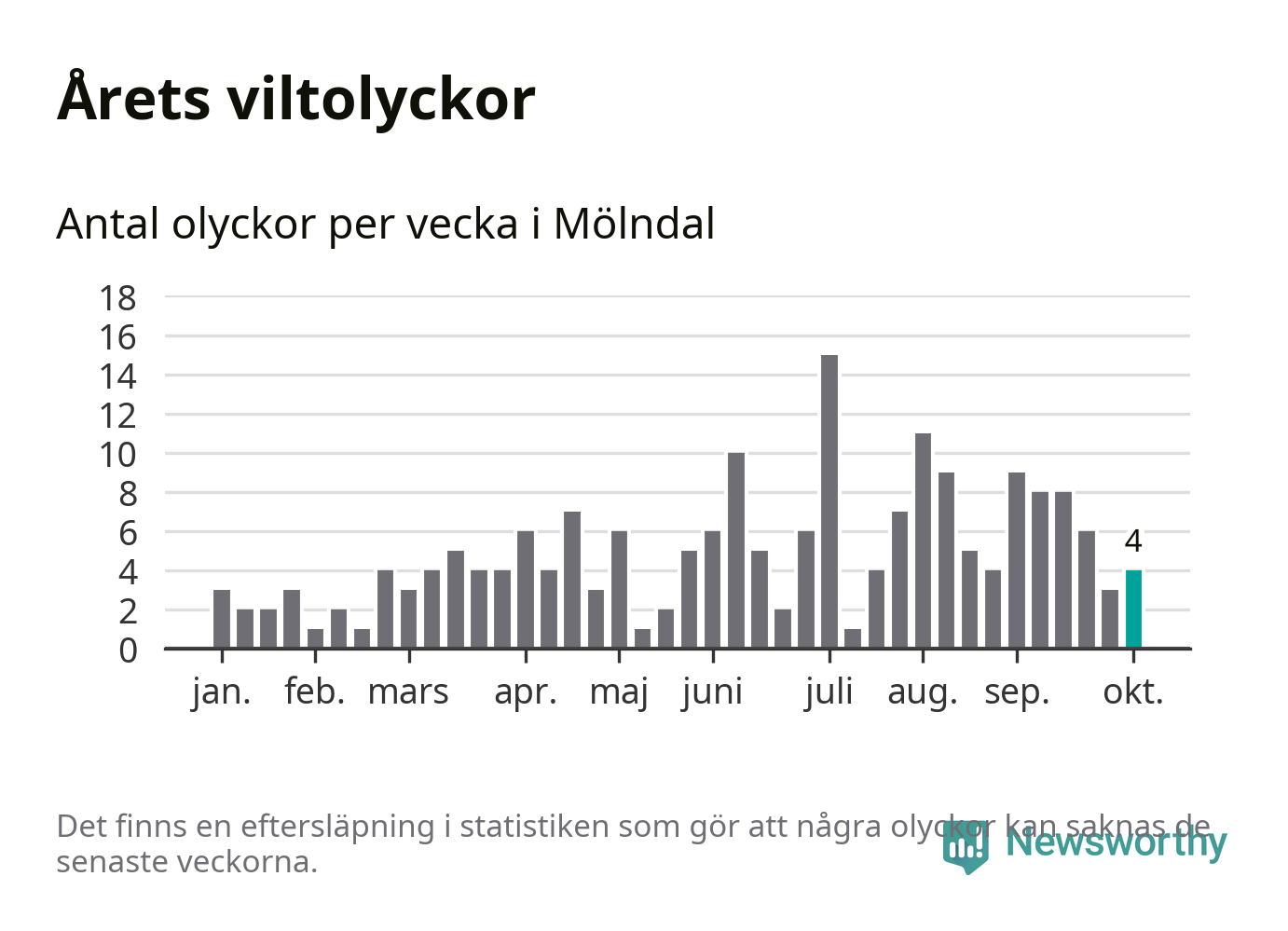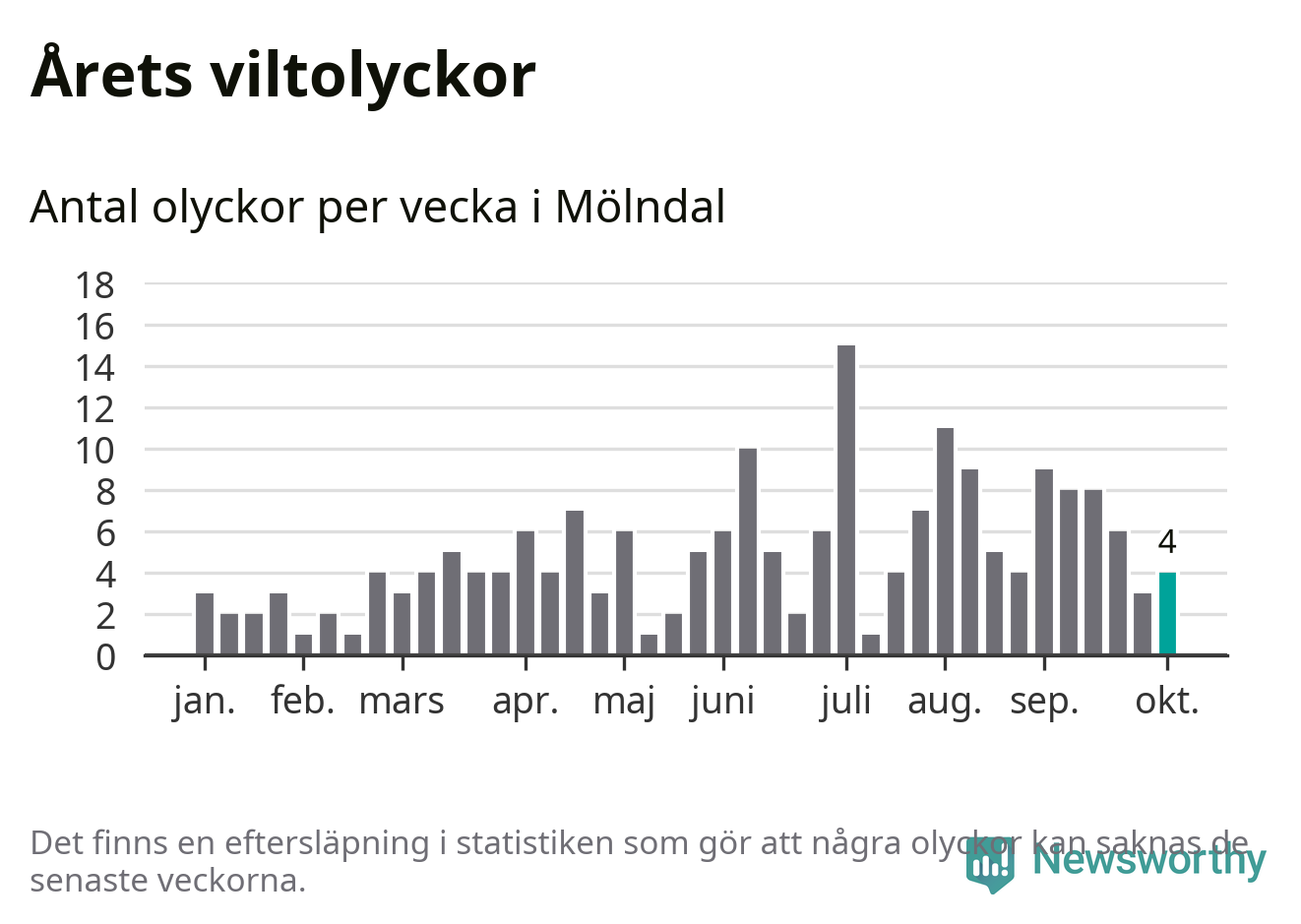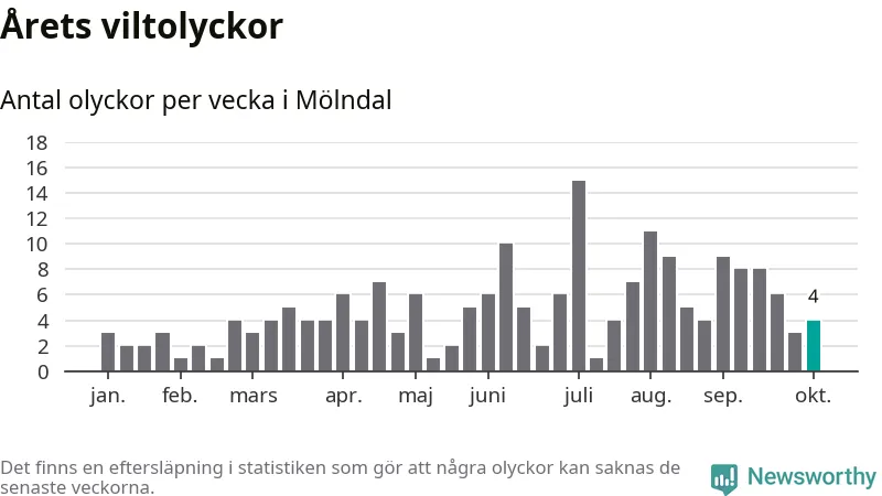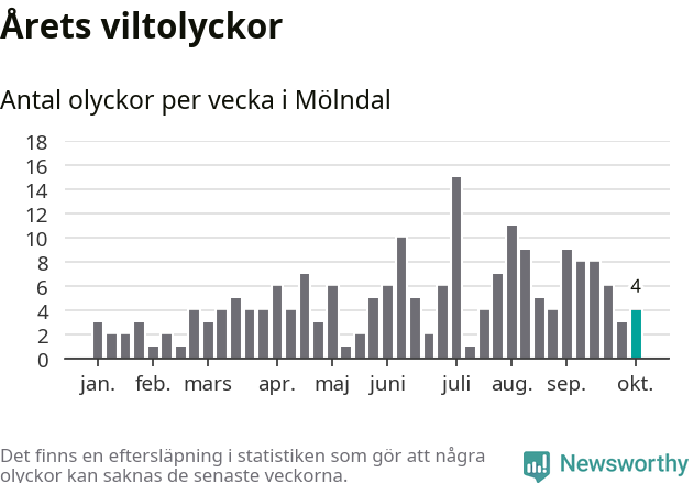 Hittills har fyra viltolyckor rapporterats in i Mölndals kommun från vecka 41. Se listan här.
