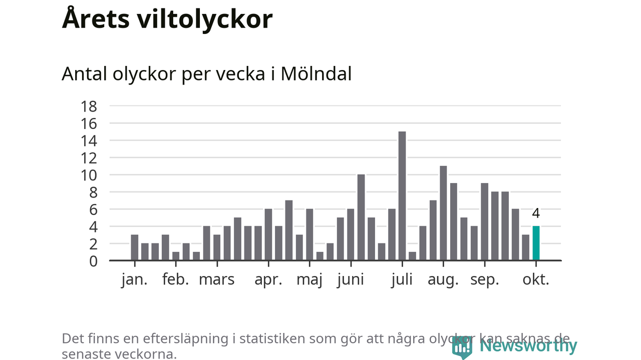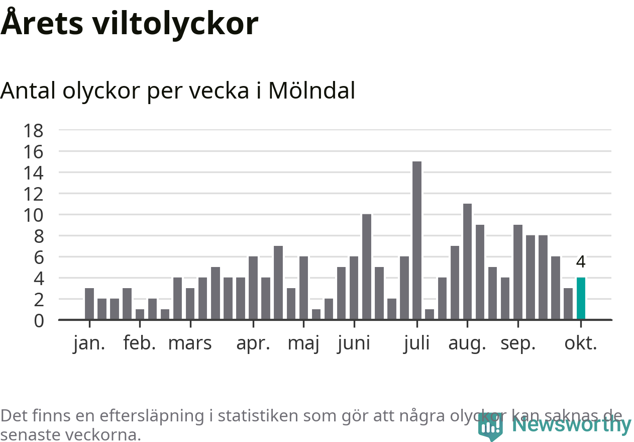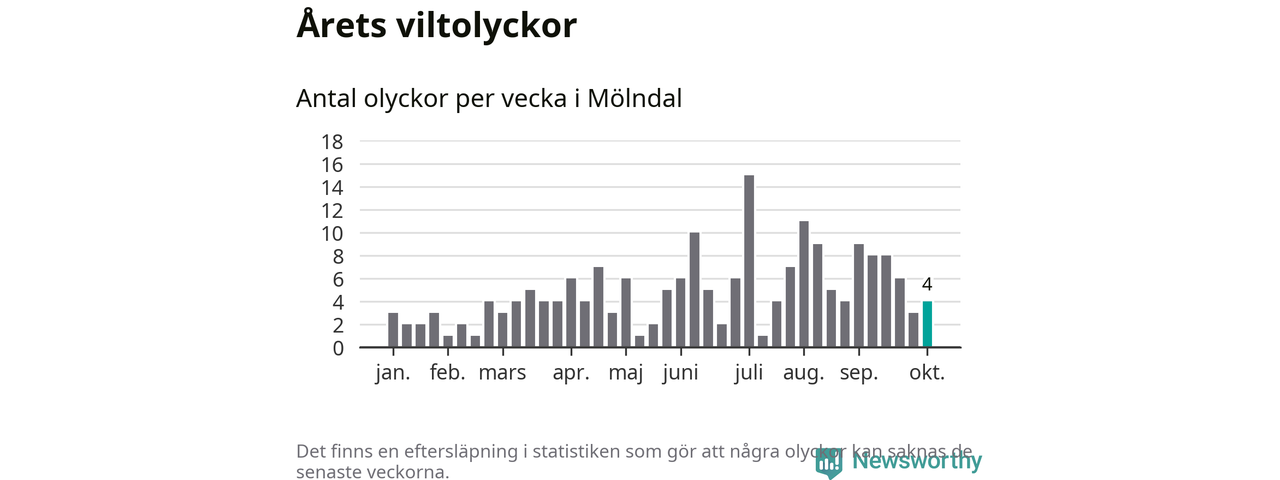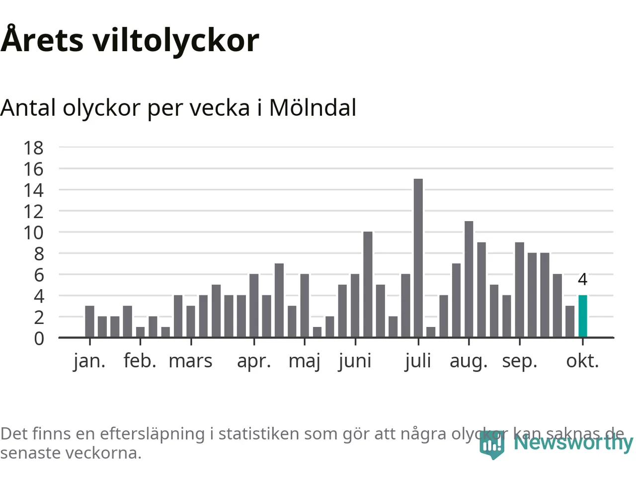 Hittills har fyra viltolyckor rapporterats in i Mölndals kommun från vecka 41. Se listan här.