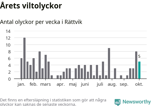 Totalt det här året har det inträffat 137 viltolyckor i kommunen. Det är en normal nivå i förhållande till hur det har sett ut under de senaste tio åren – genomsnittet för motsvarande period är 130.