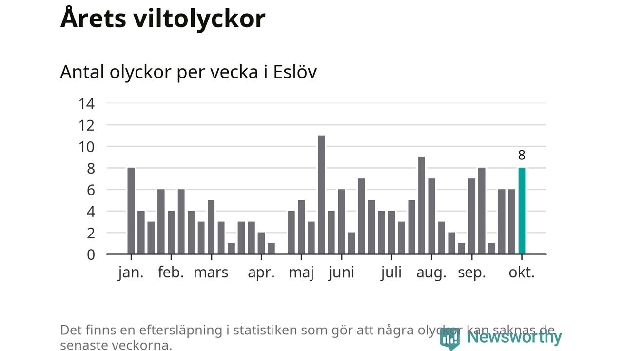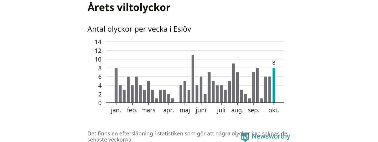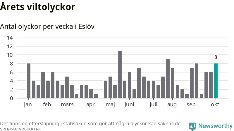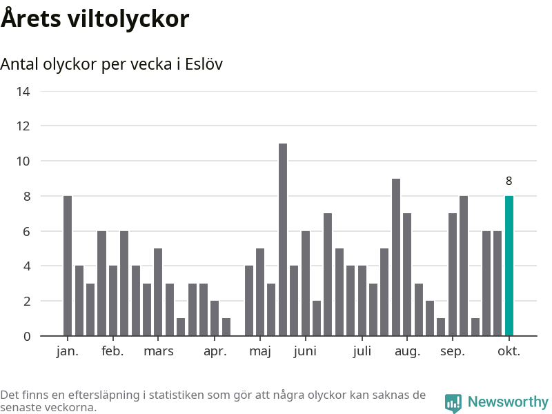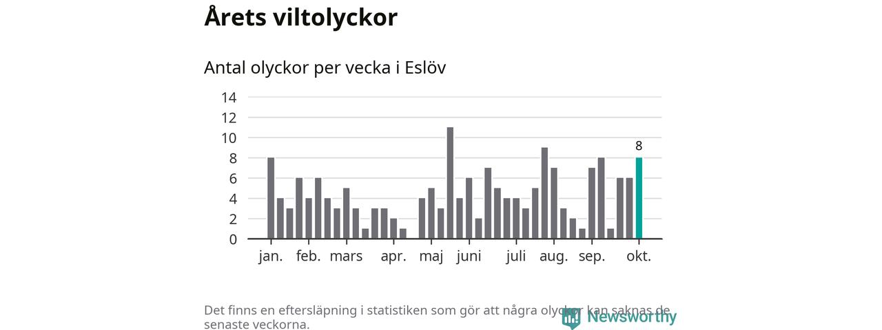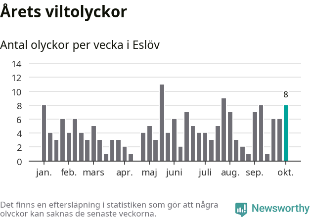 Hittills har åtta viltolyckor rapporterats in i Eslövs kommun från vecka 41. Se listan här.