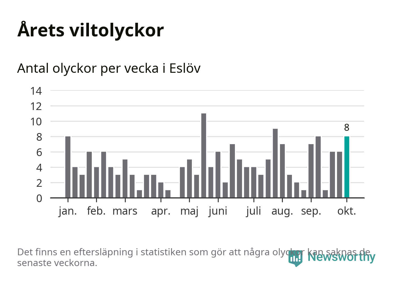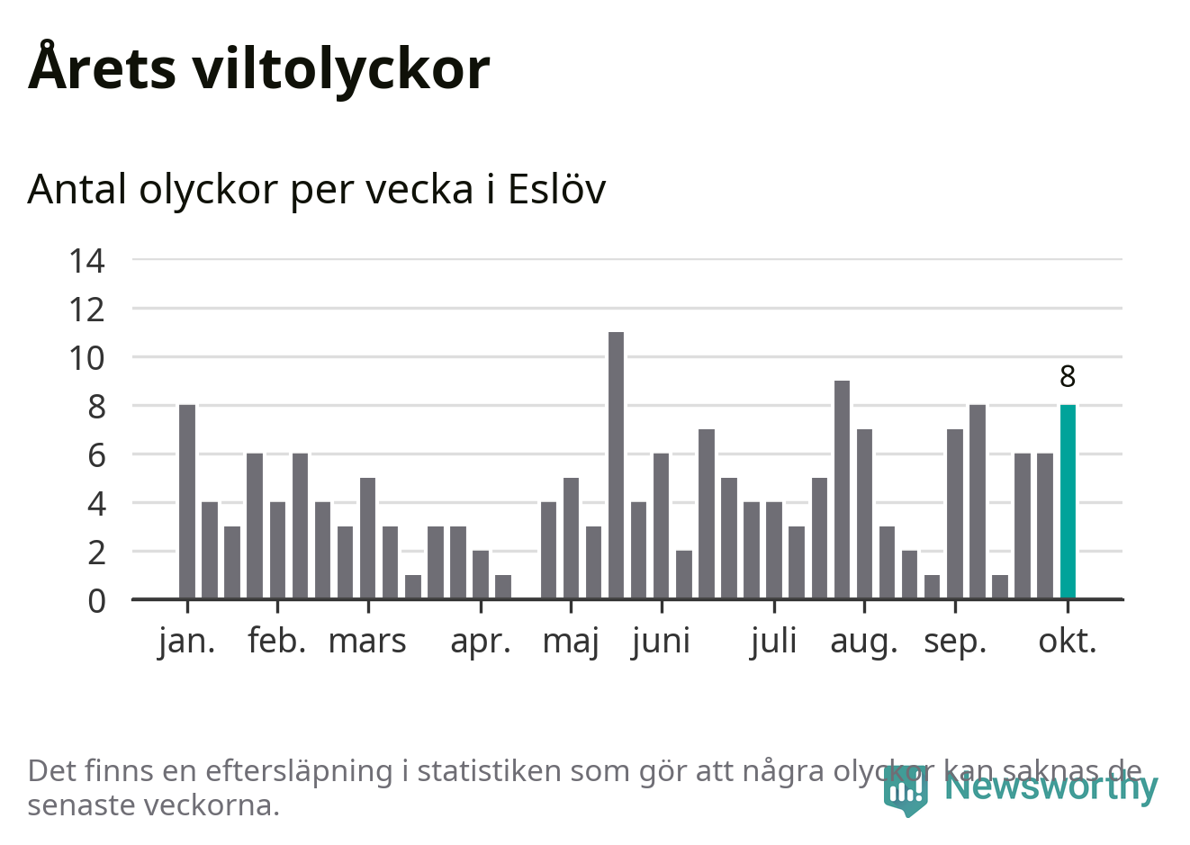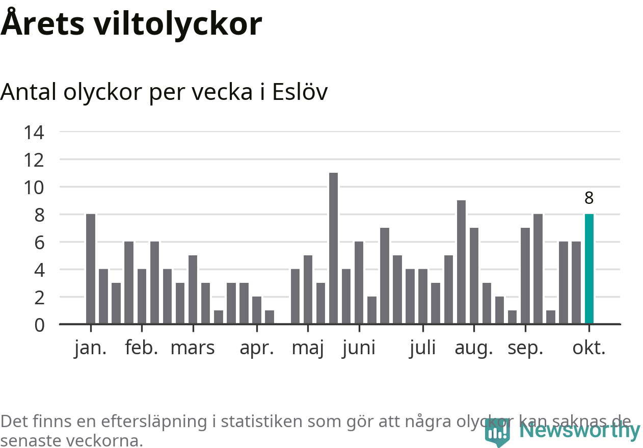 Hittills har åtta viltolyckor rapporterats in i Eslövs kommun från vecka 41. Se listan här.