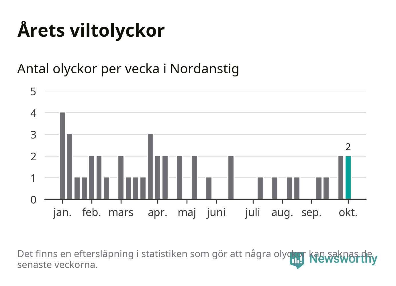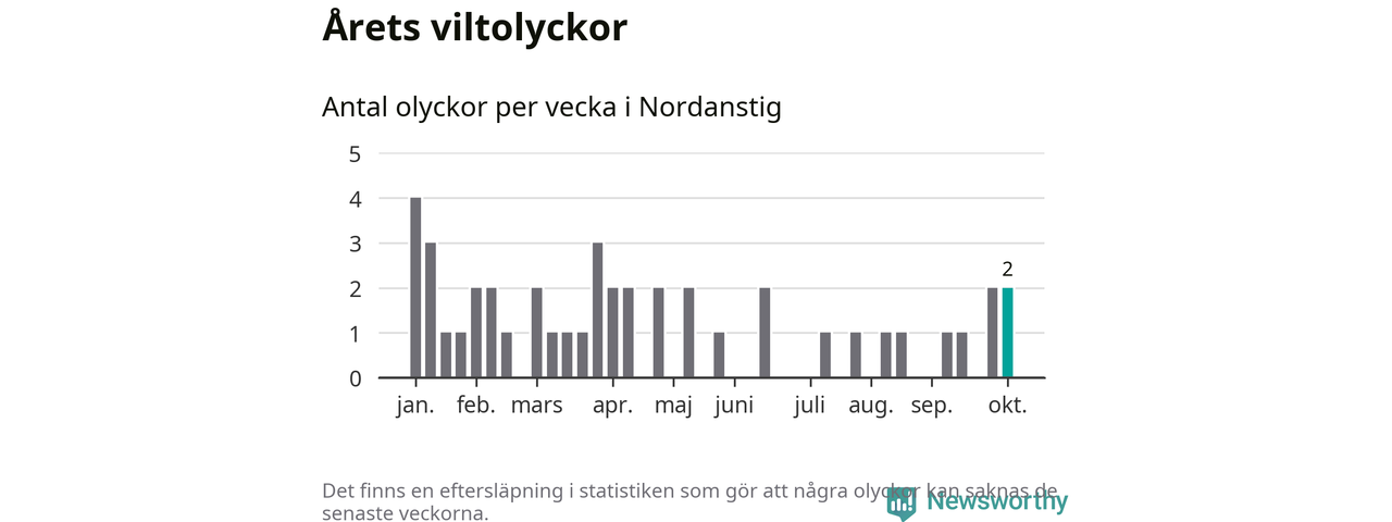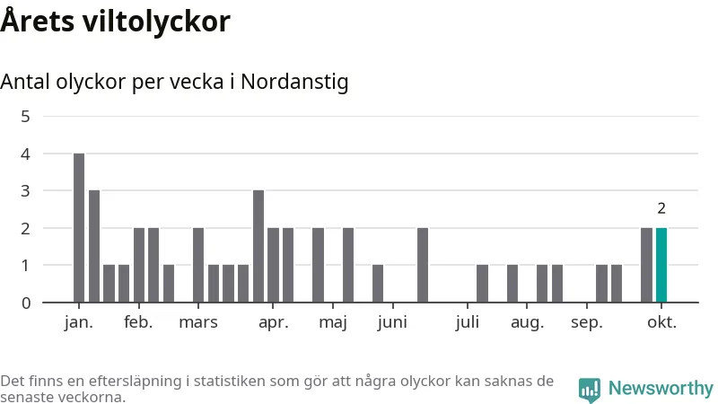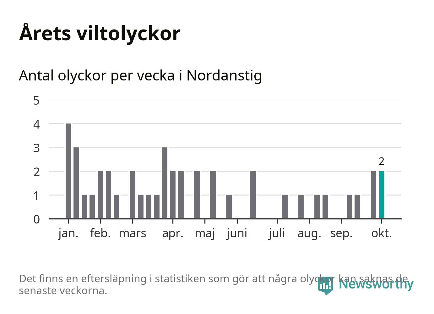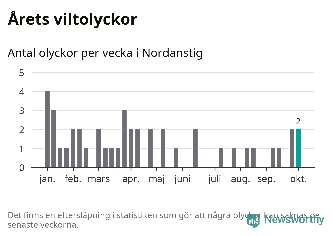 Hittills har två viltolyckor rapporterats in i Nordanstigs kommun från vecka 41. Se listan här.