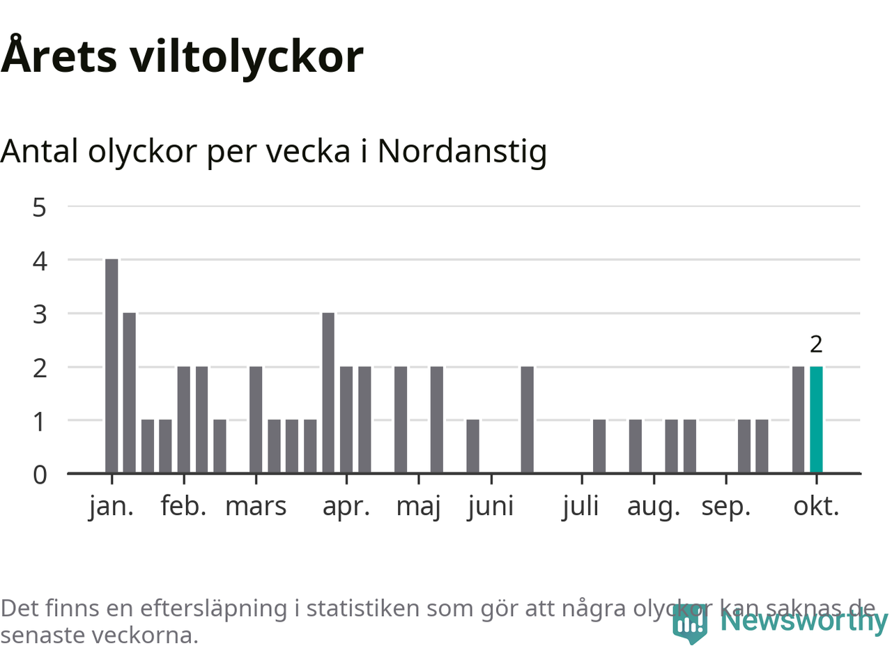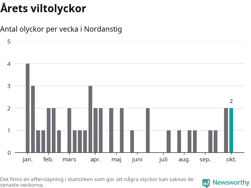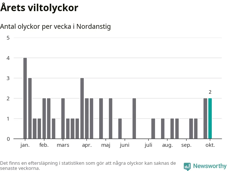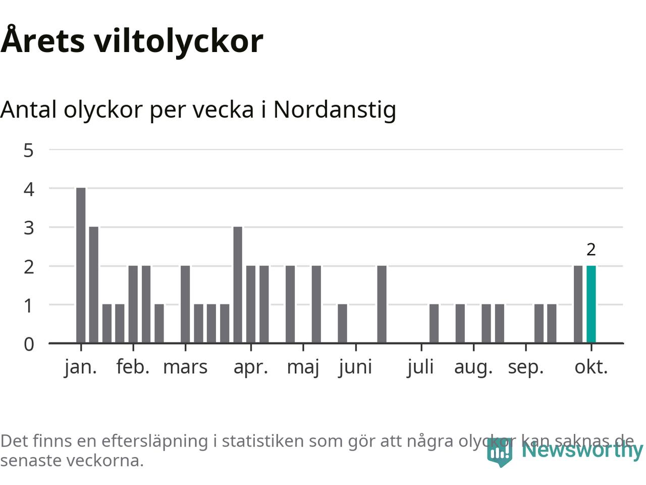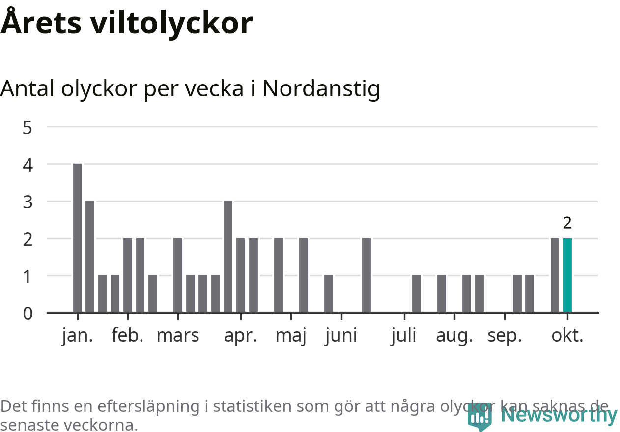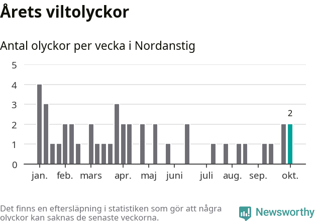 Hittills har två viltolyckor rapporterats in i Nordanstigs kommun från vecka 41. Se listan här.