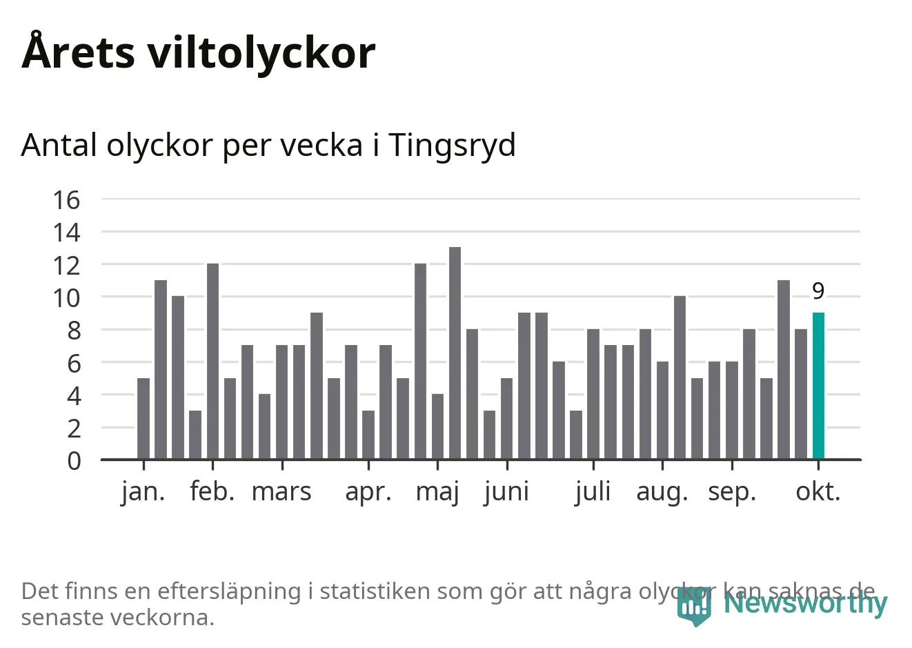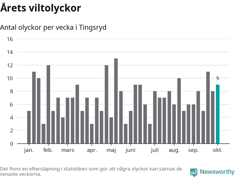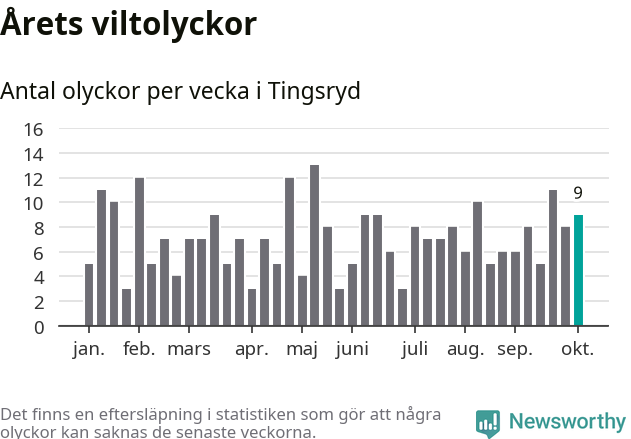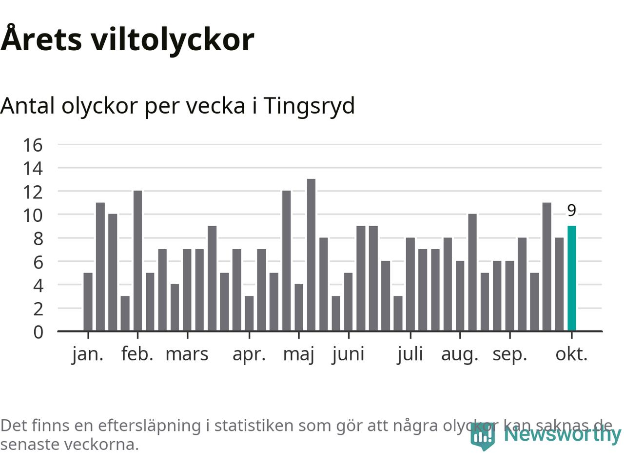 Hittills har nio viltolyckor rapporterats in i Tingsryds kommun från vecka 41. Se listan här.