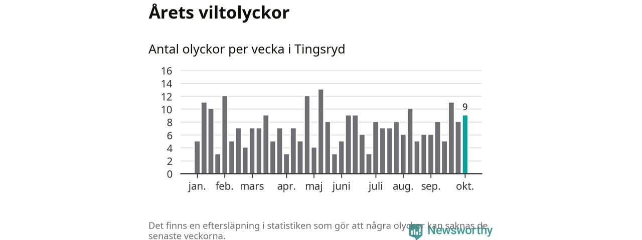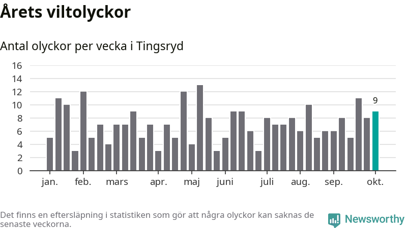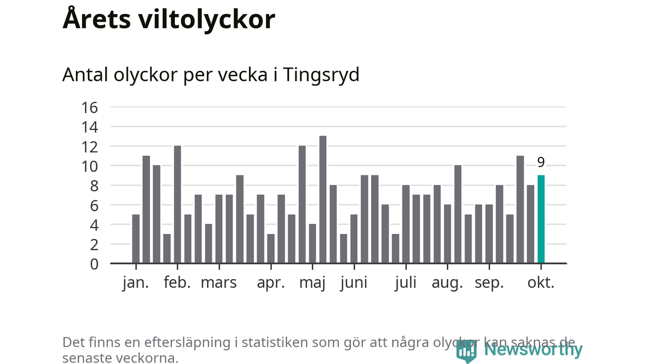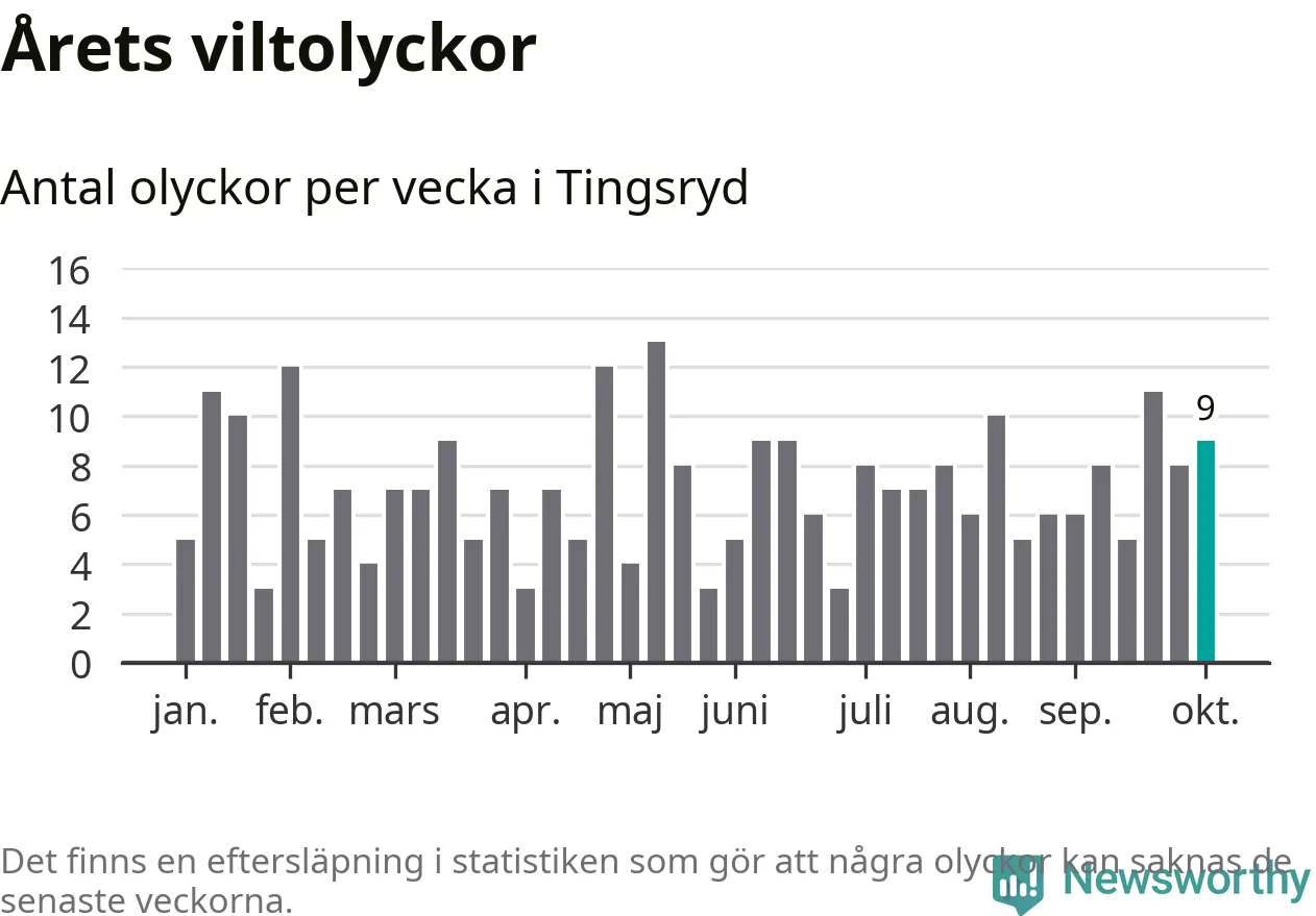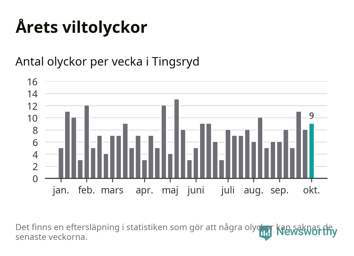 Hittills har nio viltolyckor rapporterats in i Tingsryds kommun från vecka 41. Se listan här.