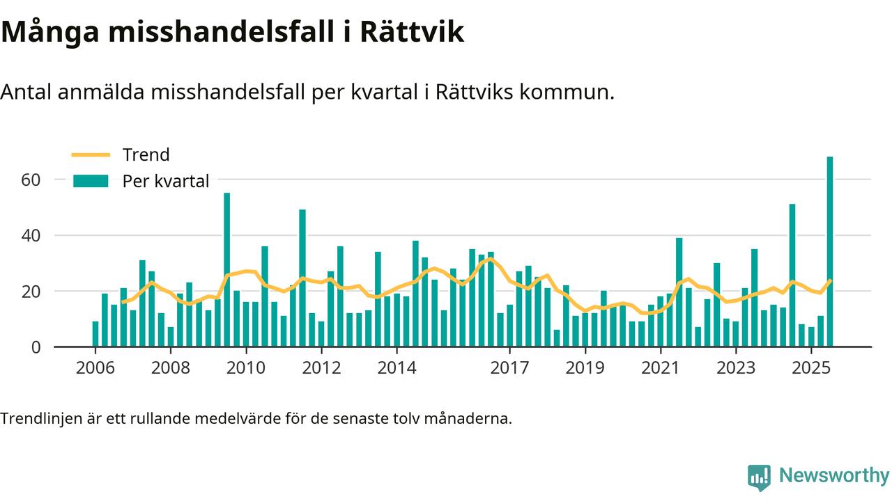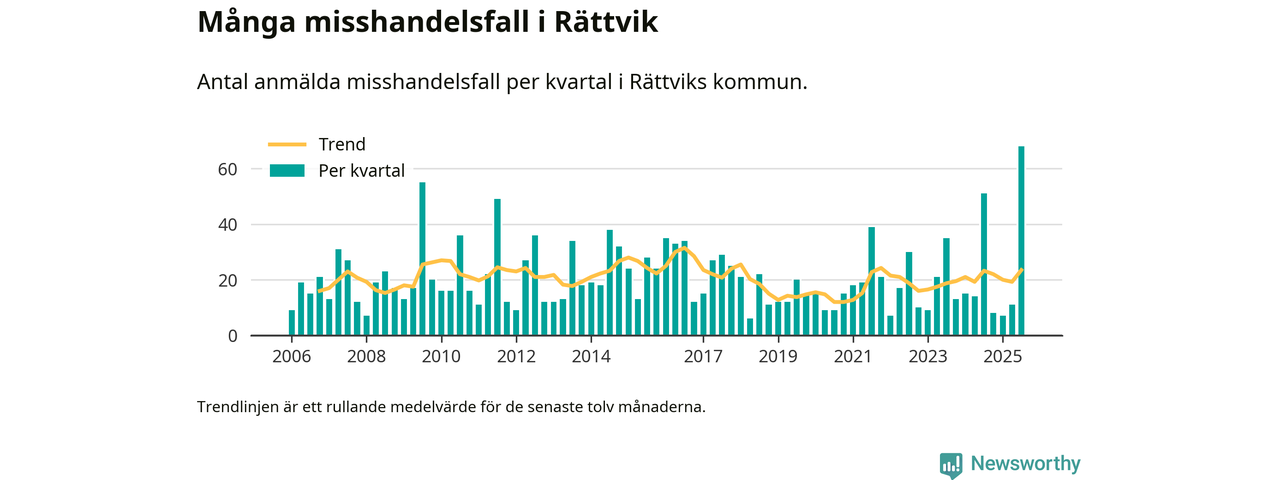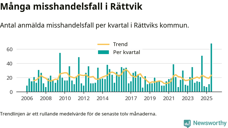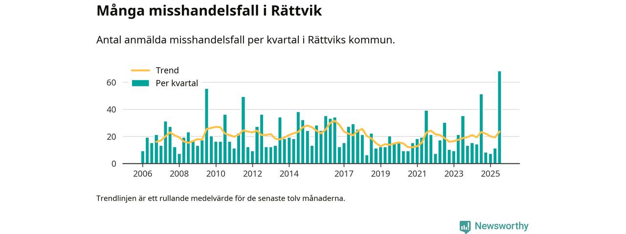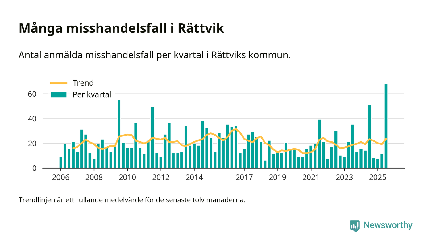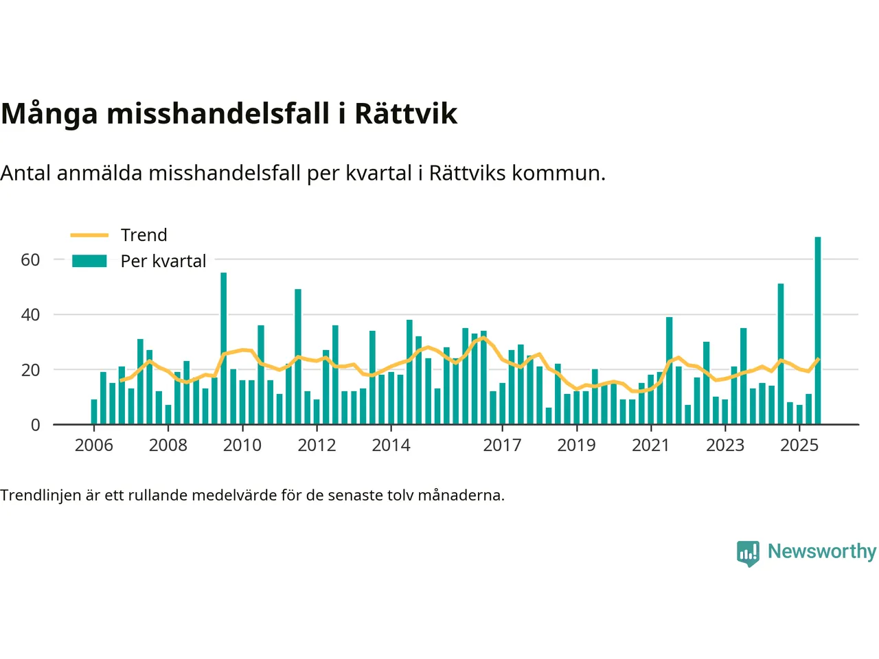 Det anmäldes sammanlagt 68 misshandelsfall i Rättviks kommun under tredje kvartalet 2025. Inte ett enda kvartal sedan 2006 har det anmälts så här många misshandelsfall i kommunen.