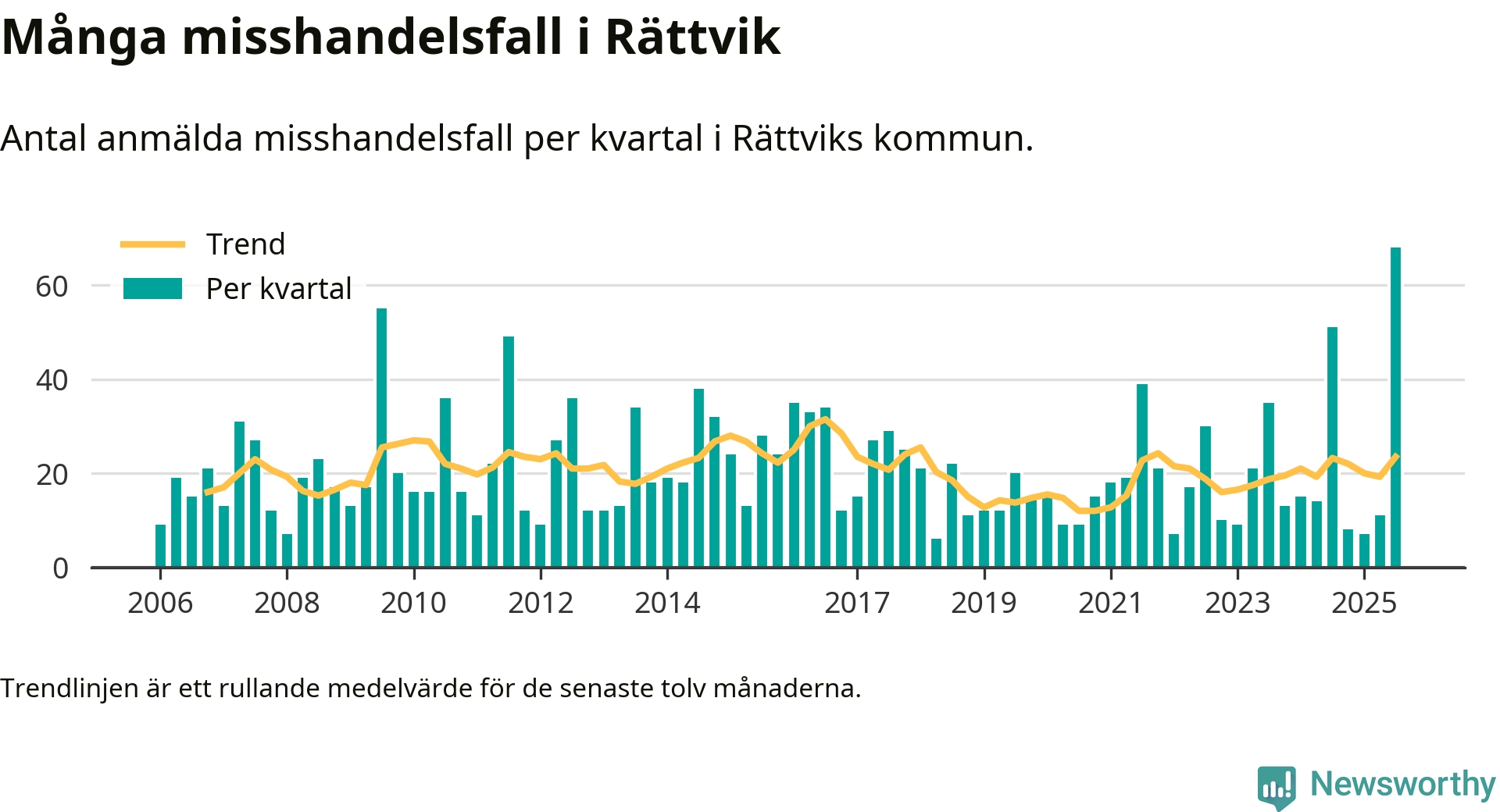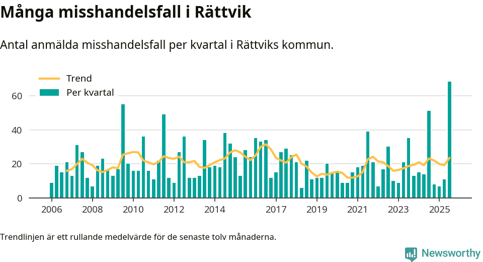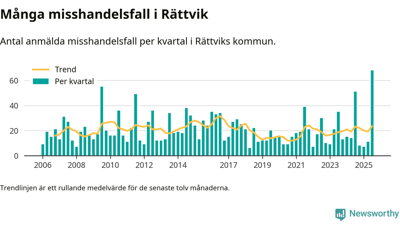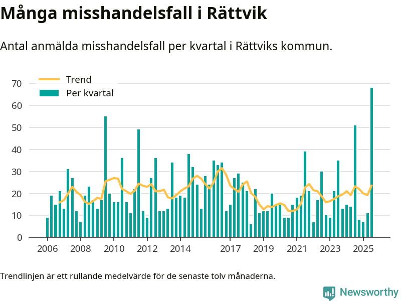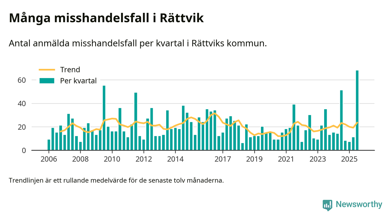 Det anmäldes sammanlagt 68 misshandelsfall i Rättviks kommun under tredje kvartalet 2025. Inte ett enda kvartal sedan 2006 har det anmälts så här många misshandelsfall i kommunen.