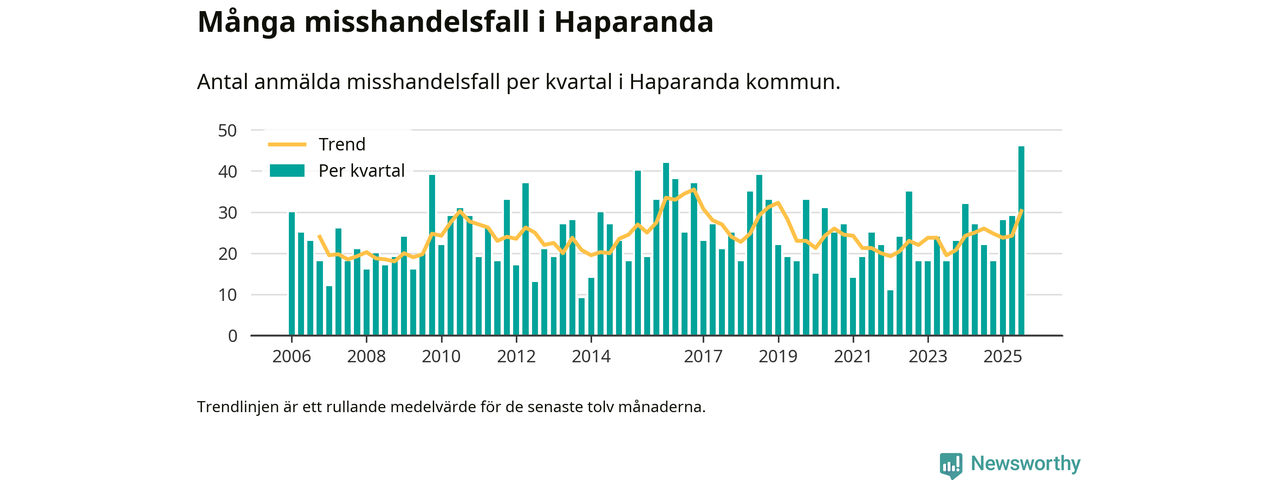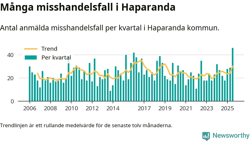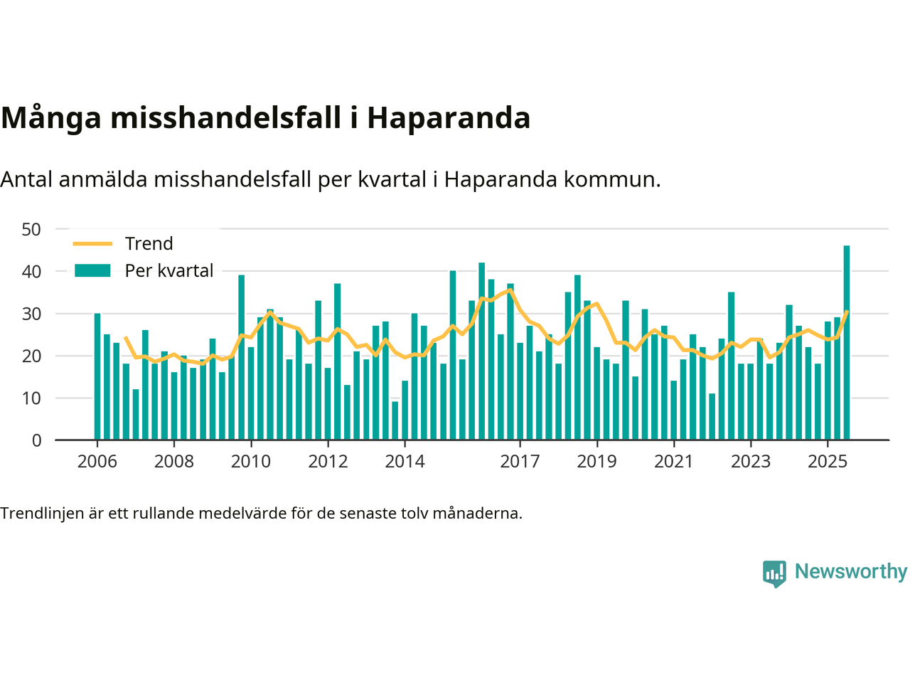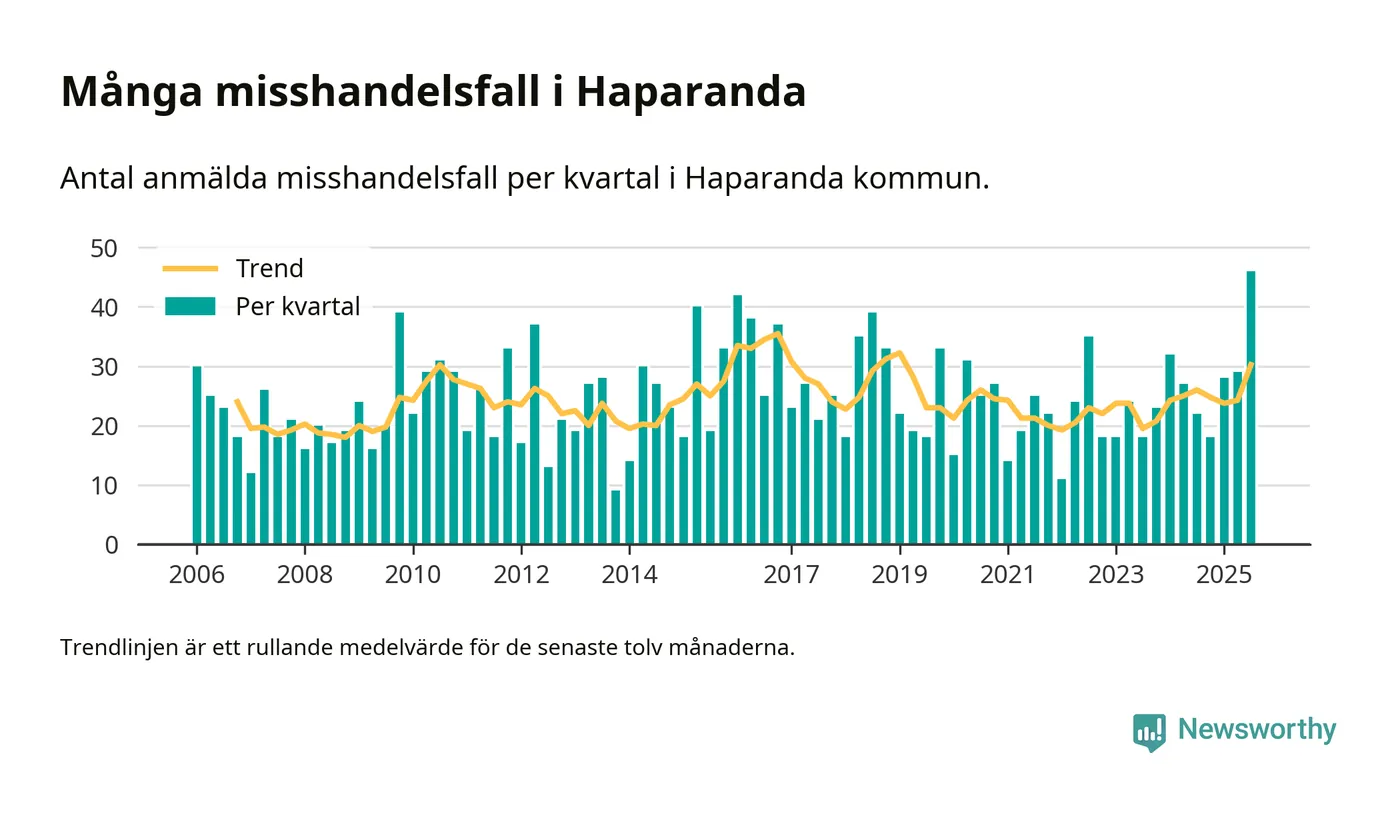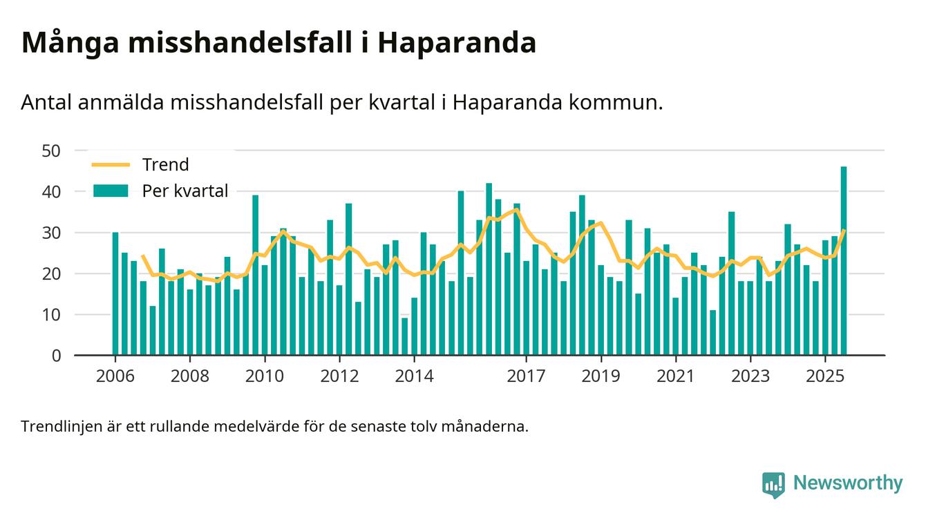 Det anmäldes sammanlagt 46 misshandelsfall i Haparanda kommun under tredje kvartalet 2025. Inte ett enda kvartal sedan 2006 har det anmälts så här många misshandelsfall i kommunen.