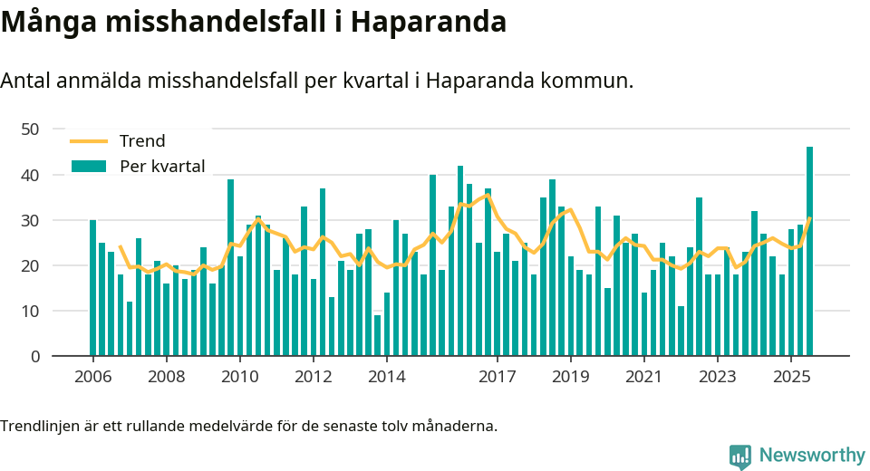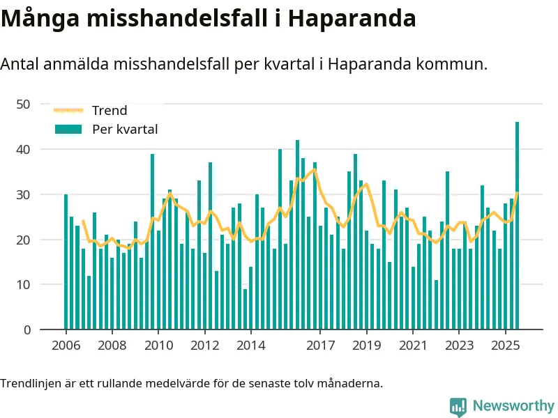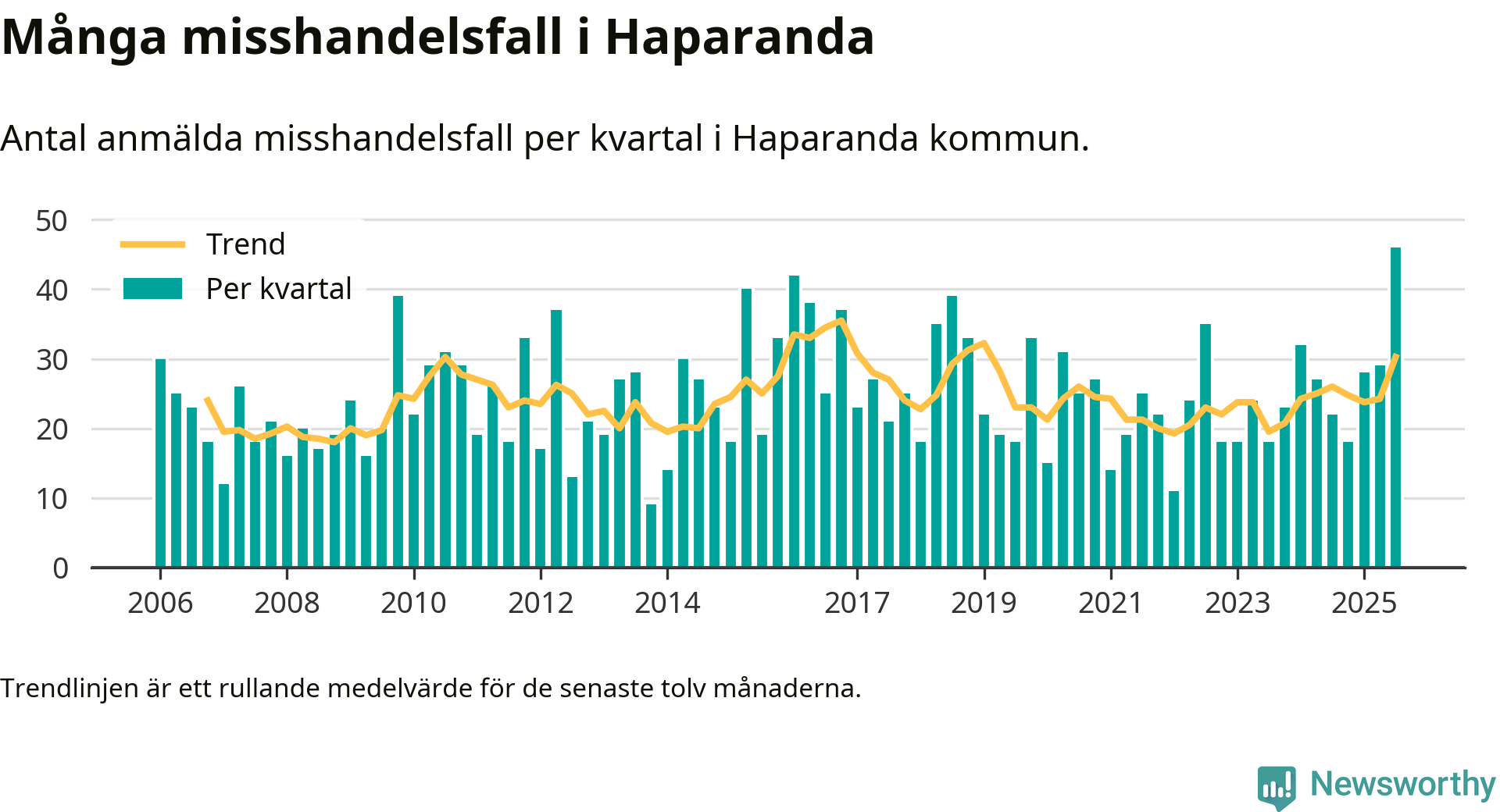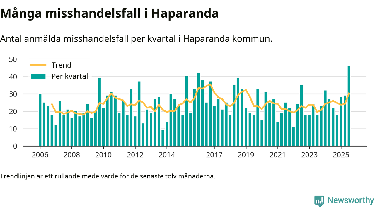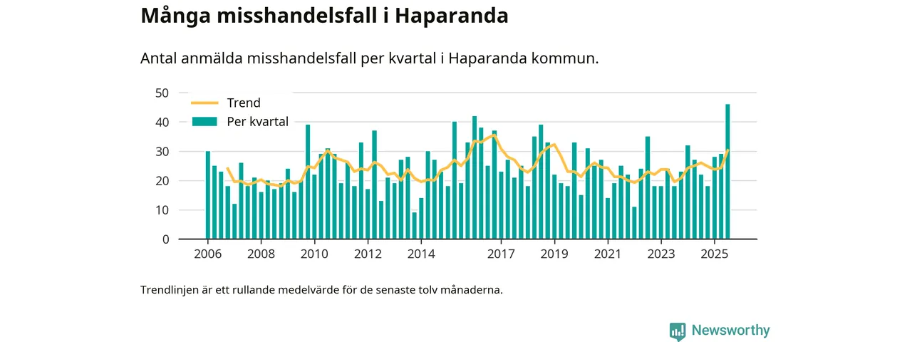 Det anmäldes sammanlagt 46 misshandelsfall i Haparanda kommun under tredje kvartalet 2025. Inte ett enda kvartal sedan 2006 har det anmälts så här många misshandelsfall i kommunen.