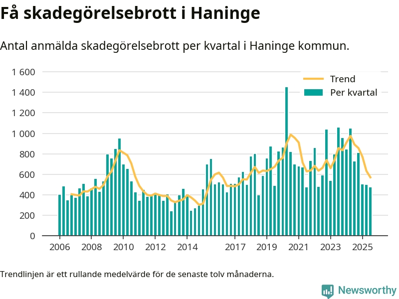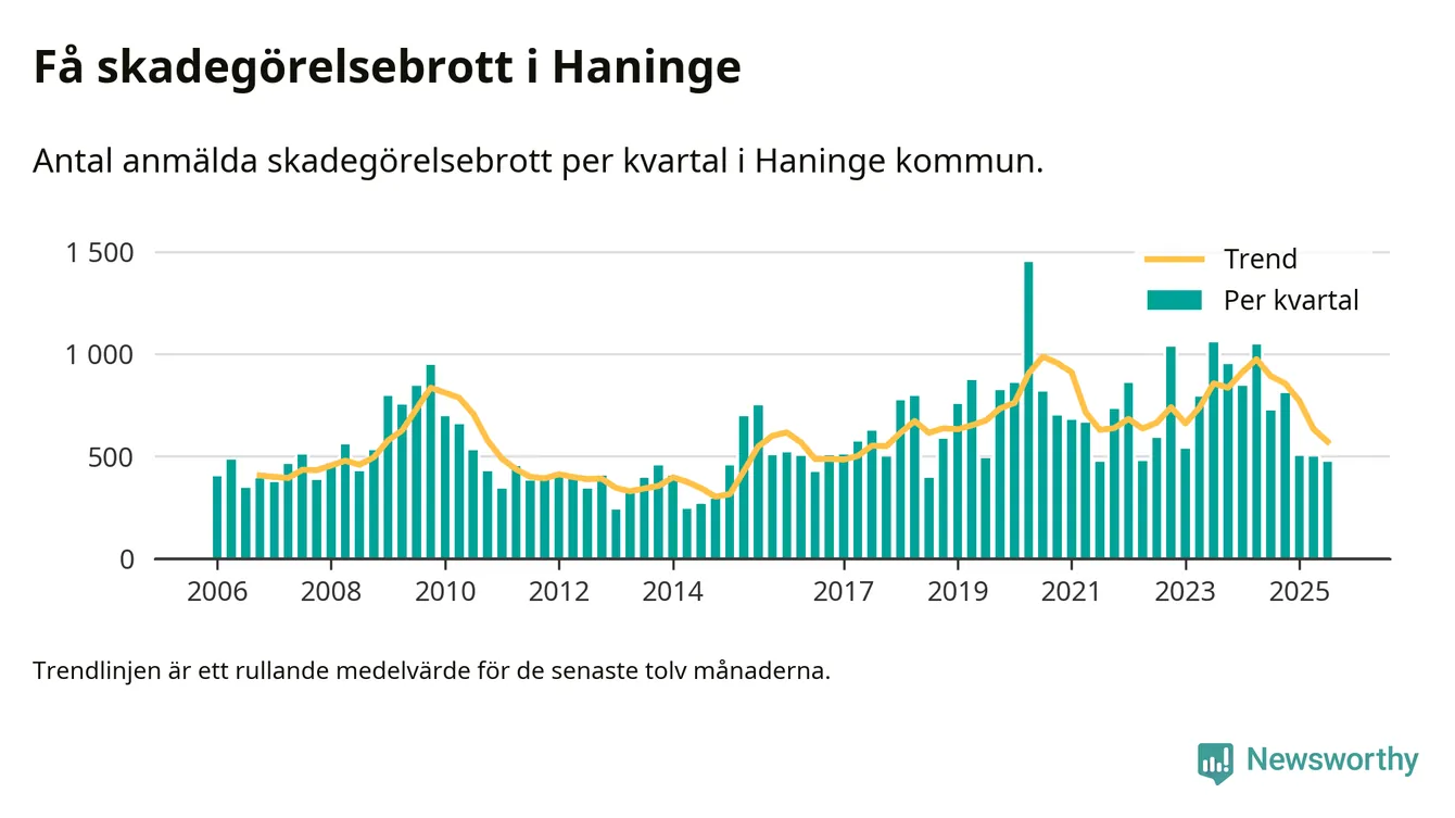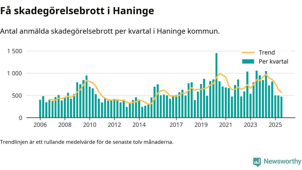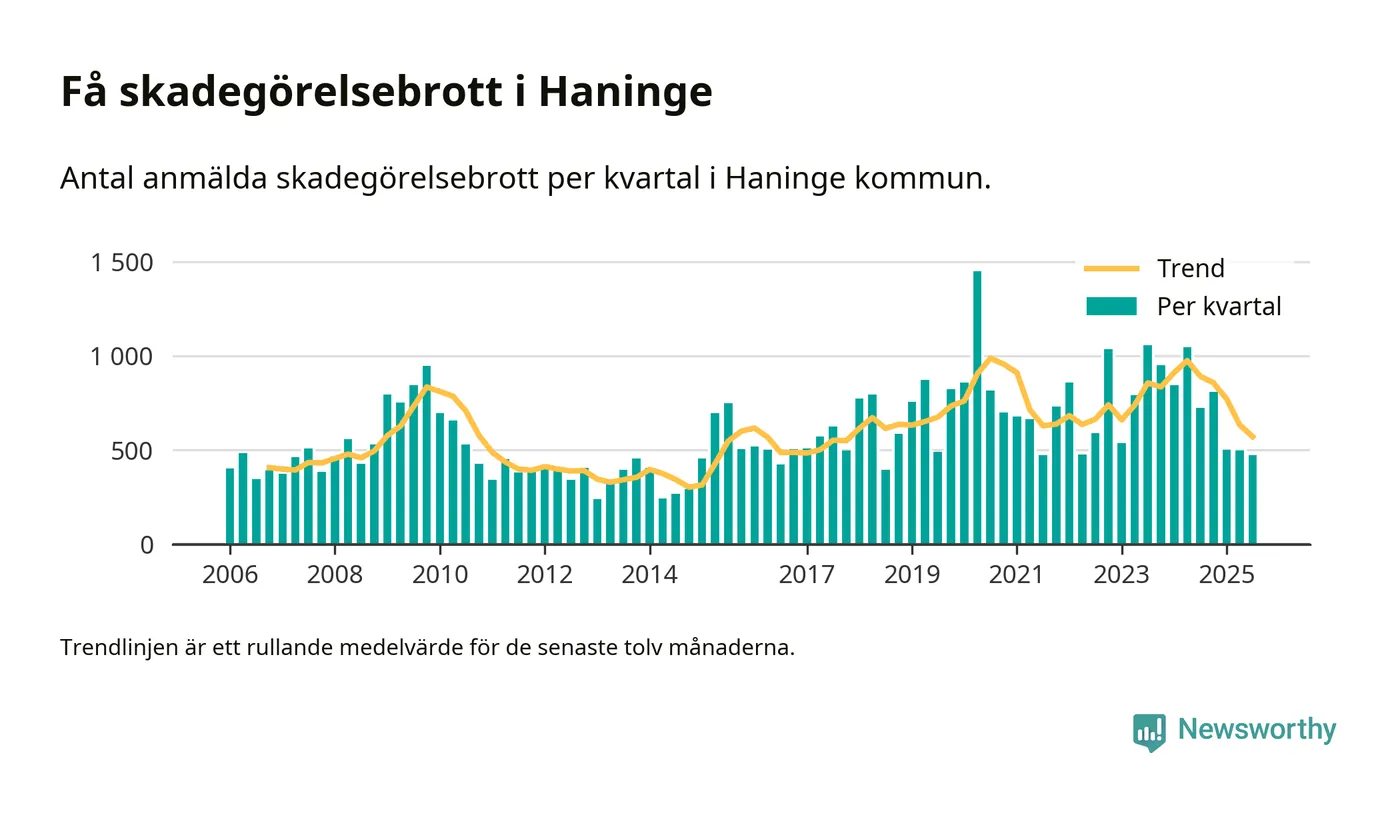 I snitt har det sedan 2006 anmälts 587 skadegörelsebrott per kvartal i Haninge kommun. Flest anmälningar under ett enskilt kvartal noterades det andra kvartalet 2020 (1 449 stycken).