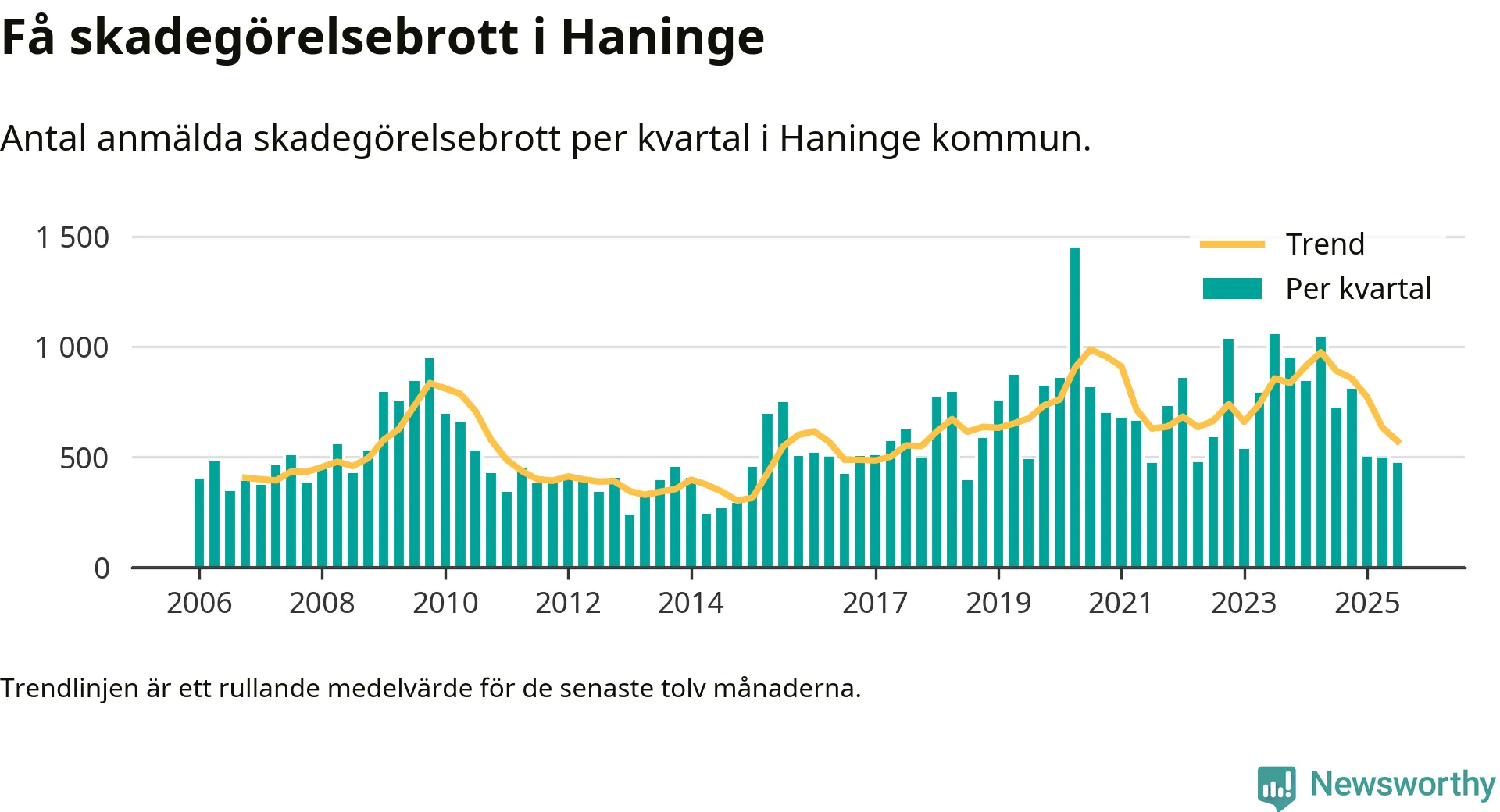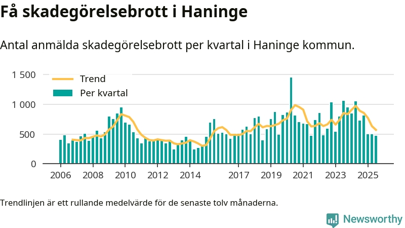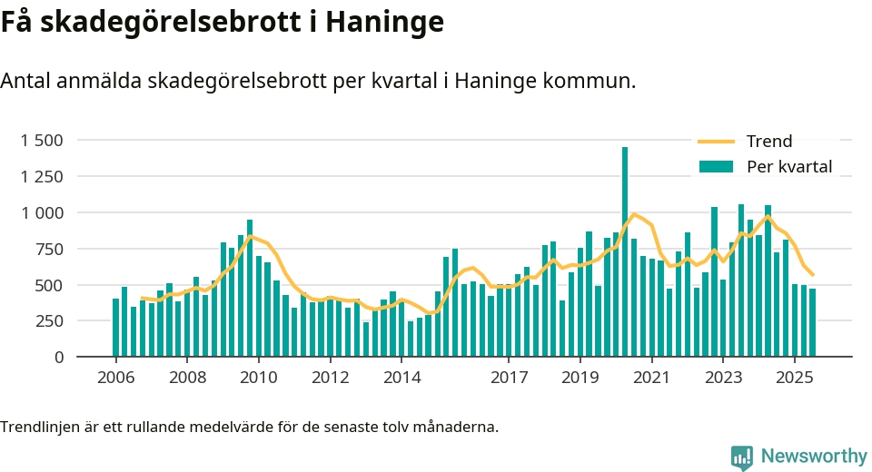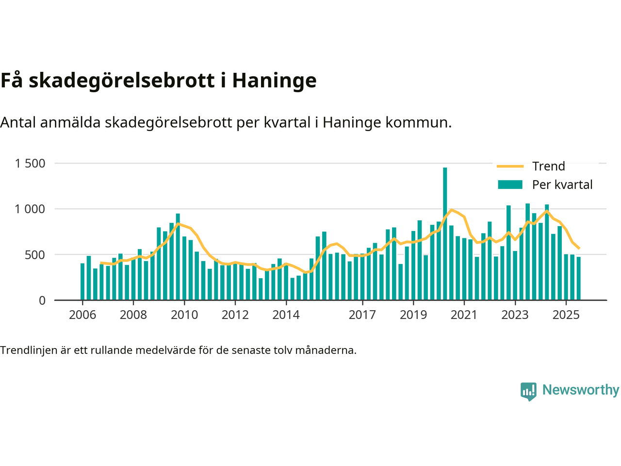 I snitt har det sedan 2006 anmälts 587 skadegörelsebrott per kvartal i Haninge kommun. Flest anmälningar under ett enskilt kvartal noterades det andra kvartalet 2020 (1 449 stycken).