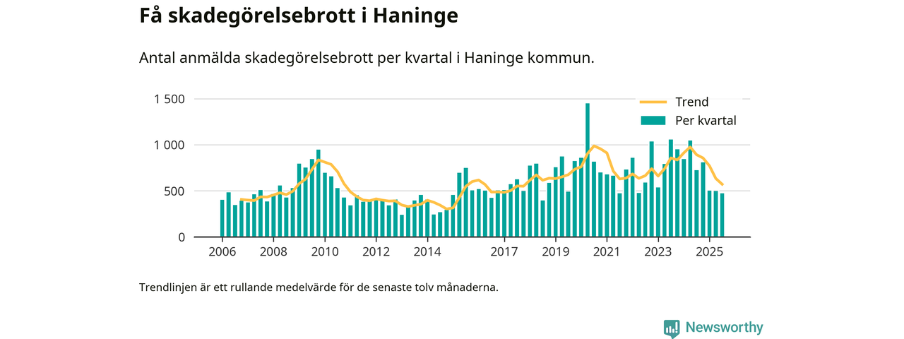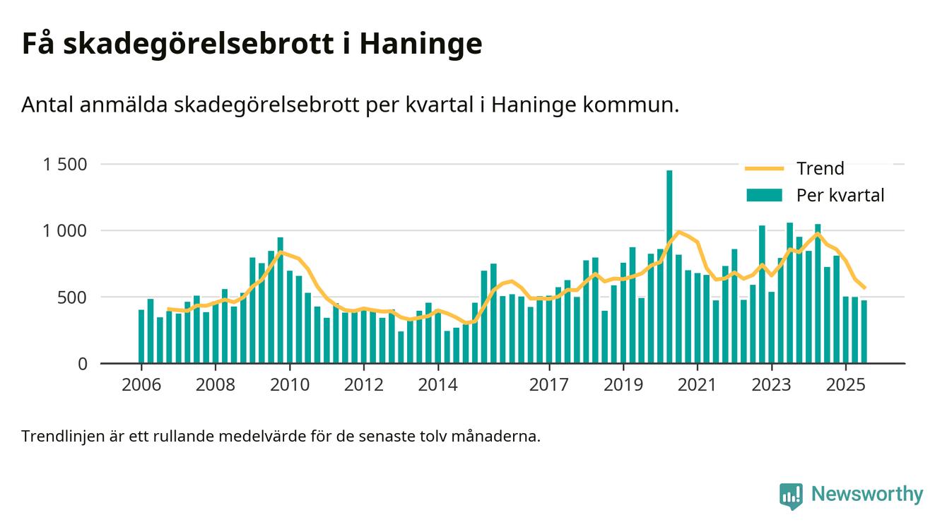 Det anmäldes sammanlagt 473 skadegörelsebrott i Haninge kommun under tredje kvartalet 2025. Vi får gå tillbaka till tredje kvartalet 2018 för att hitta ett kvartal då det anmäldes lika få skadegörelsebrott i kommunen.