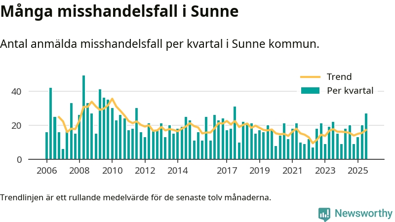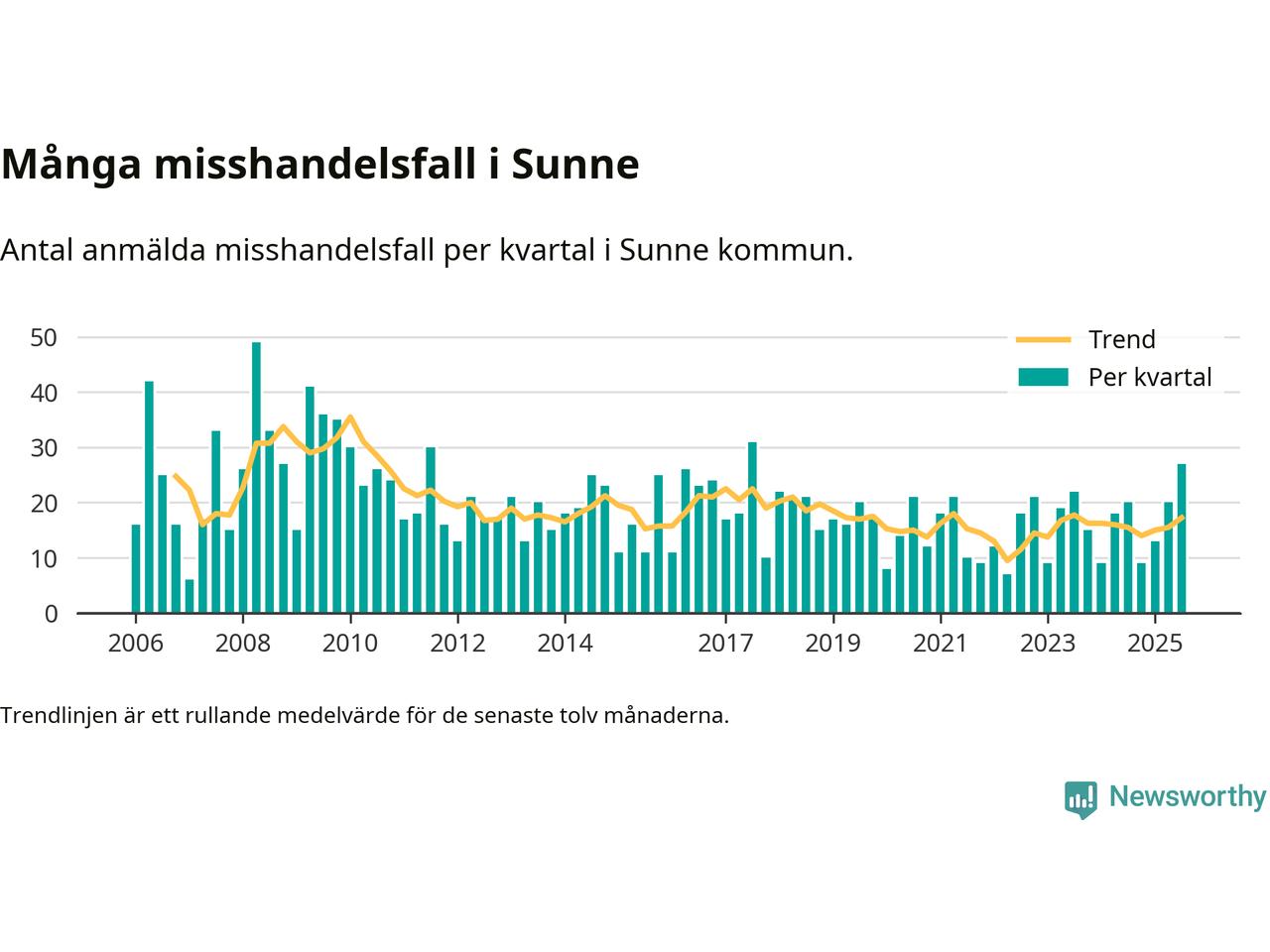 I snitt har det sedan 2006 anmälts 20 misshandelsfall per kvartal i Sunne kommun. Flest anmälningar under ett enskilt kvartal noterades det andra kvartalet 2008 (49 stycken).
