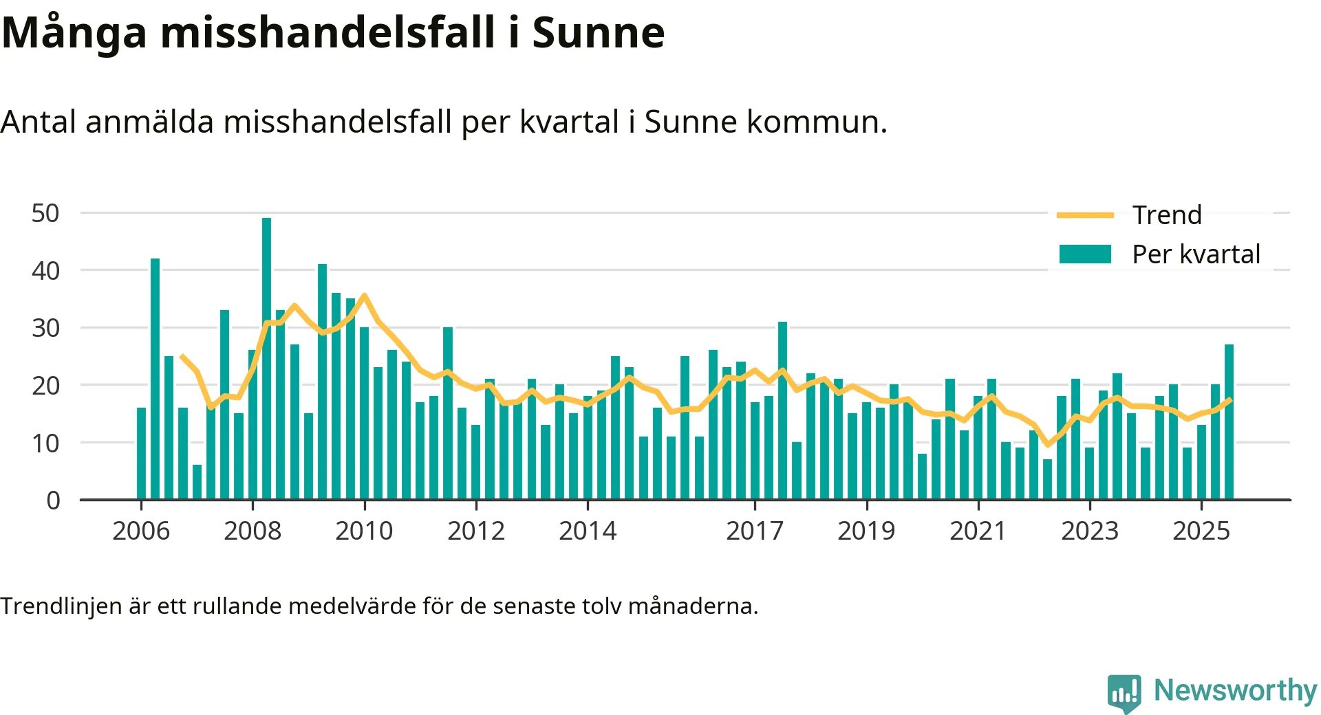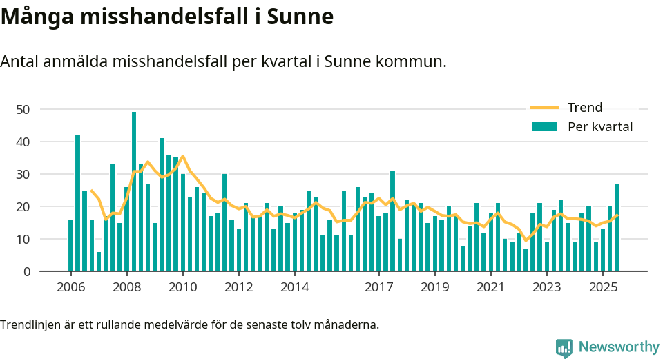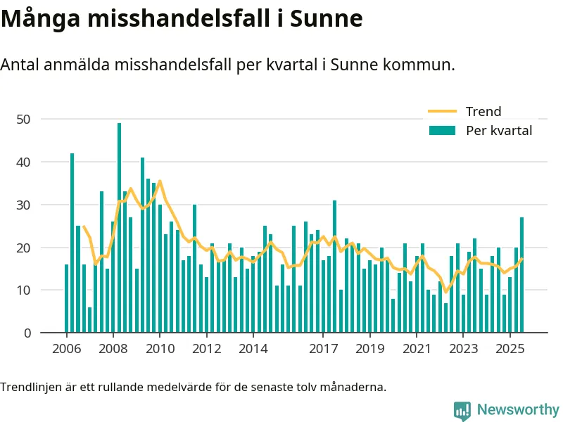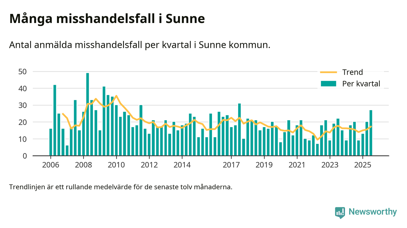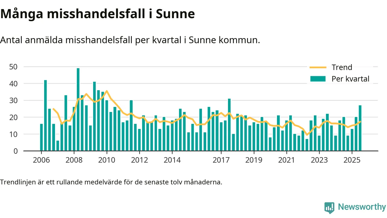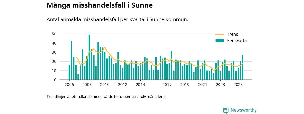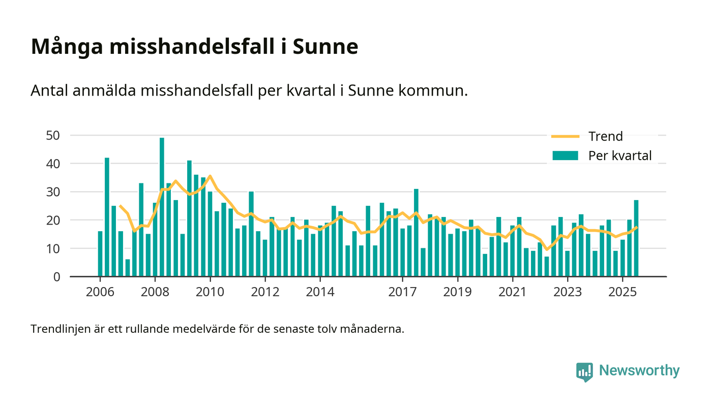 Det anmäldes sammanlagt 27 misshandelsfall i Sunne kommun under tredje kvartalet 2025. Vi får gå tillbaka till tredje kvartalet 2017 för att hitta ett kvartal då det anmäldes lika många misshandelsfall i kommunen.