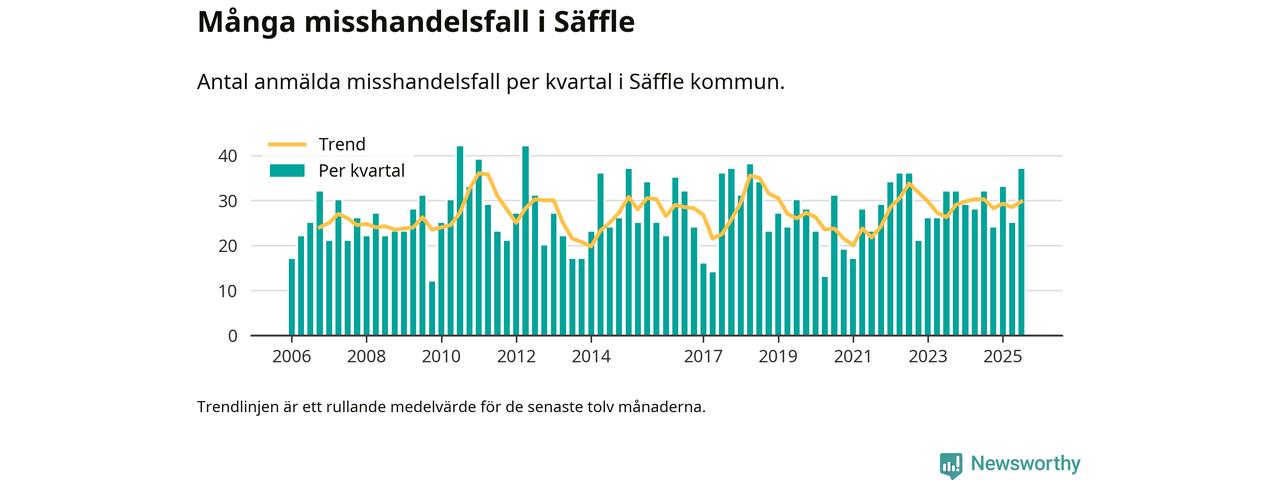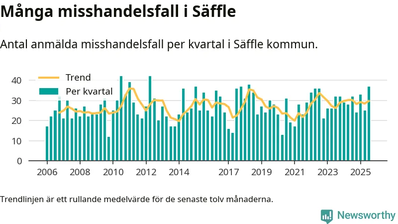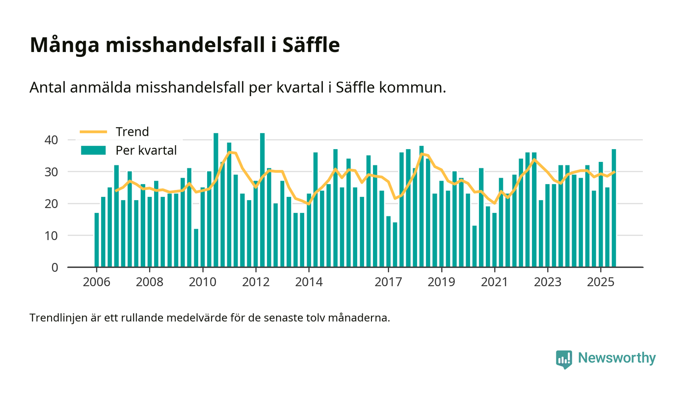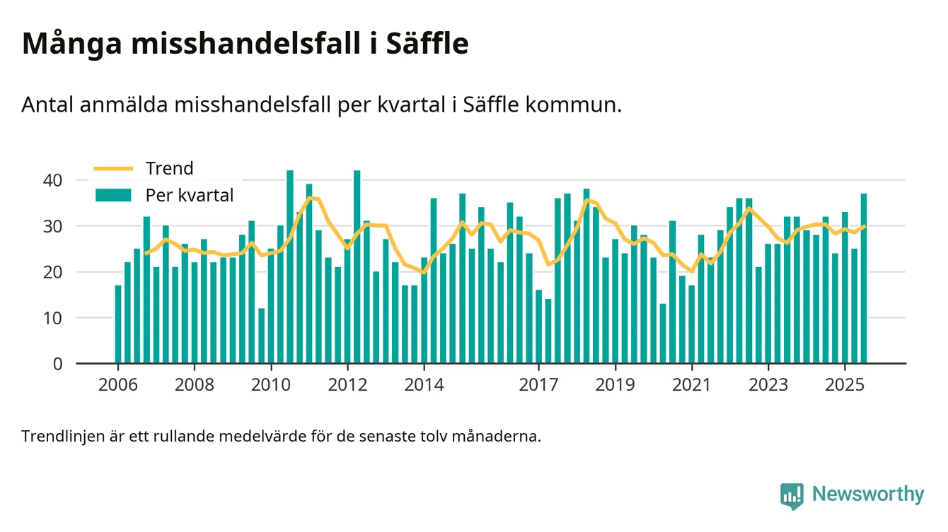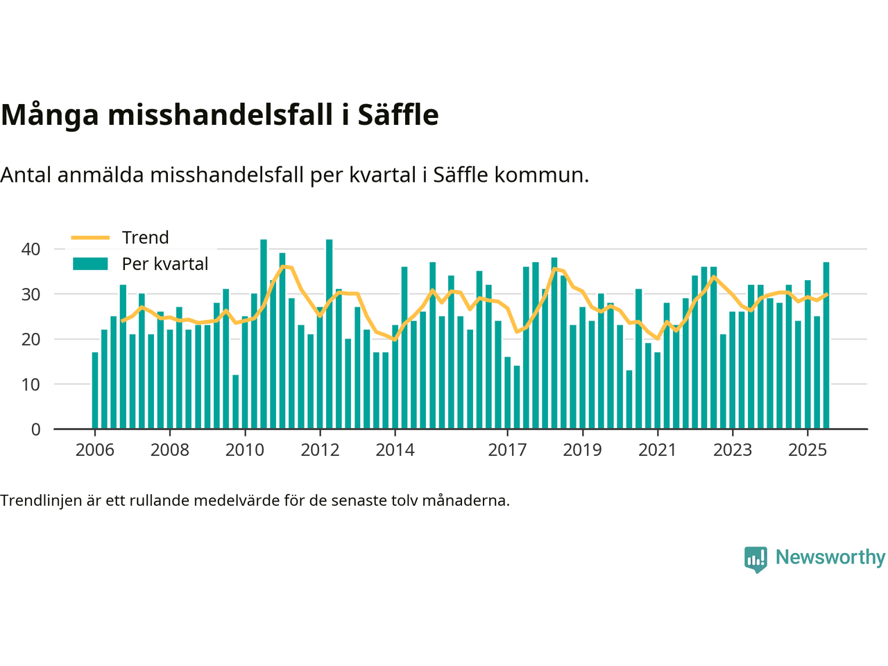 Det anmäldes sammanlagt 37 misshandelsfall i Säffle kommun under tredje kvartalet 2025. Vi får gå tillbaka till andra kvartalet 2018 för att hitta ett kvartal då det anmäldes lika många misshandelsfall i kommunen.