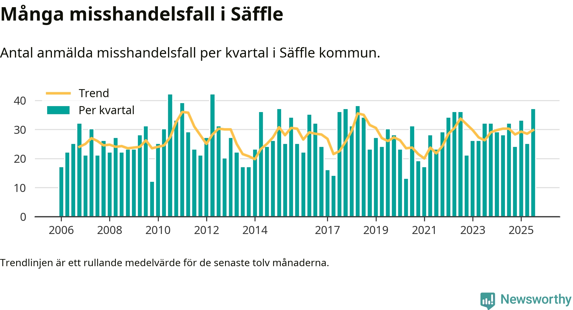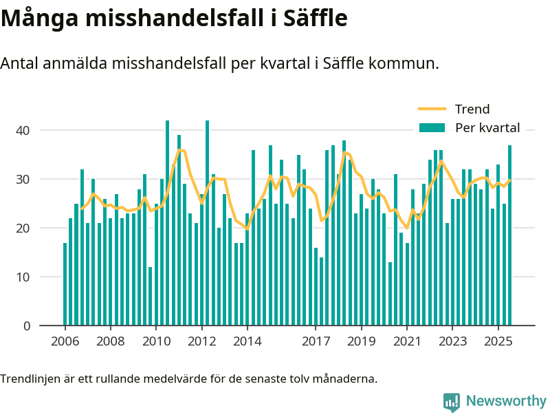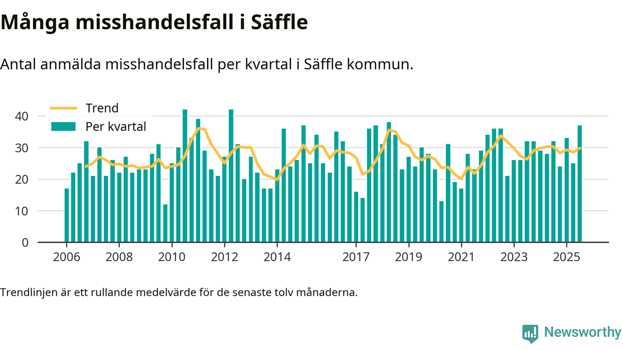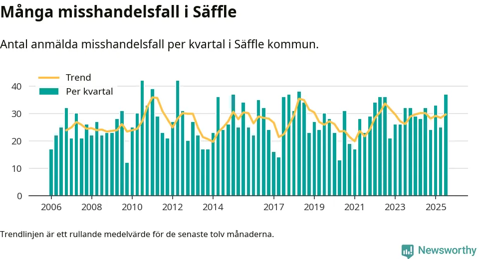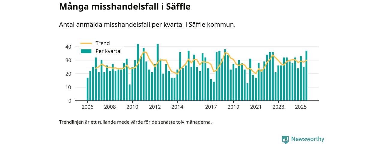 Det anmäldes sammanlagt 37 misshandelsfall i Säffle kommun under tredje kvartalet 2025. Vi får gå tillbaka till andra kvartalet 2018 för att hitta ett kvartal då det anmäldes lika många misshandelsfall i kommunen.