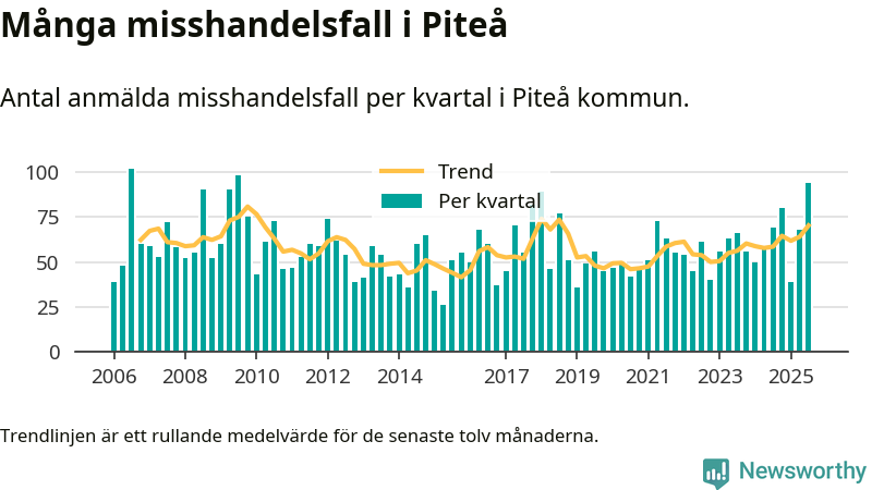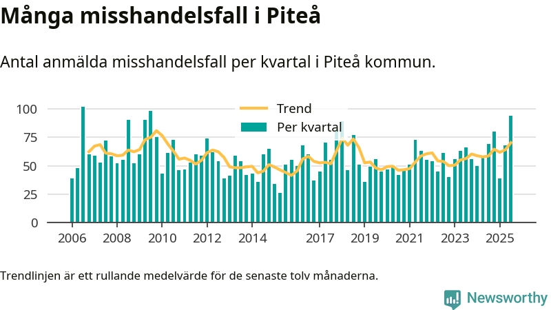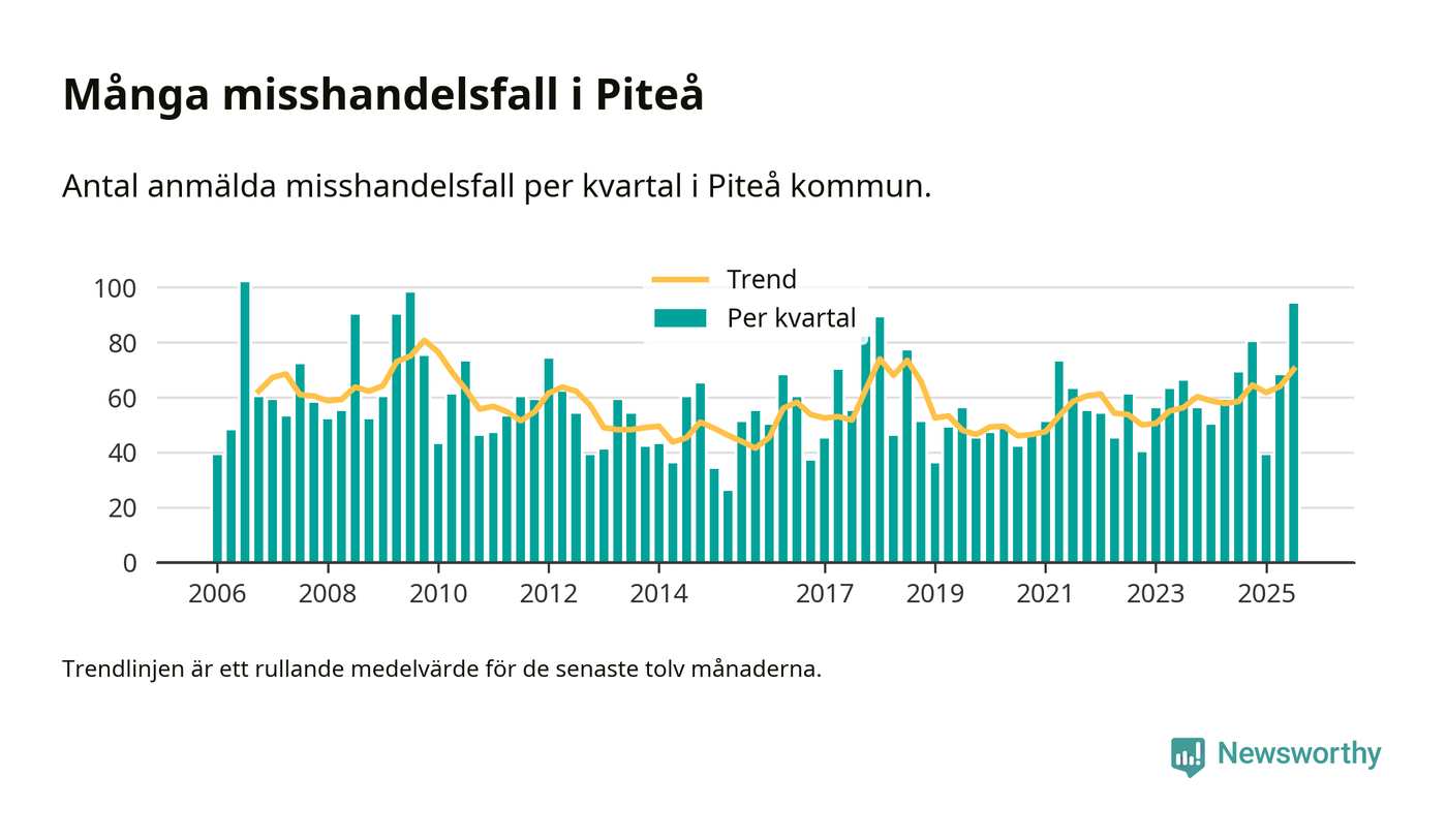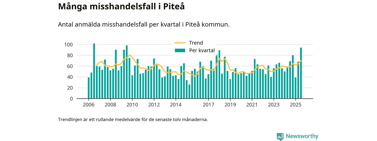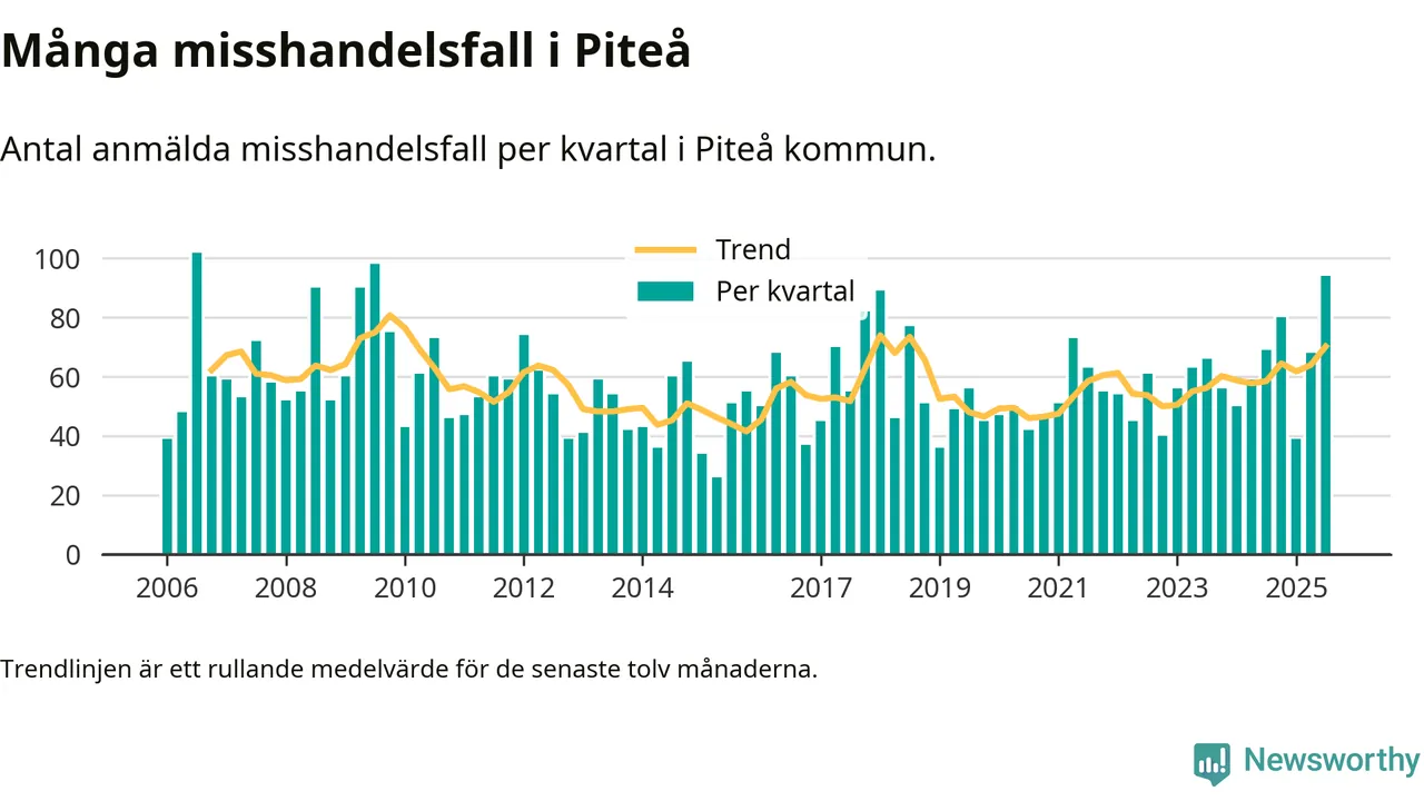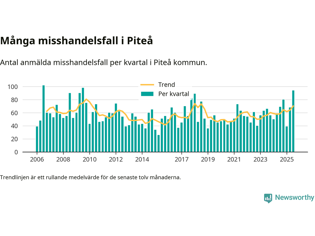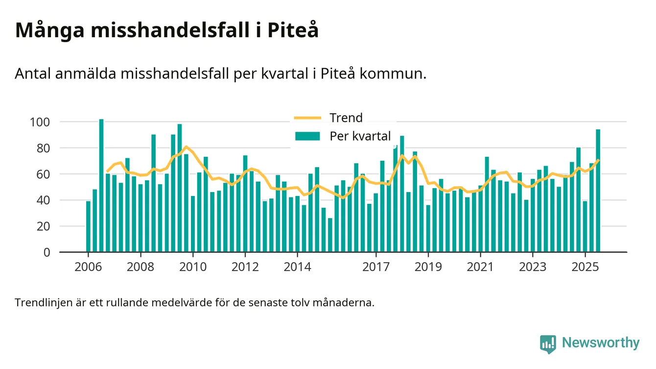 Det anmäldes sammanlagt 94 misshandelsfall i Piteå kommun under tredje kvartalet 2025. Vi får gå tillbaka till tredje kvartalet 2009 för att hitta ett kvartal då det anmäldes lika många misshandelsfall i kommunen.