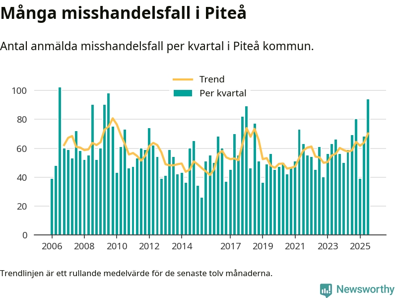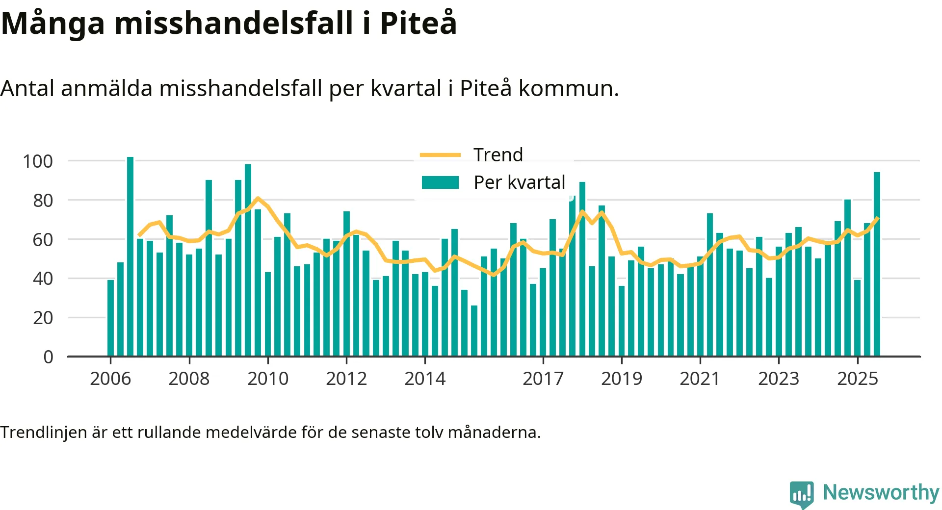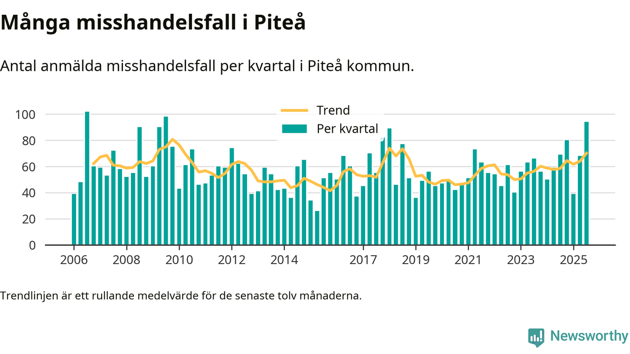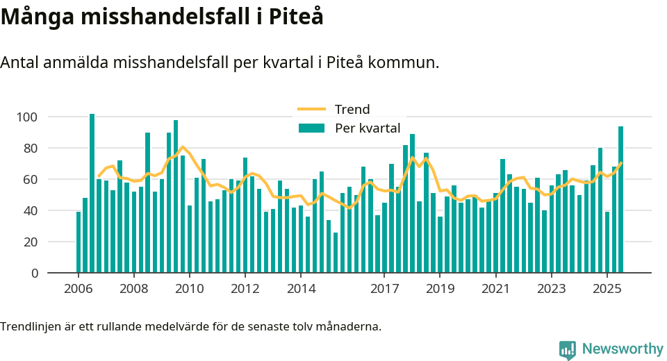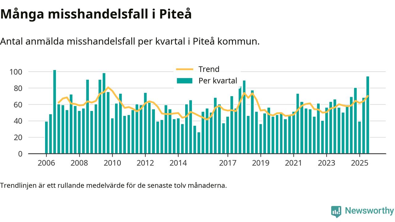 I snitt har det sedan 2006 anmälts 58 misshandelsfall per kvartal i Piteå kommun. Flest anmälningar under ett enskilt kvartal noterades det tredje kvartalet 2006 (102 stycken).