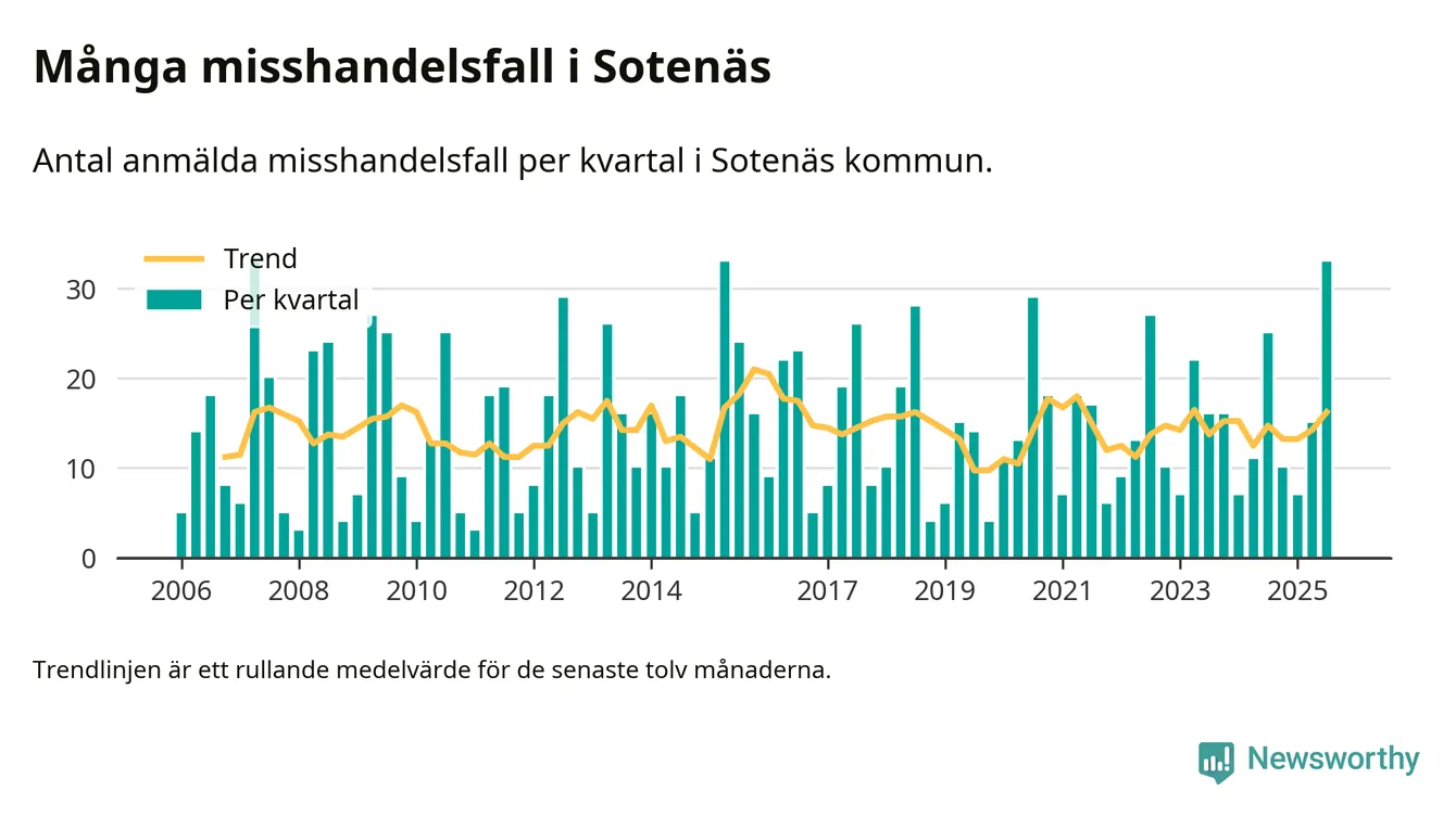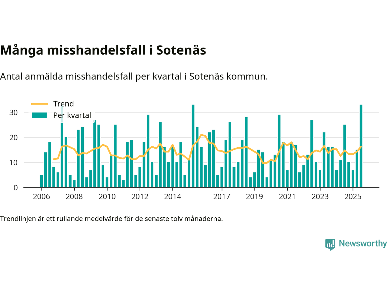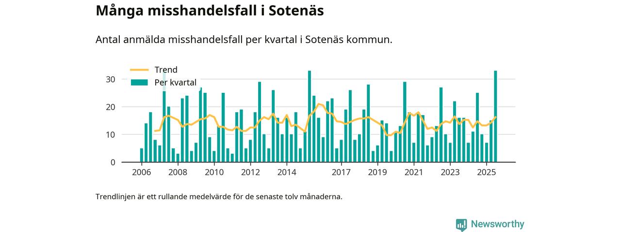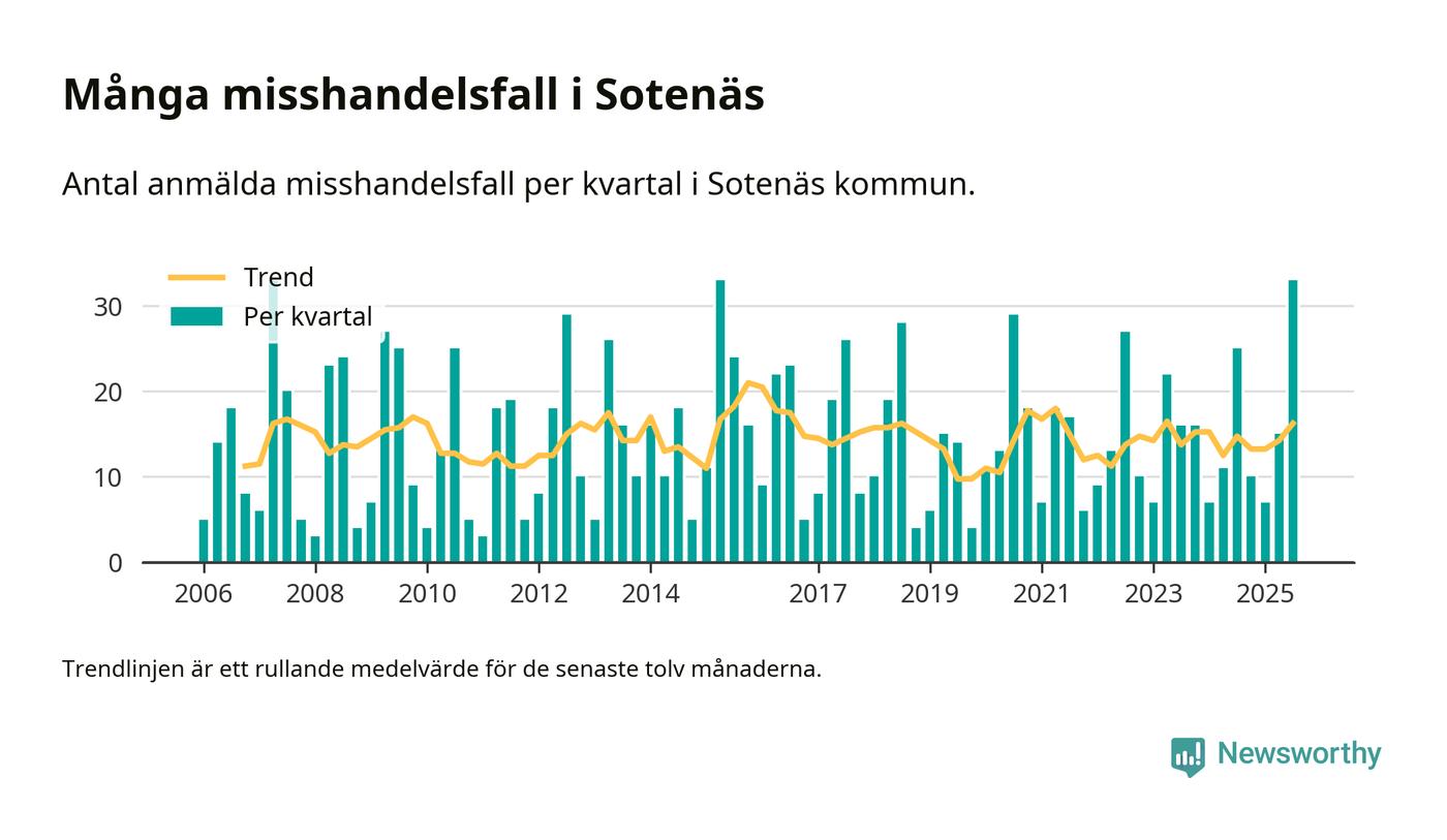 Det anmäldes sammanlagt 33 misshandelsfall i Sotenäs kommun under tredje kvartalet 2025. Vi får gå tillbaka till andra kvartalet 2015 för att hitta ett kvartal då det anmäldes lika många misshandelsfall i kommunen.