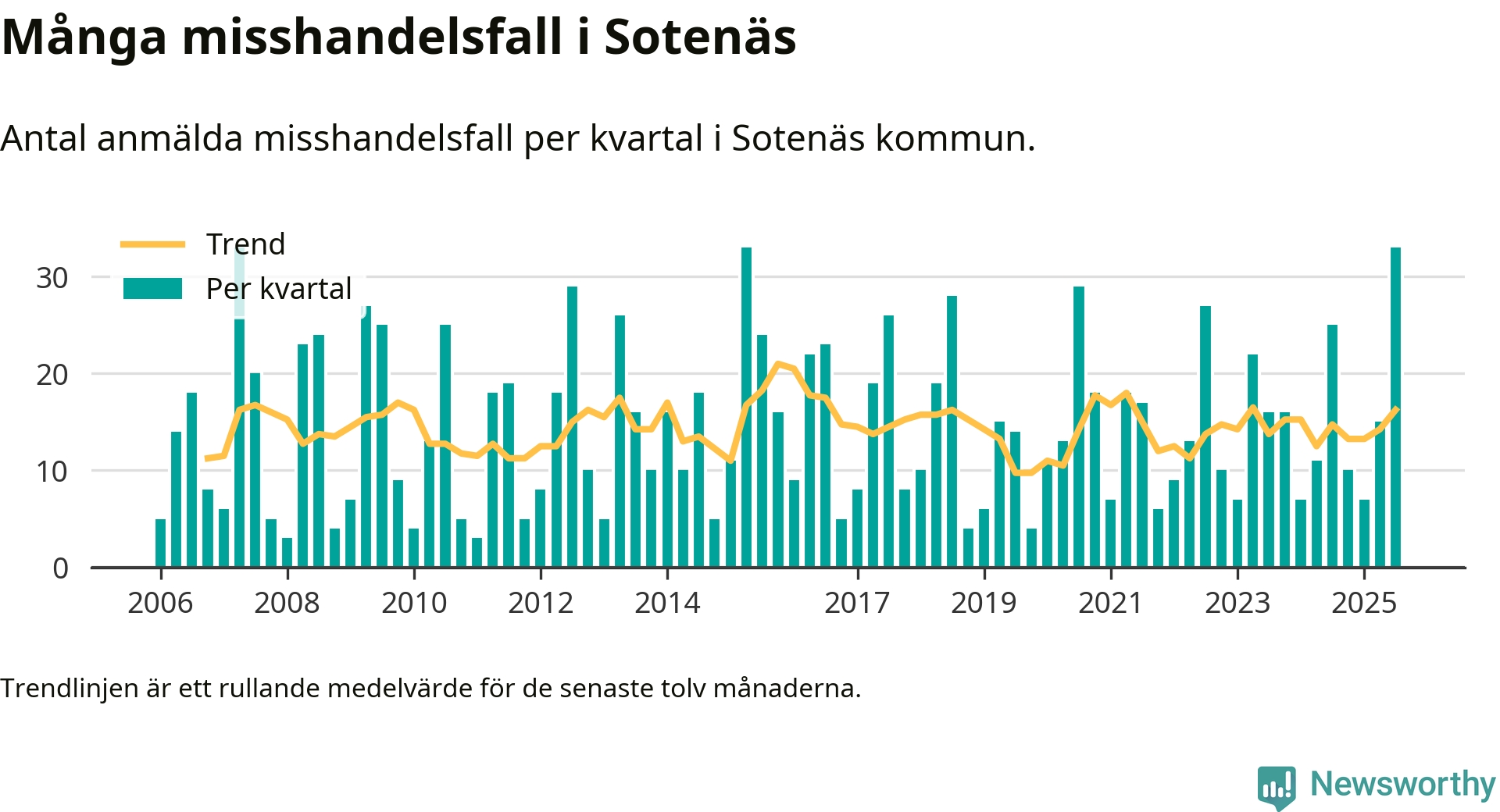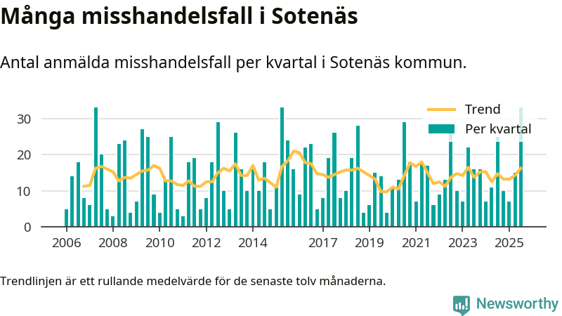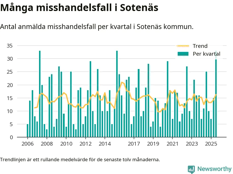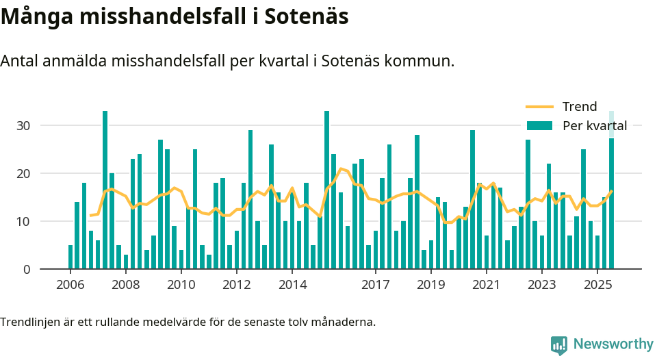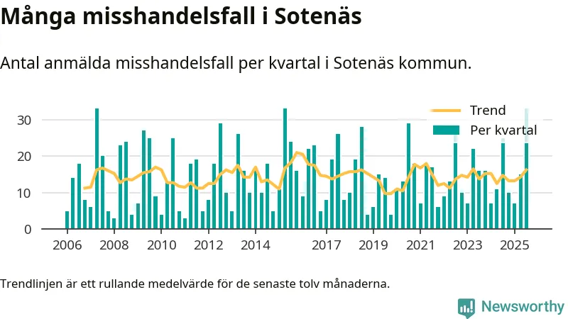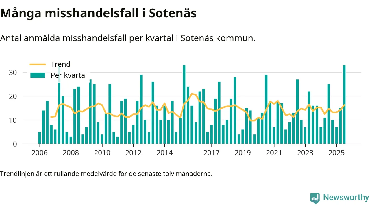 Det anmäldes sammanlagt 33 misshandelsfall i Sotenäs kommun under tredje kvartalet 2025. Vi får gå tillbaka till andra kvartalet 2015 för att hitta ett kvartal då det anmäldes lika många misshandelsfall i kommunen.