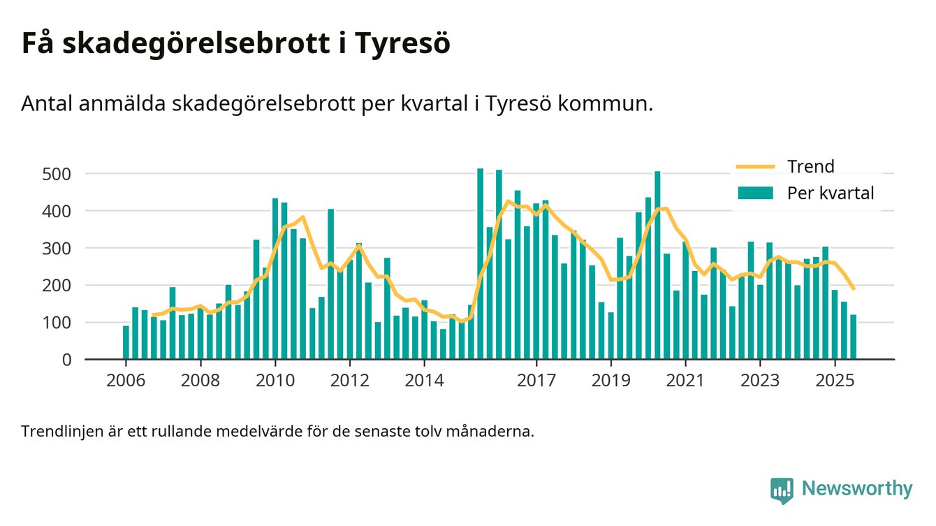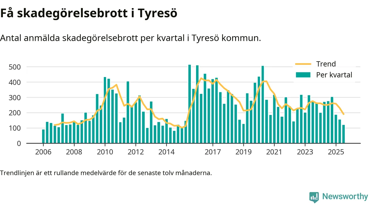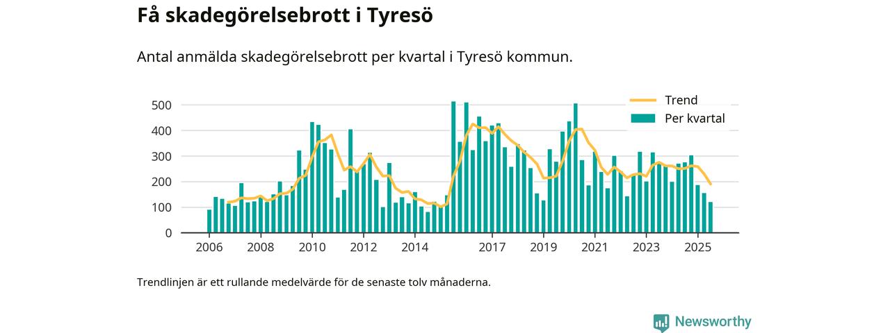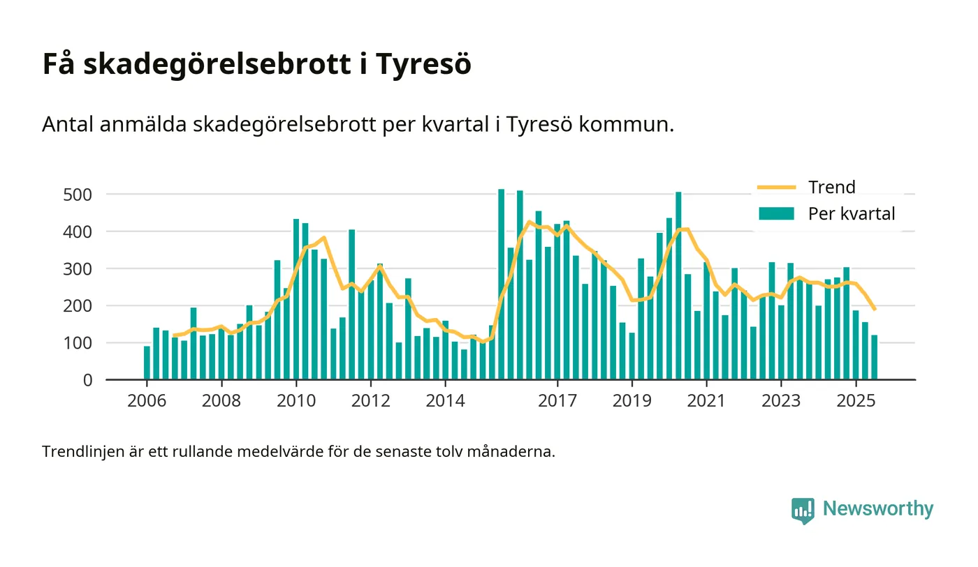 Det anmäldes sammanlagt 120 skadegörelsebrott i Tyresö kommun under tredje kvartalet 2025. Vi får gå tillbaka till första kvartalet 2015 för att hitta ett kvartal då det anmäldes lika få skadegörelsebrott i kommunen.