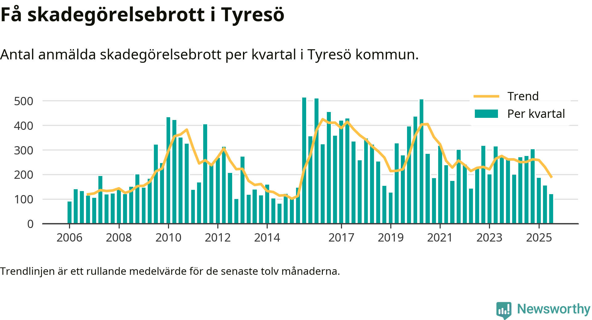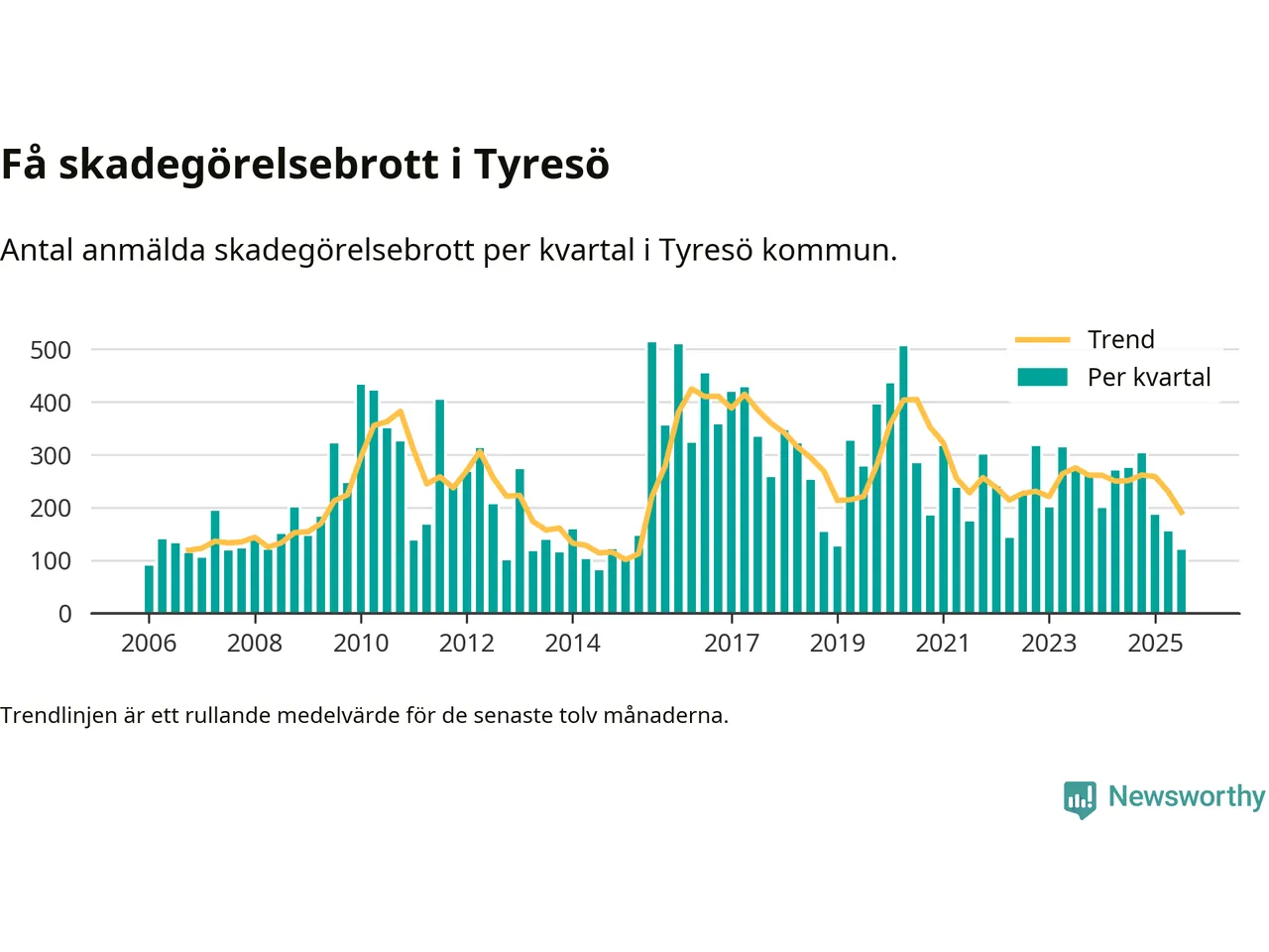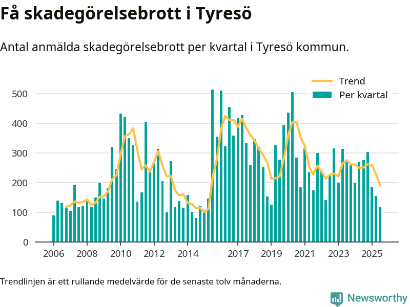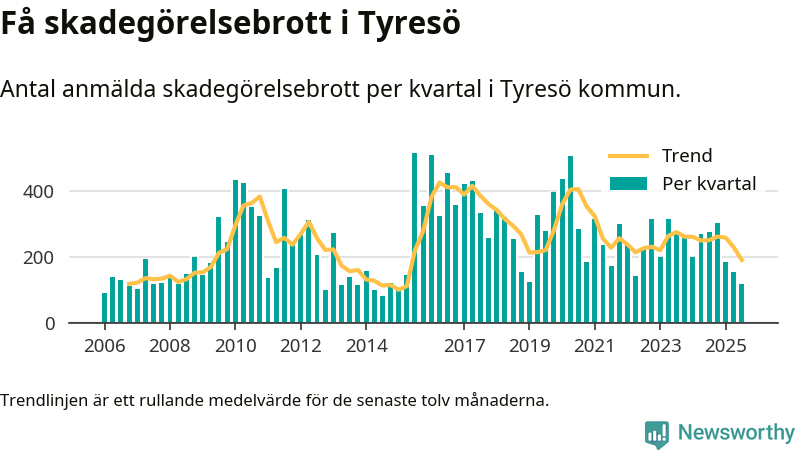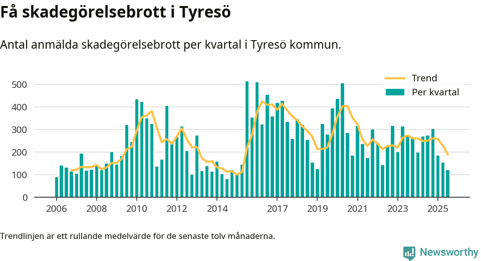 Det anmäldes sammanlagt 120 skadegörelsebrott i Tyresö kommun under tredje kvartalet 2025. Vi får gå tillbaka till första kvartalet 2015 för att hitta ett kvartal då det anmäldes lika få skadegörelsebrott i kommunen.