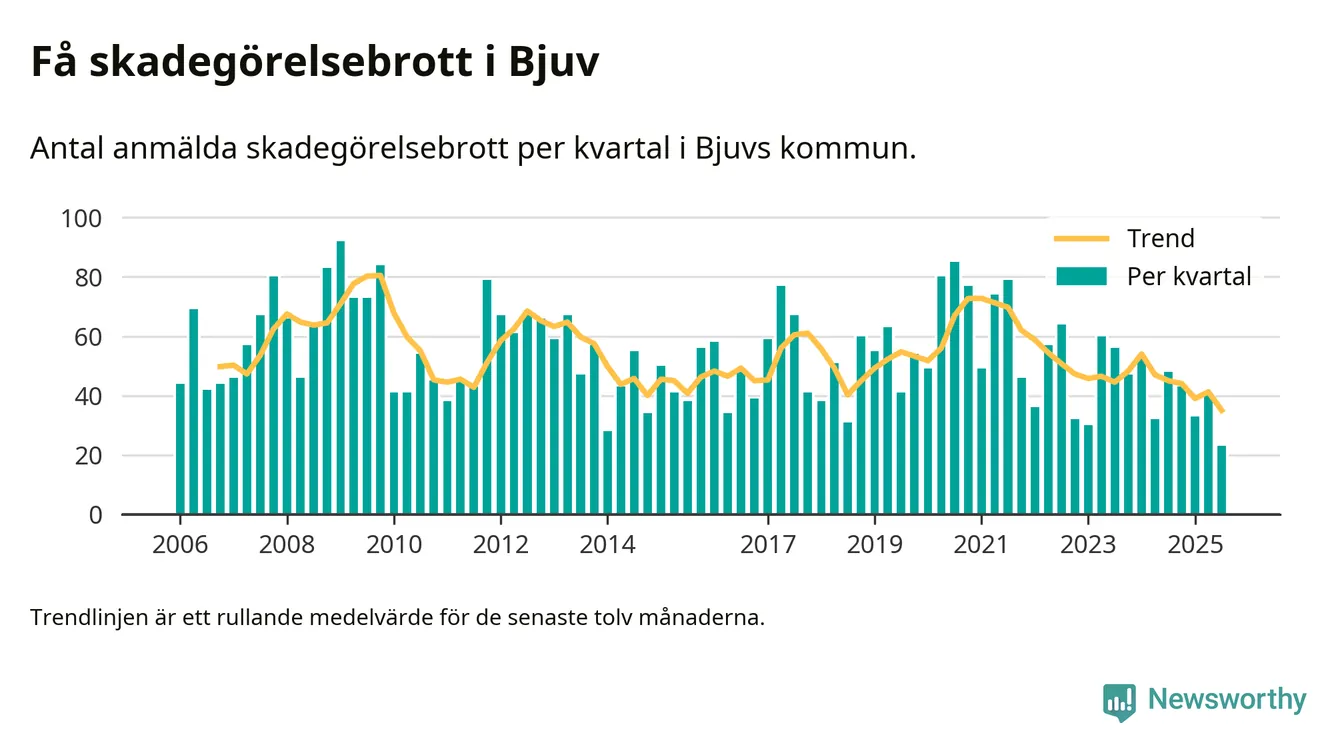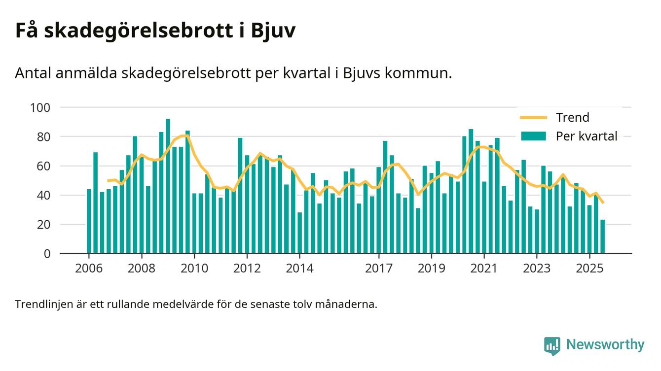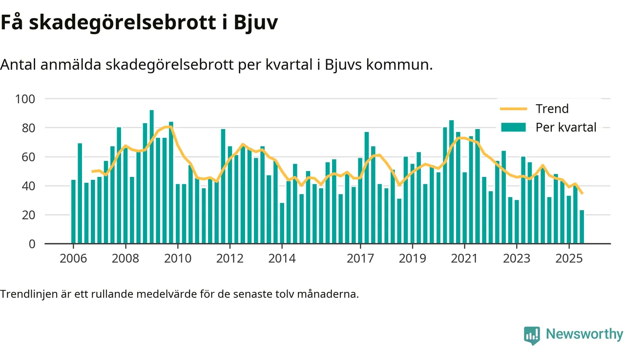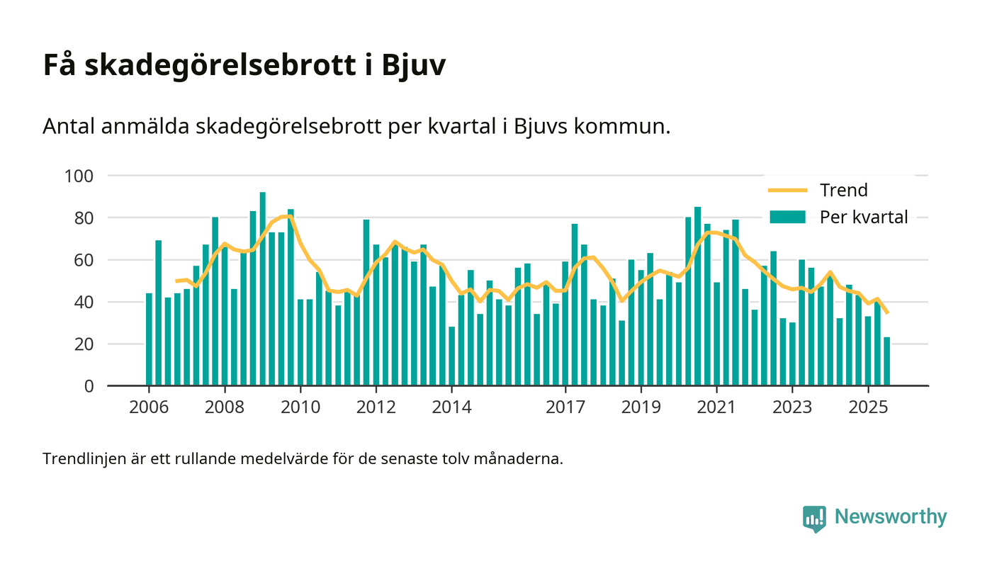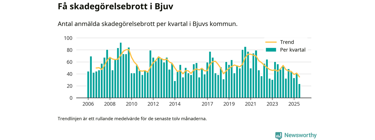 Det anmäldes sammanlagt 23 skadegörelsebrott i Bjuvs kommun under tredje kvartalet 2025. Inte ett enda kvartal sedan 2006 har det anmälts så här få skadegörelsebrott i kommunen.
