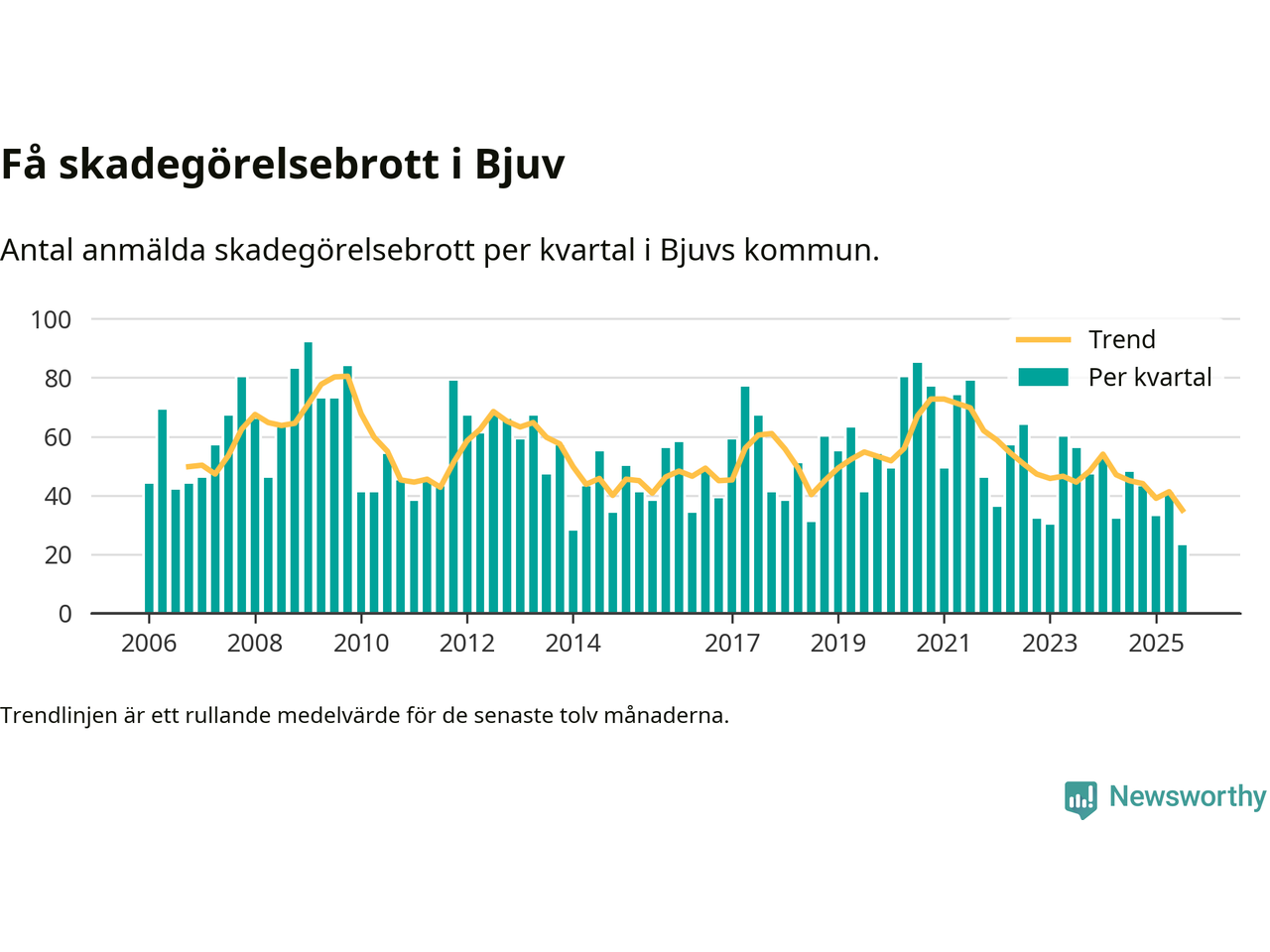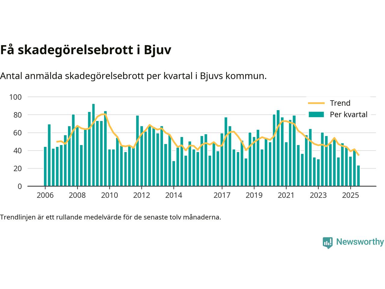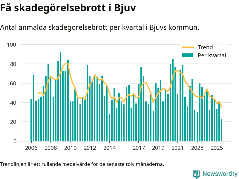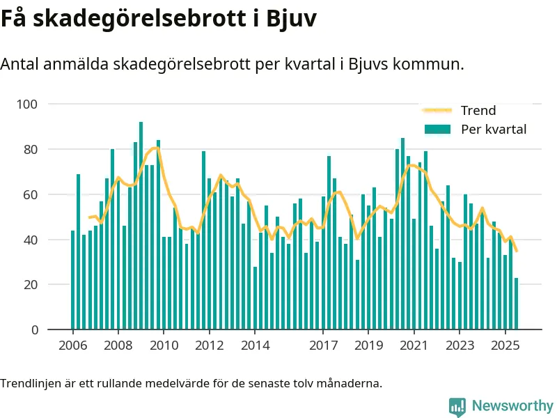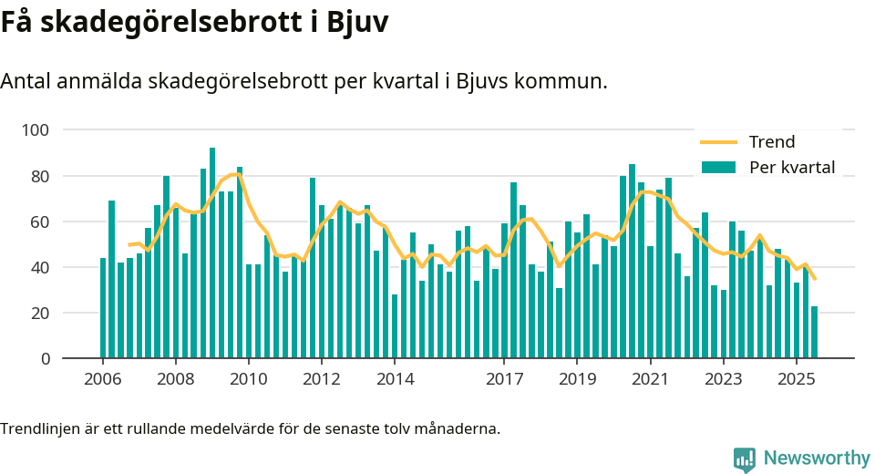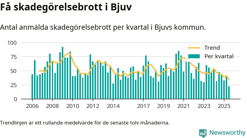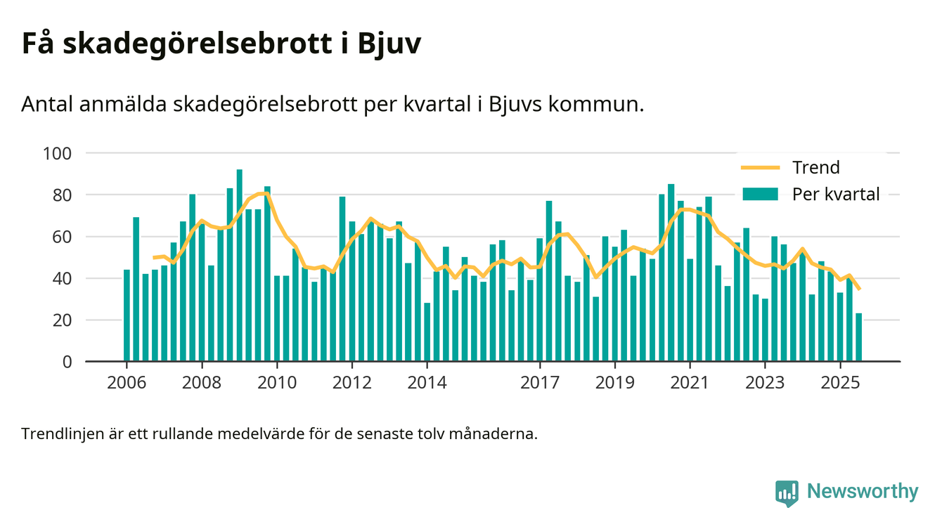 Det anmäldes sammanlagt 23 skadegörelsebrott i Bjuvs kommun under tredje kvartalet 2025. Inte ett enda kvartal sedan 2006 har det anmälts så här få skadegörelsebrott i kommunen.