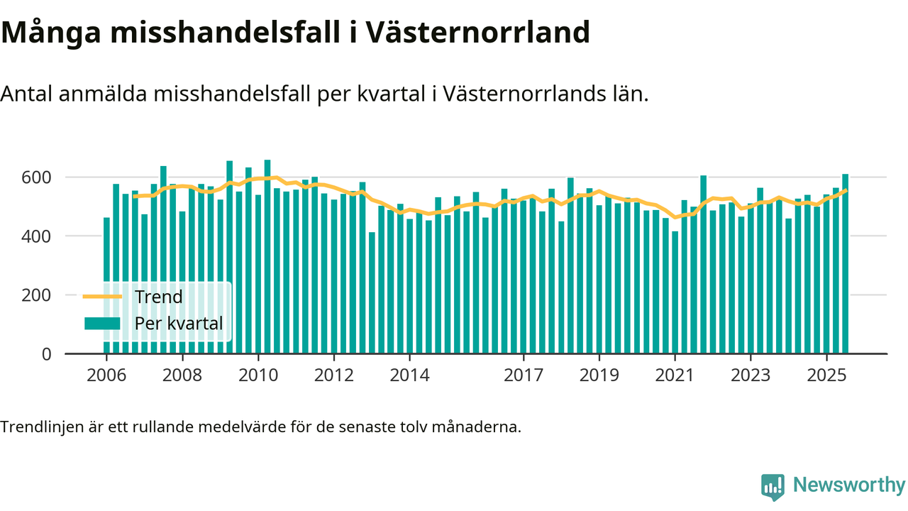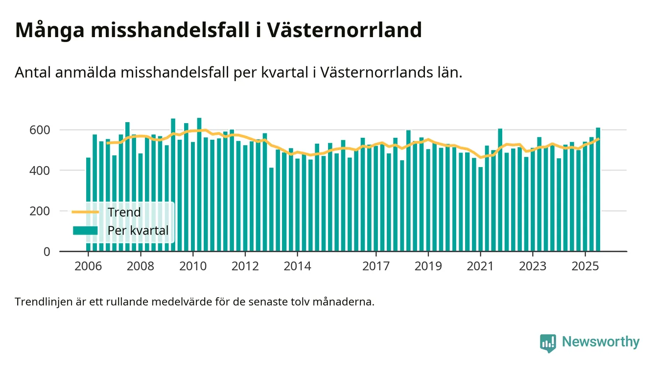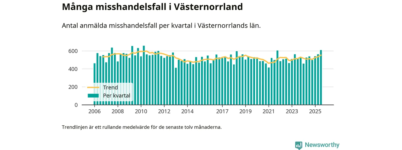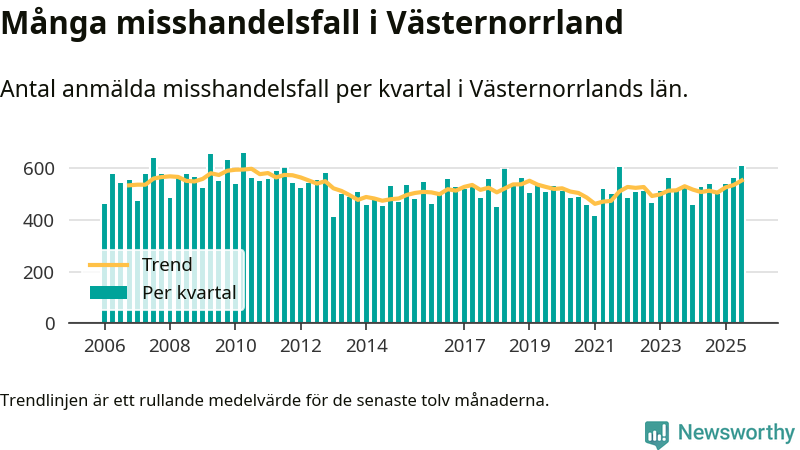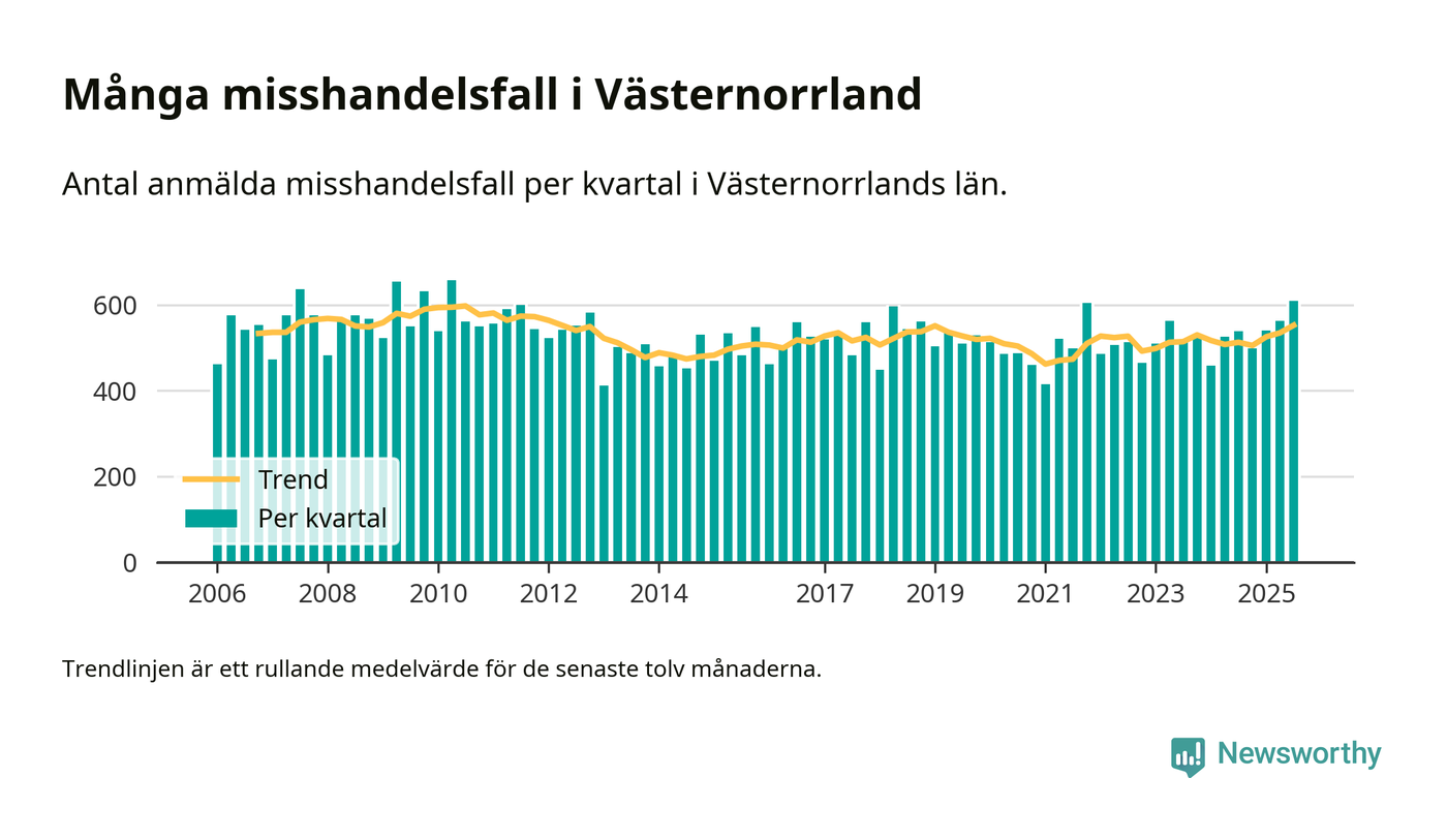 Det anmäldes sammanlagt 609 misshandelsfall i Västernorrlands län under tredje kvartalet 2025. Vi får gå tillbaka till andra kvartalet 2010 för att hitta ett kvartal då det anmäldes lika många misshandelsfall i länet.
