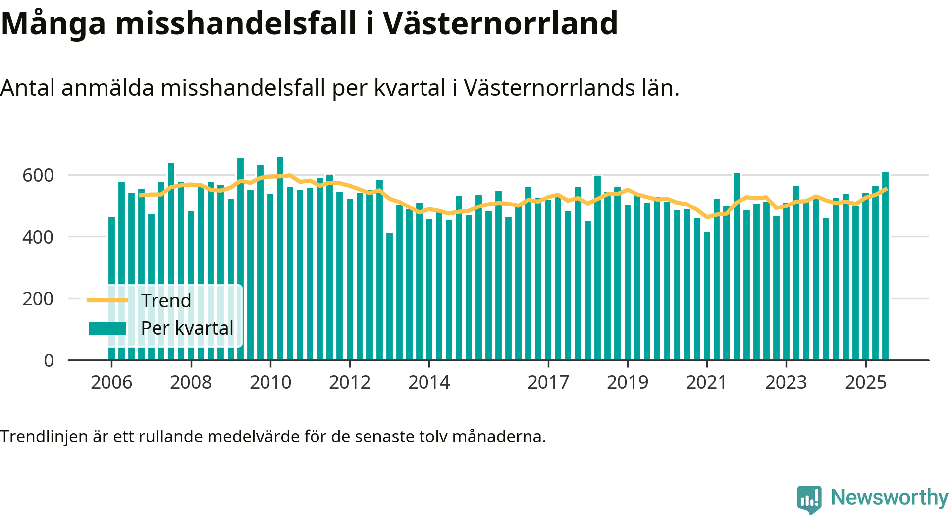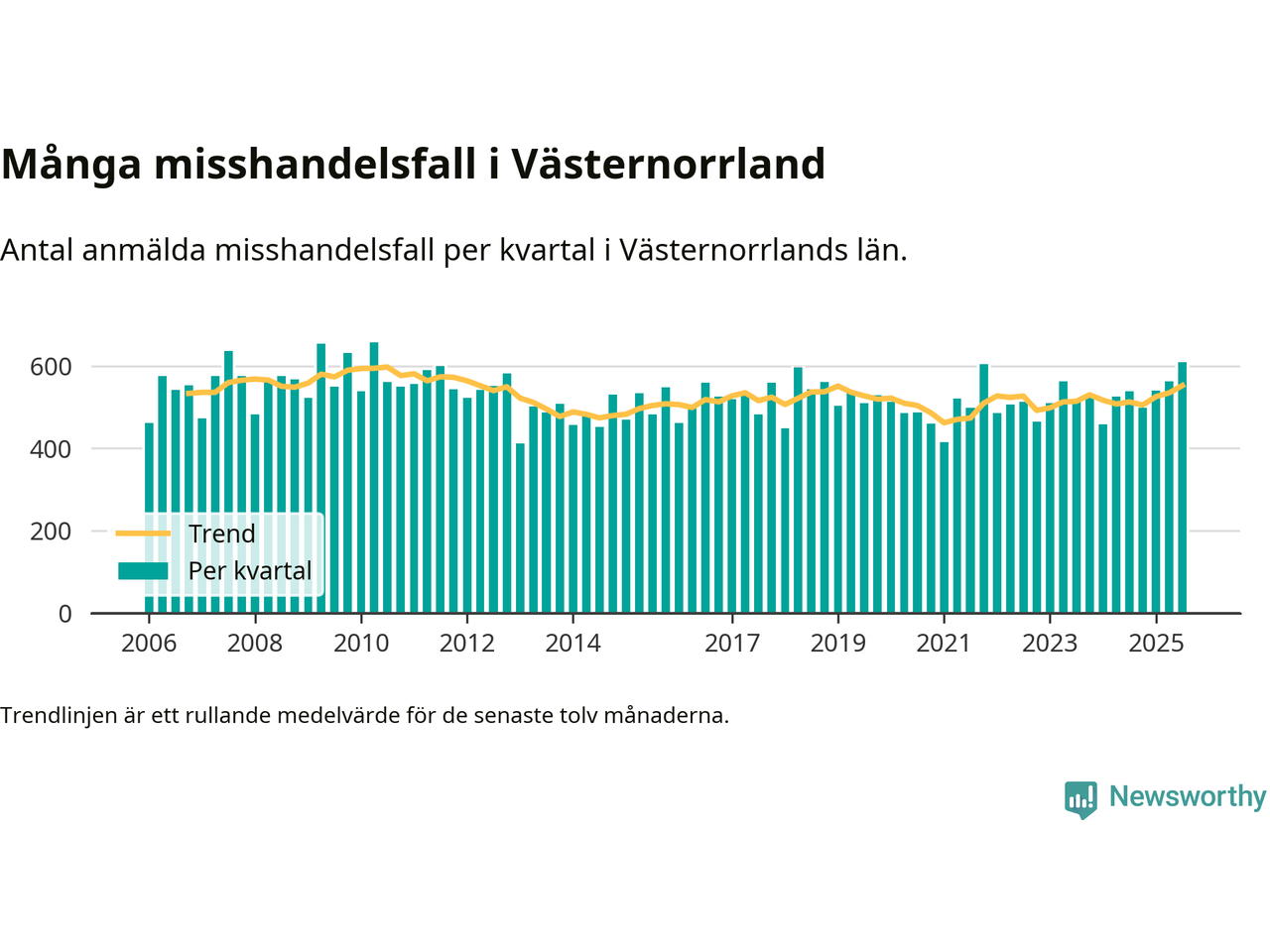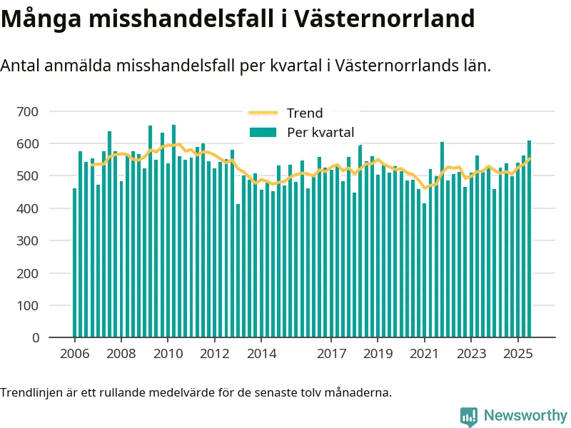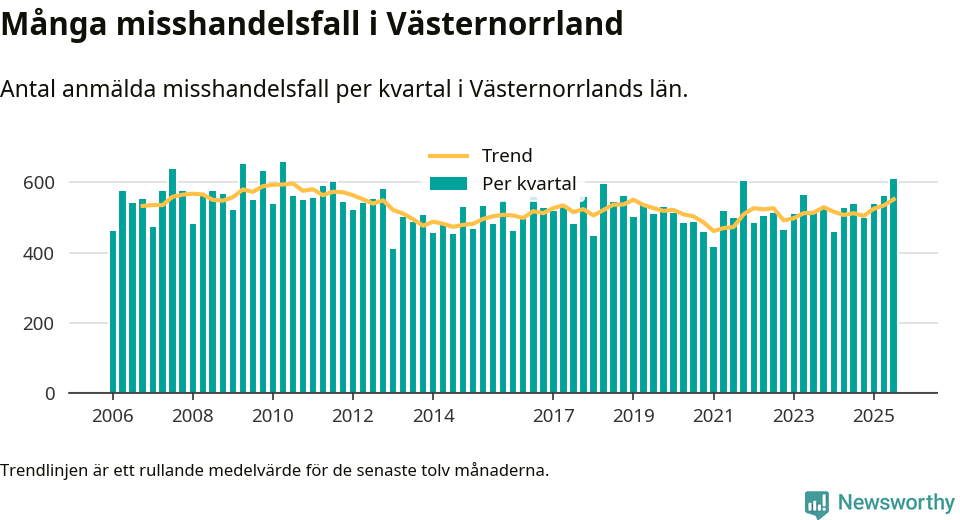 Det anmäldes sammanlagt 609 misshandelsfall i Västernorrlands län under tredje kvartalet 2025. Vi får gå tillbaka till andra kvartalet 2010 för att hitta ett kvartal då det anmäldes lika många misshandelsfall i länet.