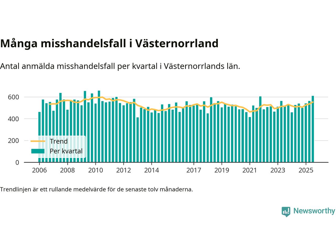 I snitt har det sedan 2006 anmälts 529 misshandelsfall per kvartal i Västernorrlands län. Flest anmälningar under ett enskilt kvartal noterades det andra kvartalet 2010 (657 stycken).