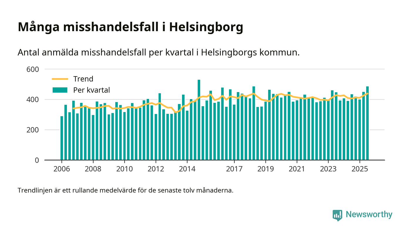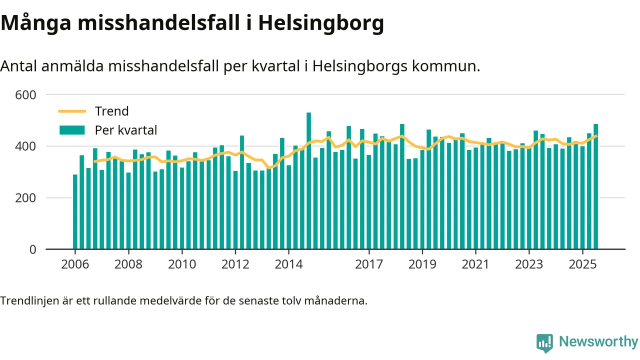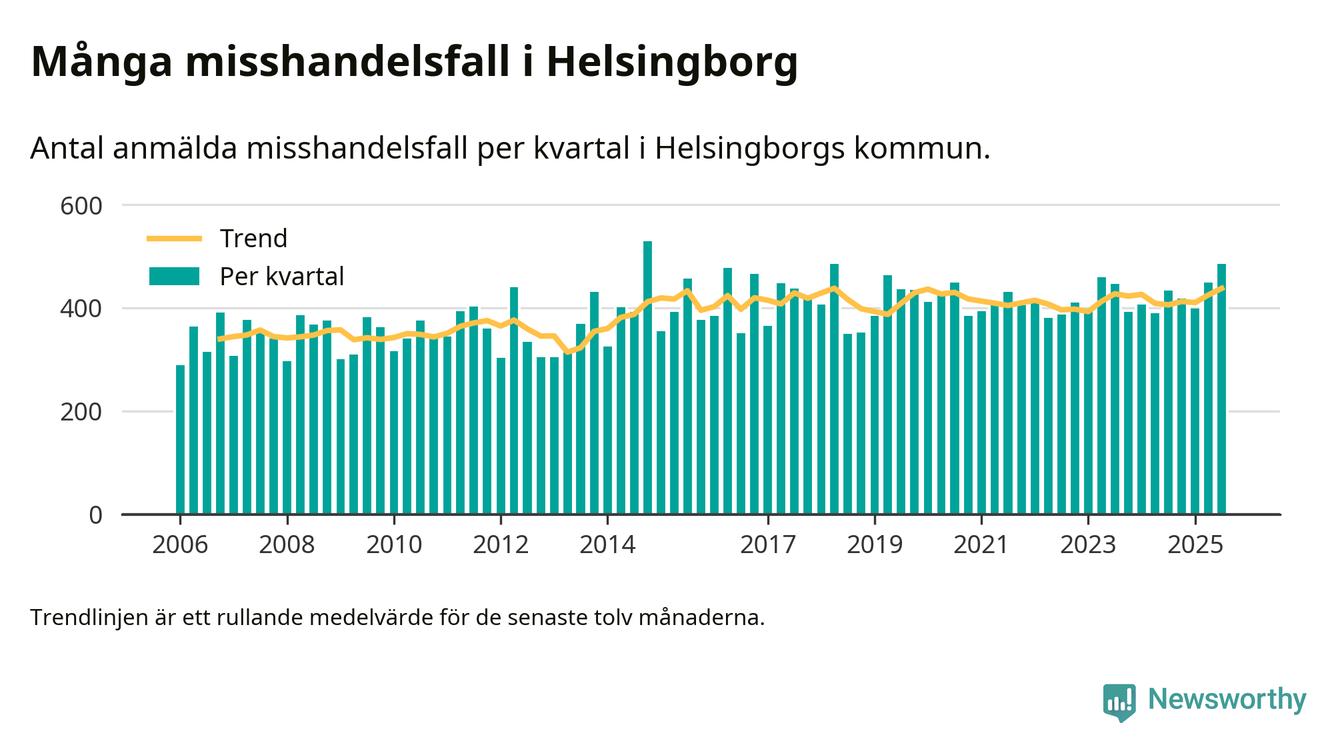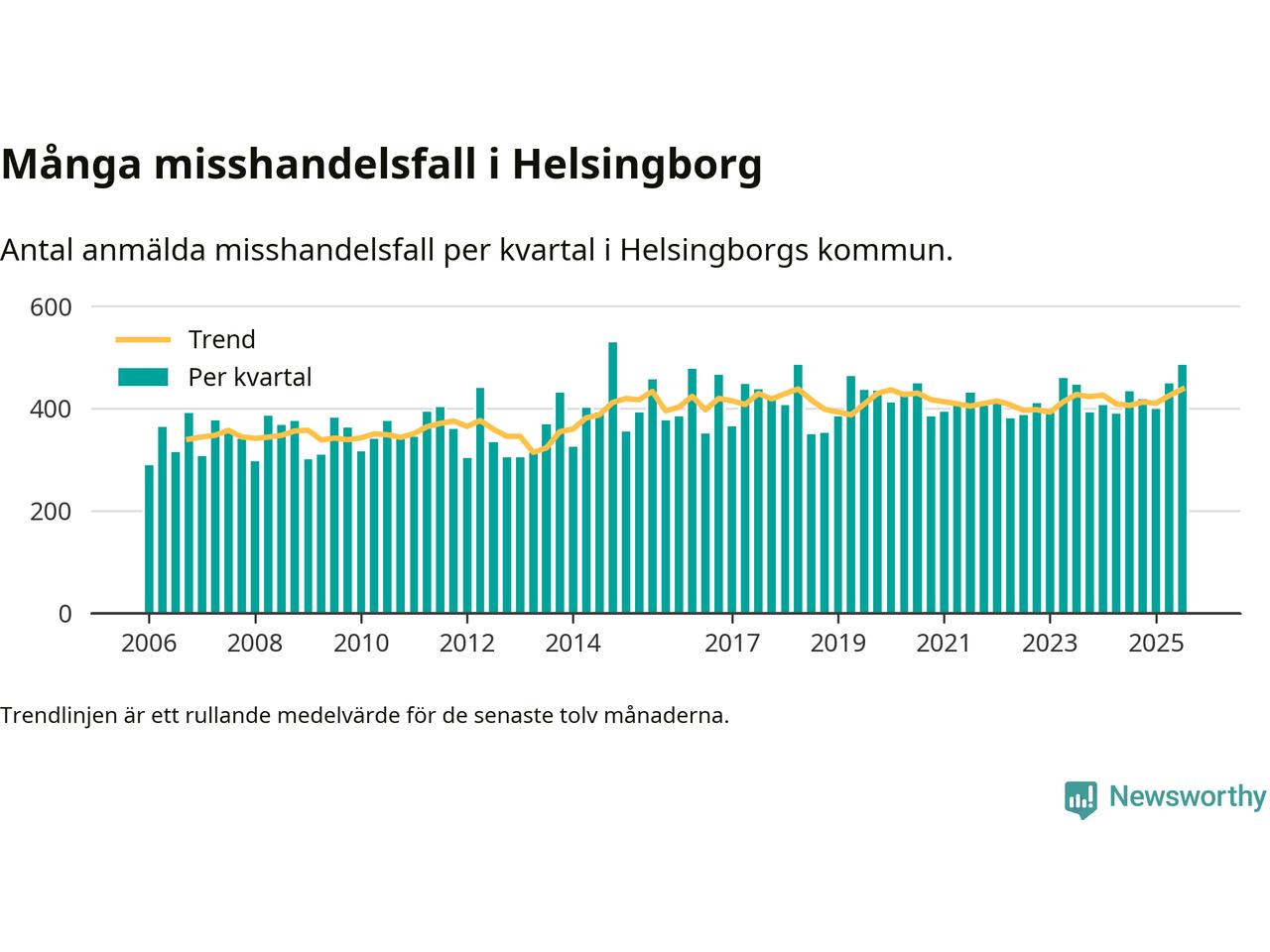 Det anmäldes sammanlagt 485 misshandelsfall i Helsingborgs kommun under tredje kvartalet 2025. Vi får gå tillbaka till andra kvartalet 2018 för att hitta ett kvartal då det anmäldes lika många misshandelsfall i kommunen.