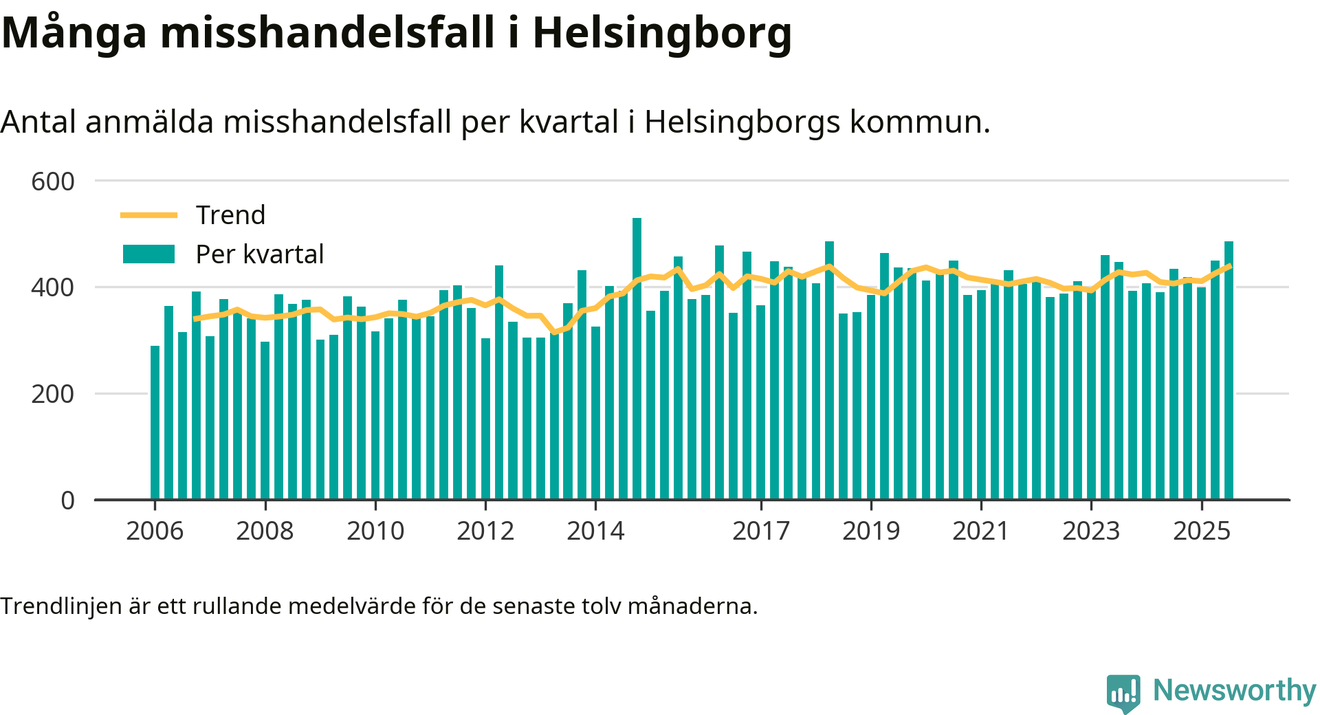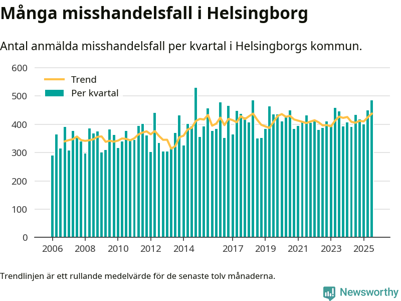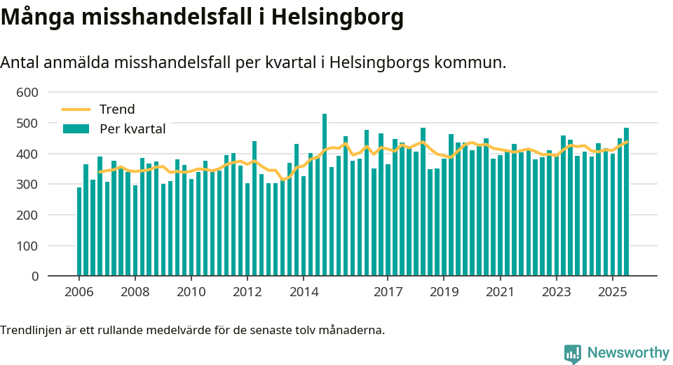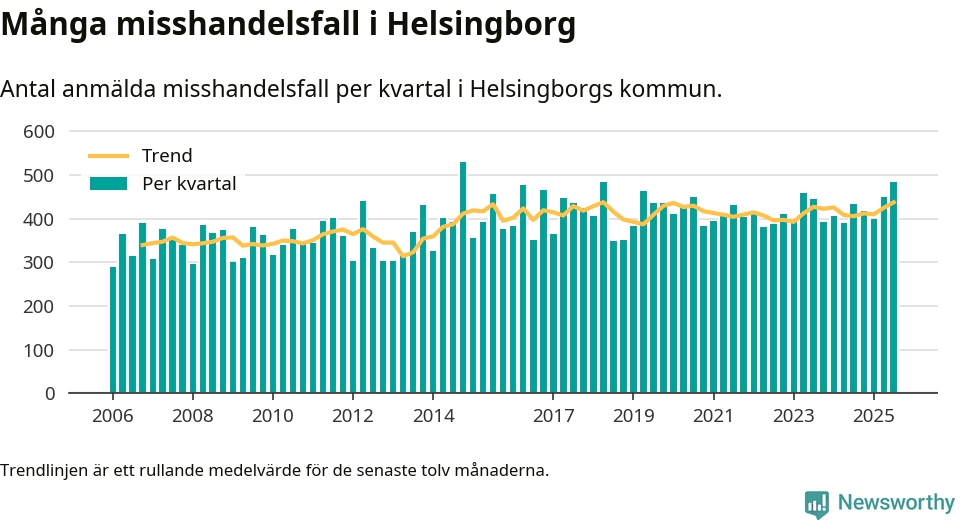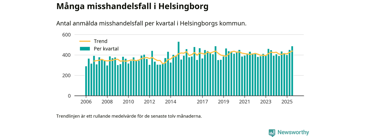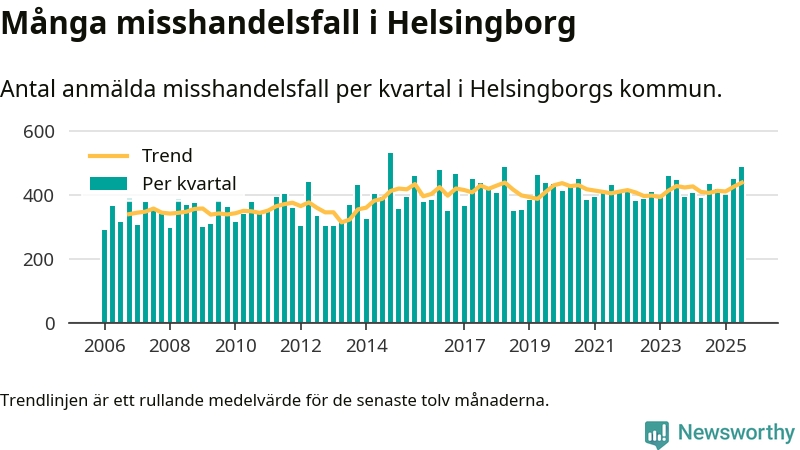Det anmäldes sammanlagt 485 misshandelsfall i Helsingborgs kommun under tredje kvartalet 2025. Vi får gå tillbaka till andra kvartalet 2018 för att hitta ett kvartal då det anmäldes lika många misshandelsfall i kommunen.