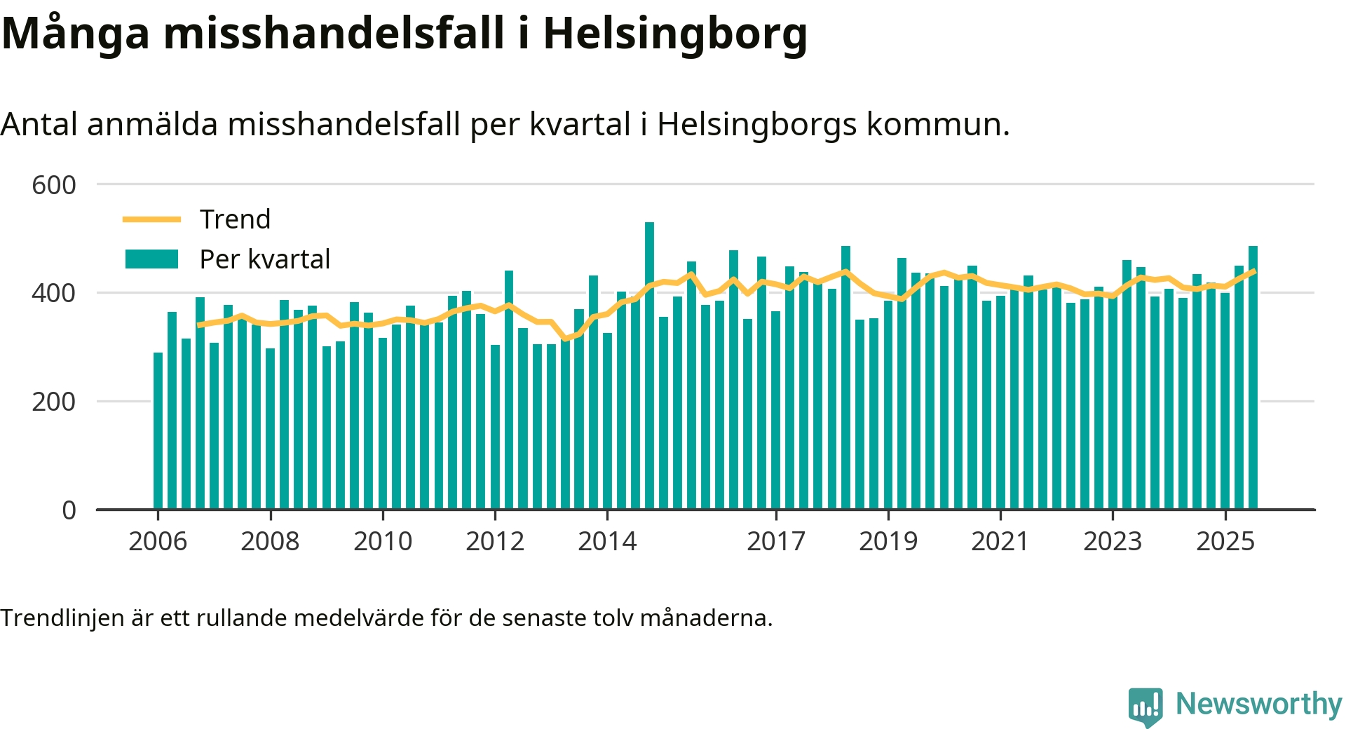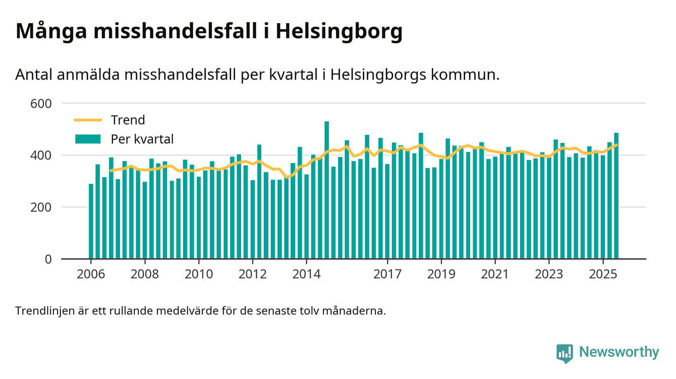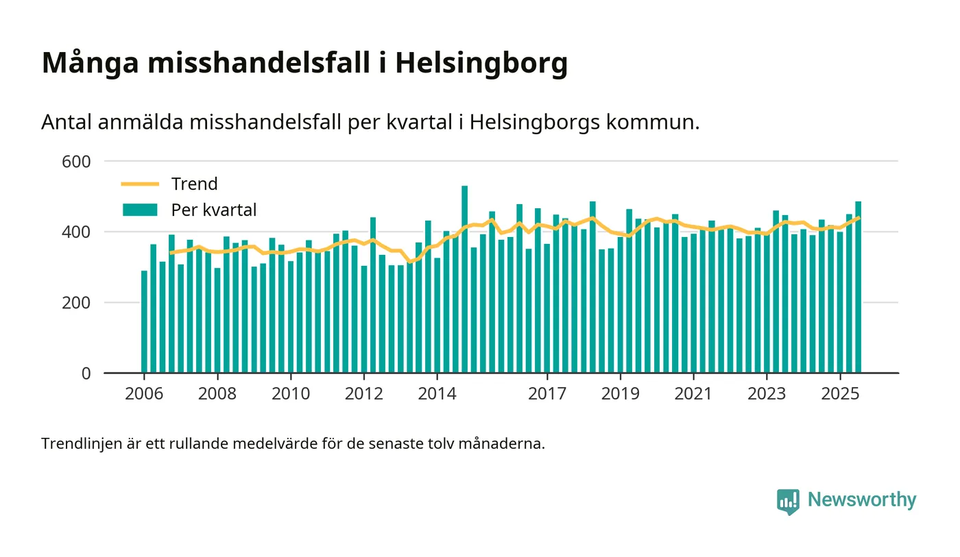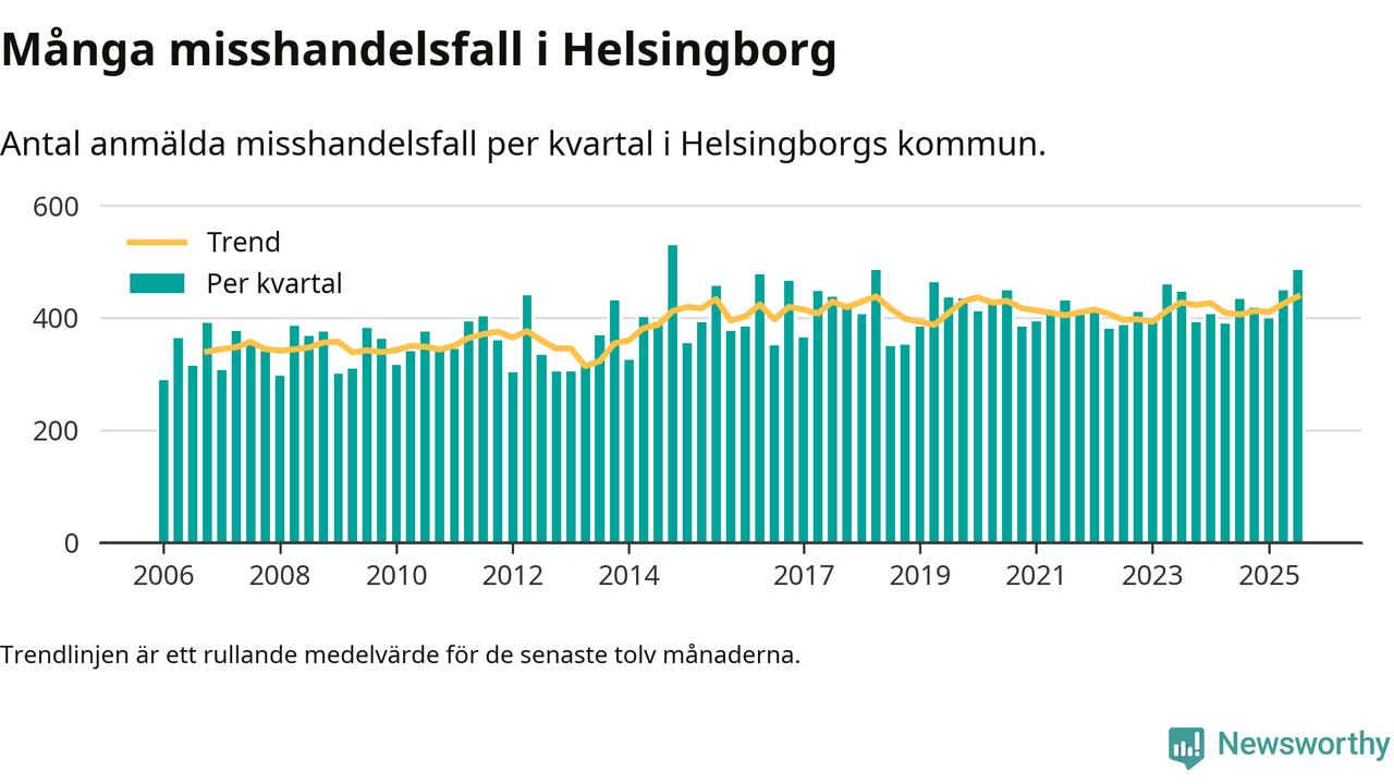 I snitt har det sedan 2006 anmälts 388 misshandelsfall per kvartal i Helsingborgs kommun. Flest anmälningar under ett enskilt kvartal noterades det fjärde kvartalet 2014 (529 stycken).