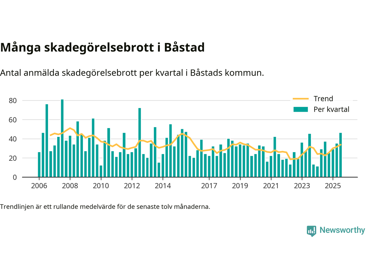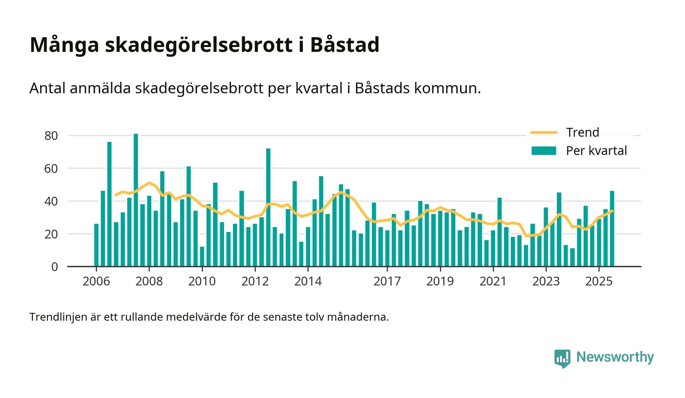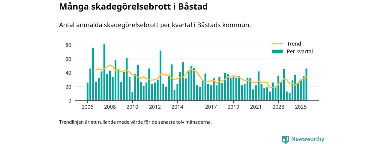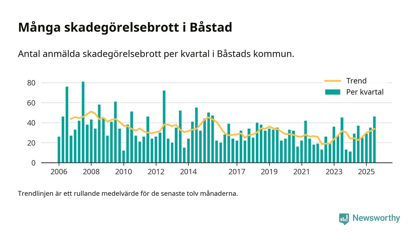 I snitt har det sedan 2006 anmälts 34 skadegörelsebrott per kvartal i Båstads kommun. Flest anmälningar under ett enskilt kvartal noterades det tredje kvartalet 2007 (81 stycken).