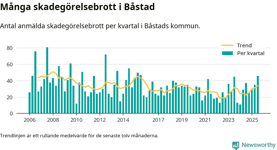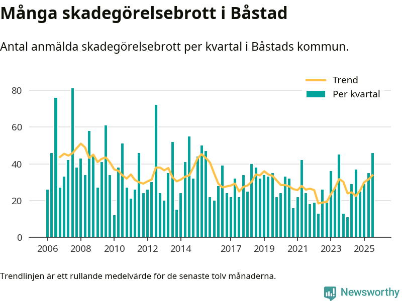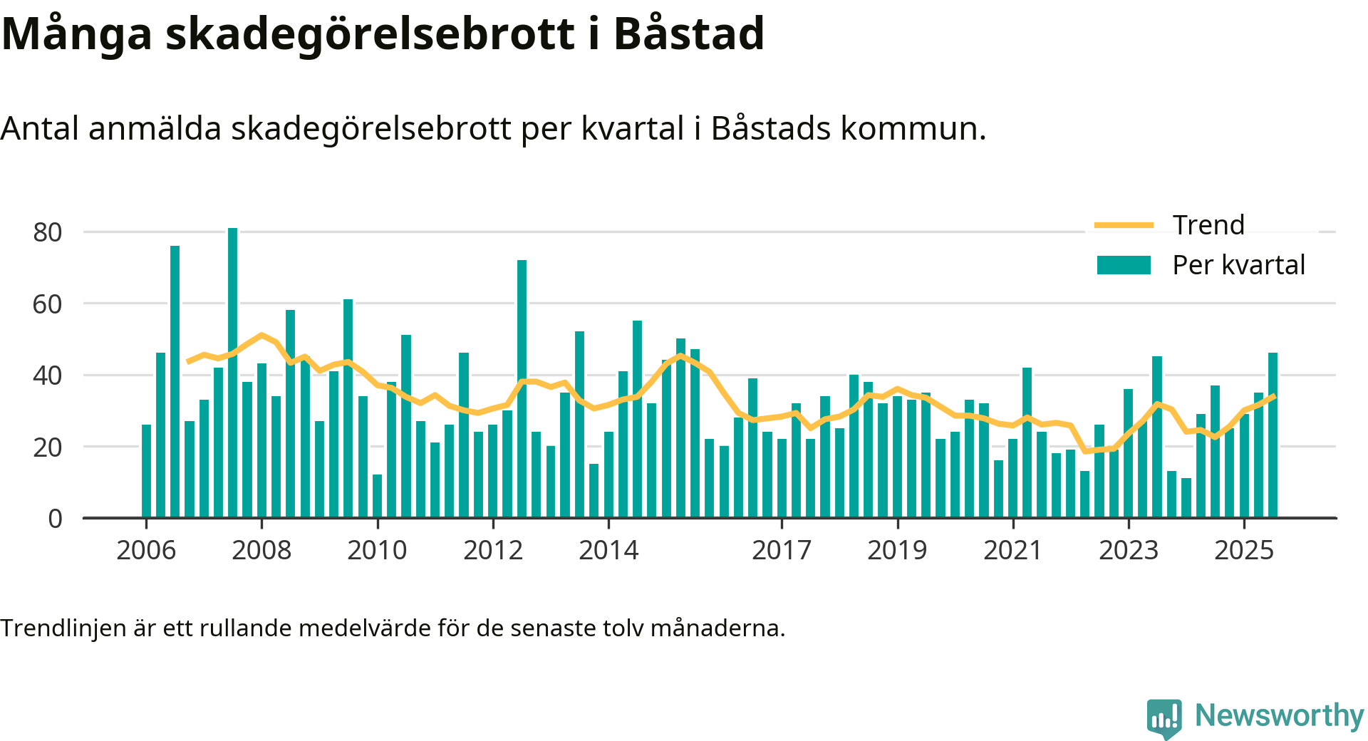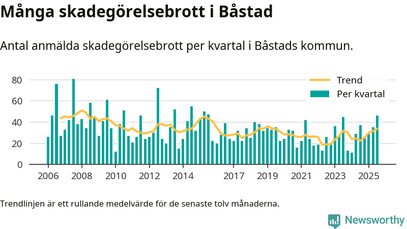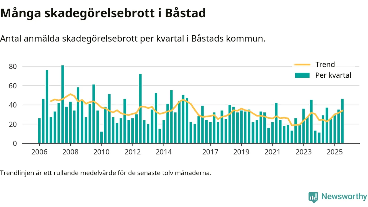 I snitt har det sedan 2006 anmälts 34 skadegörelsebrott per kvartal i Båstads kommun. Flest anmälningar under ett enskilt kvartal noterades det tredje kvartalet 2007 (81 stycken).