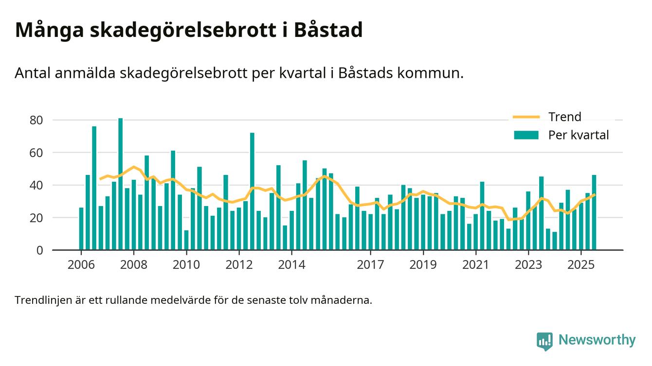 Det anmäldes sammanlagt 46 skadegörelsebrott i Båstads kommun under tredje kvartalet 2025. Vi får gå tillbaka till tredje kvartalet 2015 för att hitta ett kvartal då det anmäldes lika många skadegörelsebrott i kommunen.