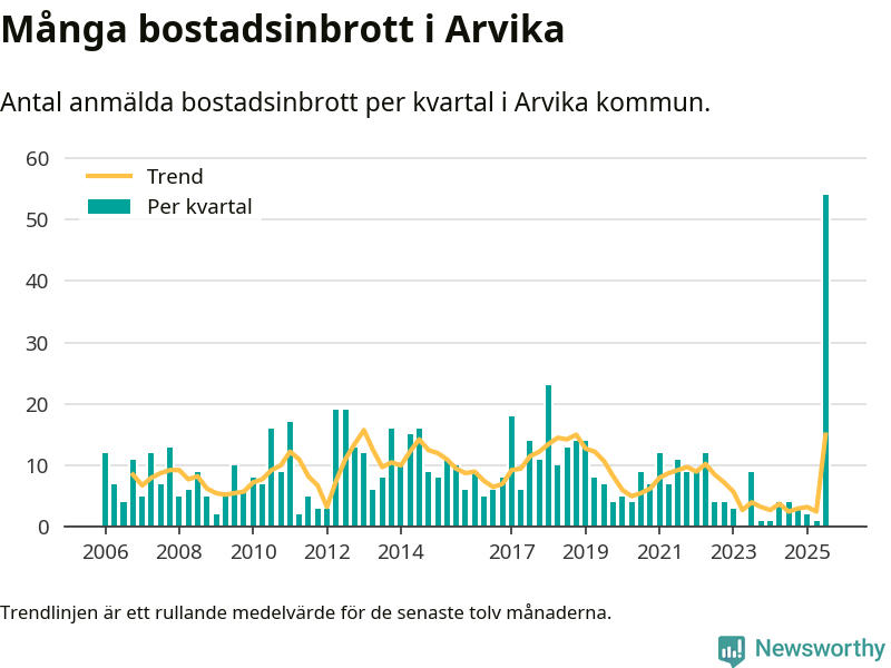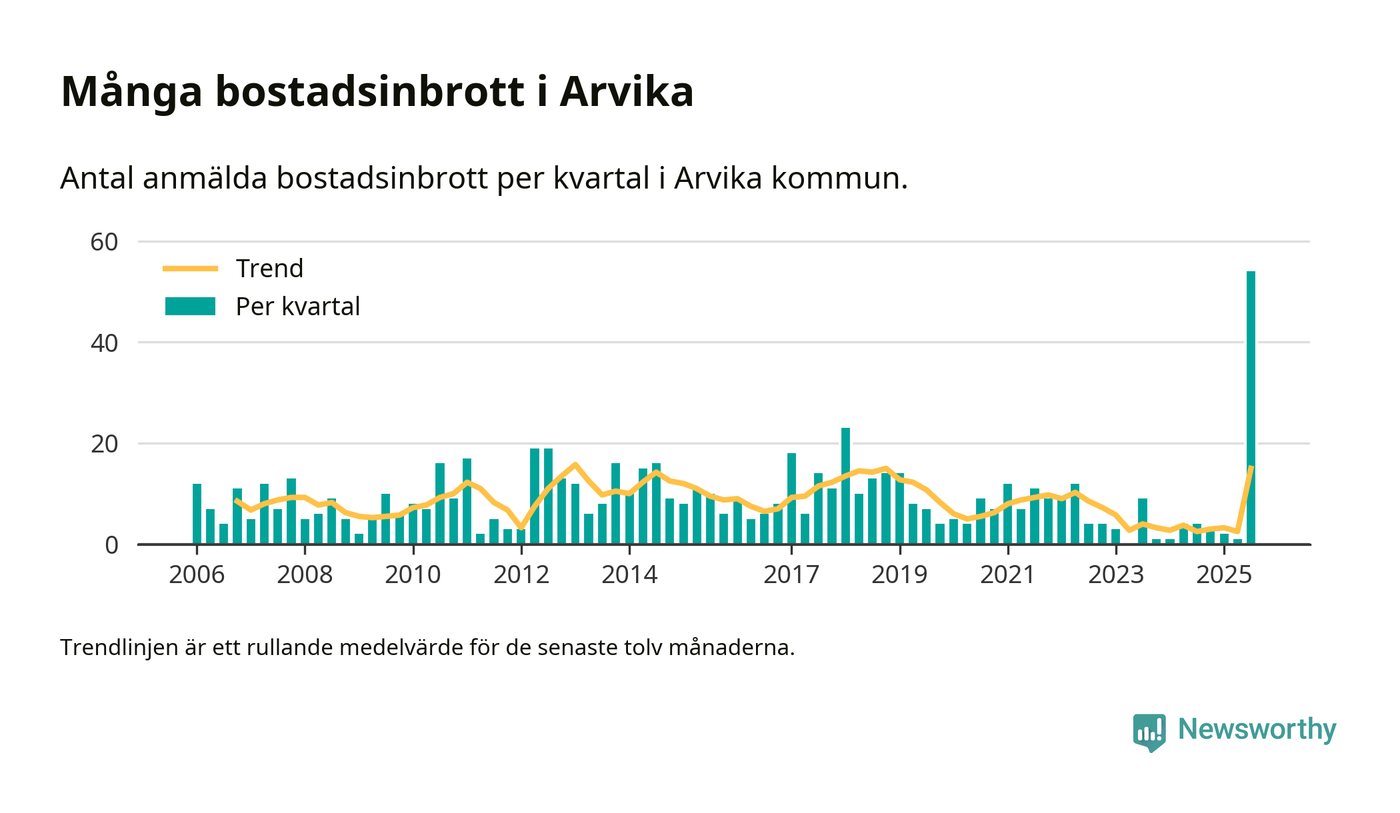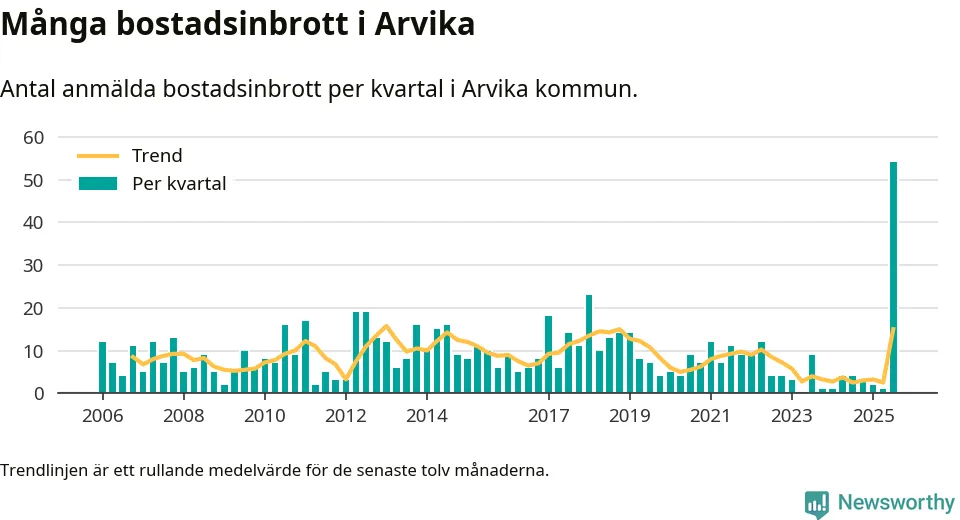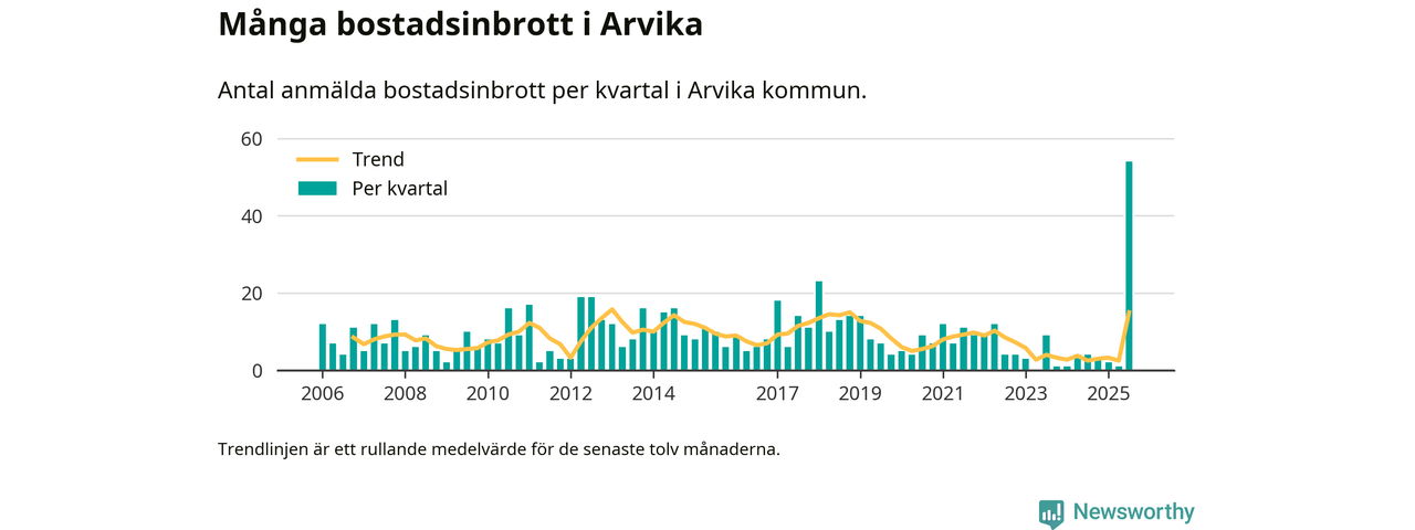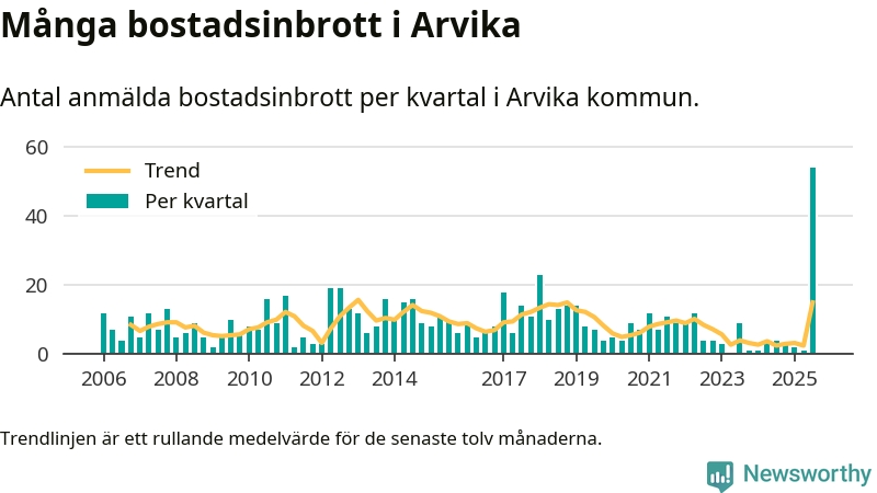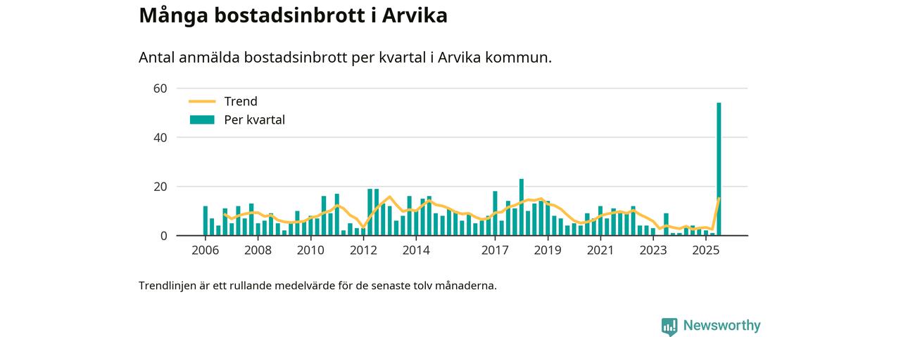 Det anmäldes sammanlagt 54 bostadsinbrott i Arvika kommun under tredje kvartalet 2025. Inte ett enda kvartal sedan 2006 har det anmälts så här många bostadsinbrott i kommunen.