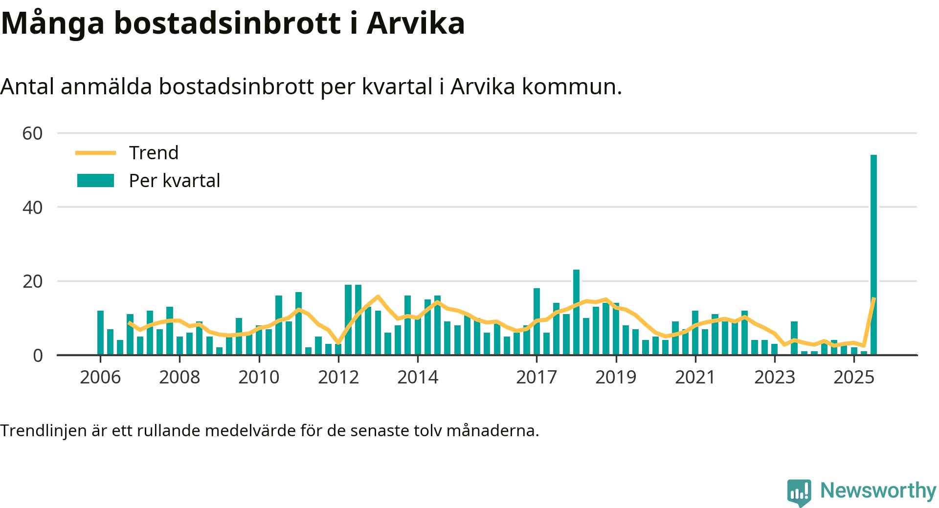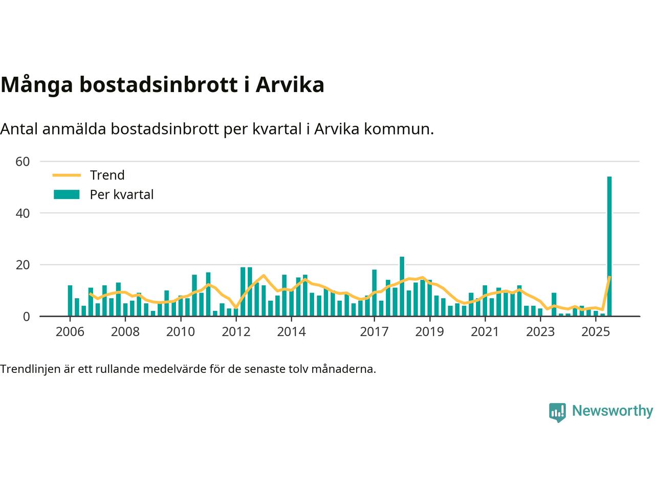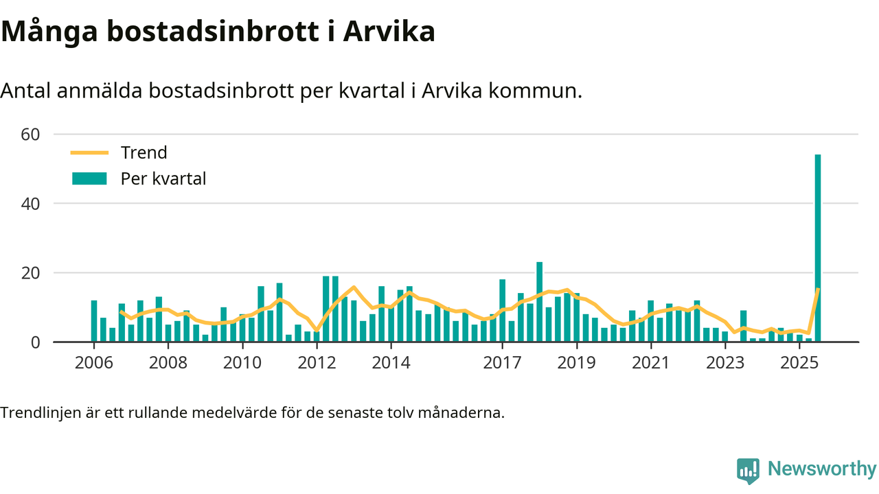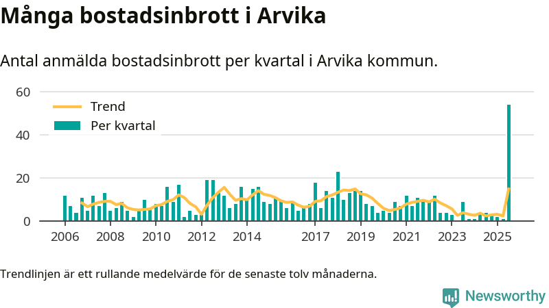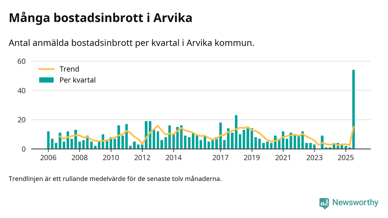 Det anmäldes sammanlagt 54 bostadsinbrott i Arvika kommun under tredje kvartalet 2025. Inte ett enda kvartal sedan 2006 har det anmälts så här många bostadsinbrott i kommunen.