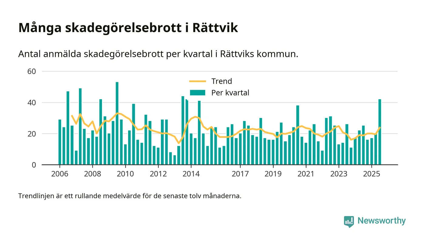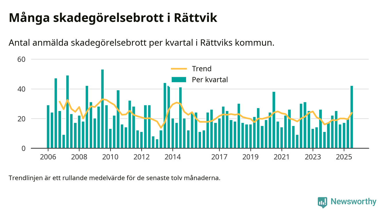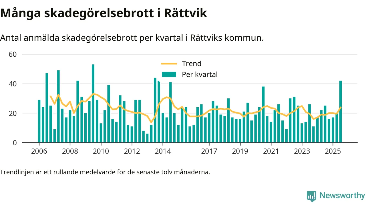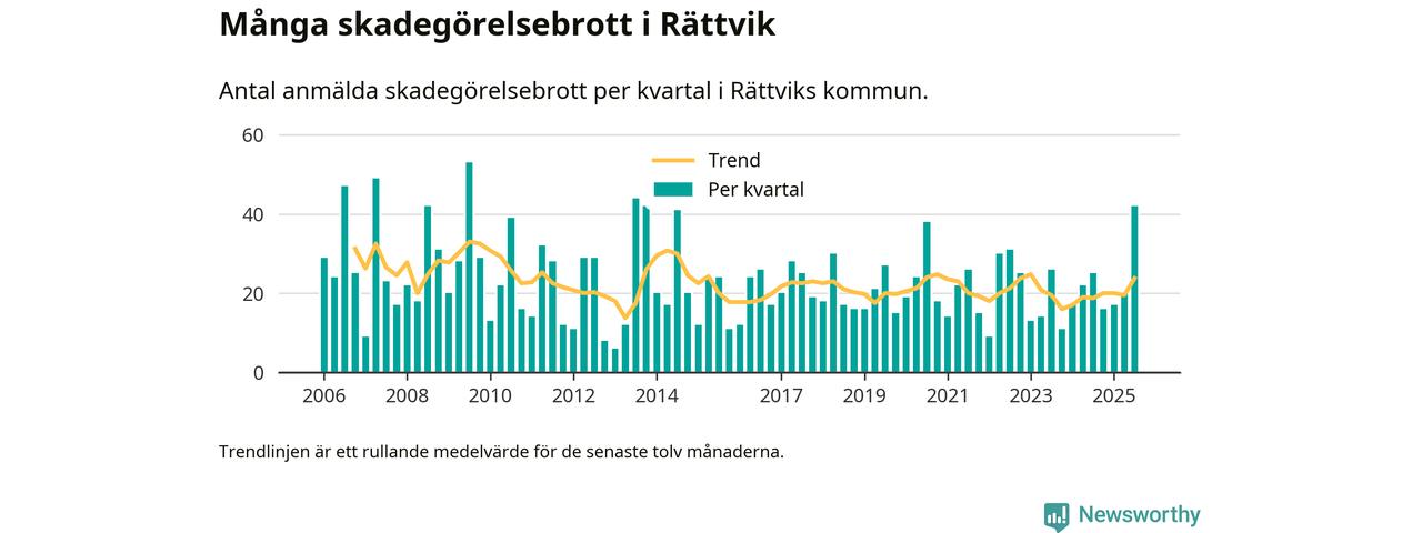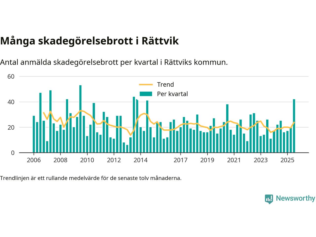 Det anmäldes sammanlagt 42 skadegörelsebrott i Rättviks kommun under tredje kvartalet 2025. Vi får gå tillbaka till fjärde kvartalet 2013 för att hitta ett kvartal då det anmäldes lika många skadegörelsebrott i kommunen.