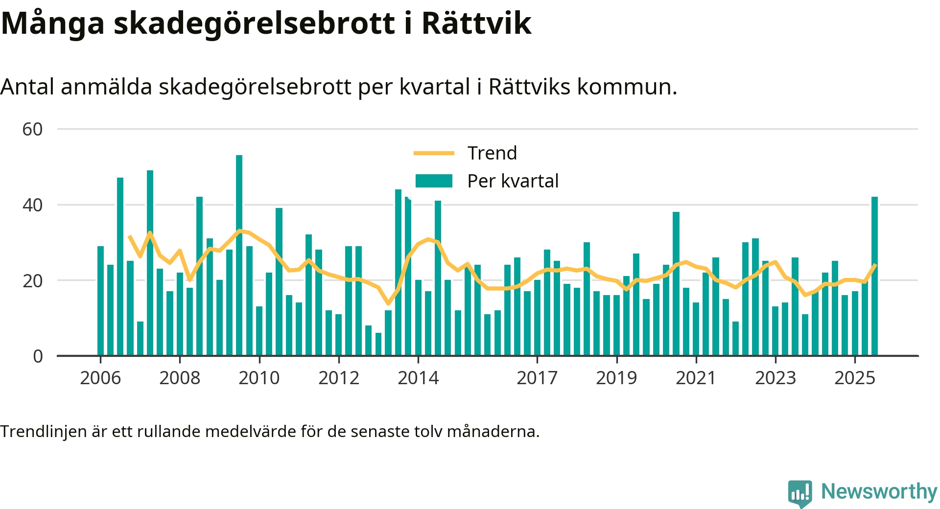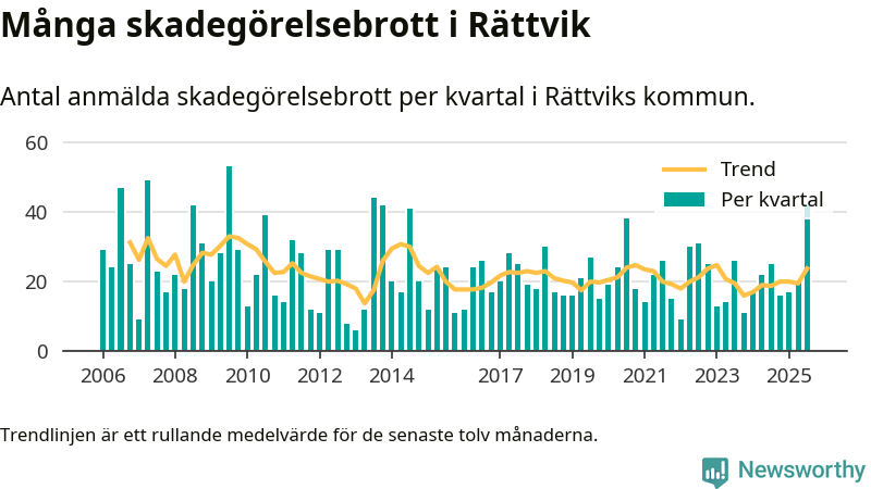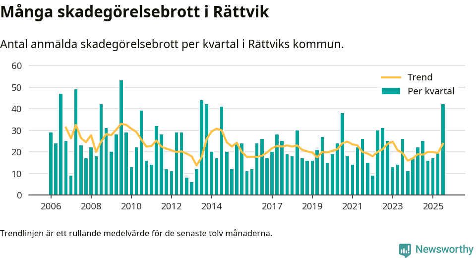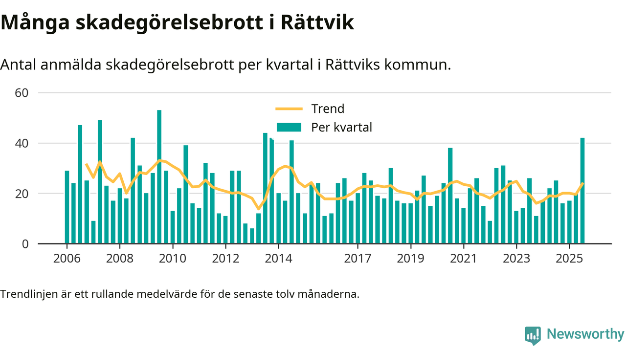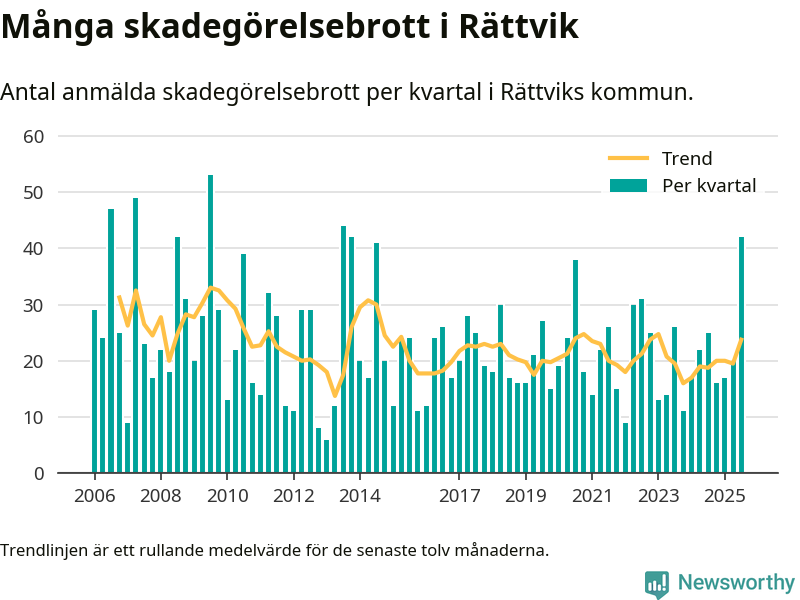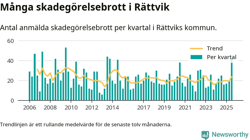 Det anmäldes sammanlagt 42 skadegörelsebrott i Rättviks kommun under tredje kvartalet 2025. Vi får gå tillbaka till fjärde kvartalet 2013 för att hitta ett kvartal då det anmäldes lika många skadegörelsebrott i kommunen.