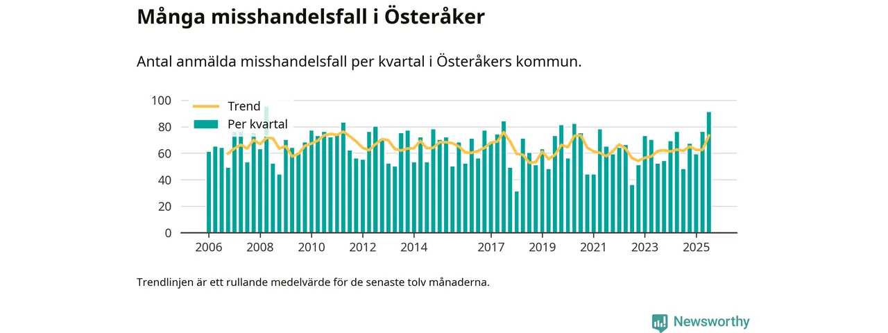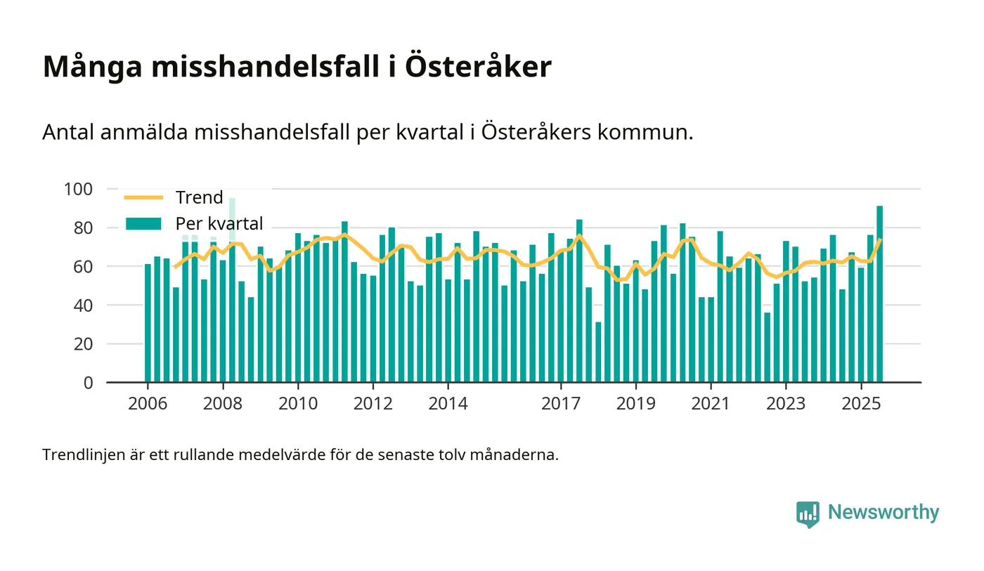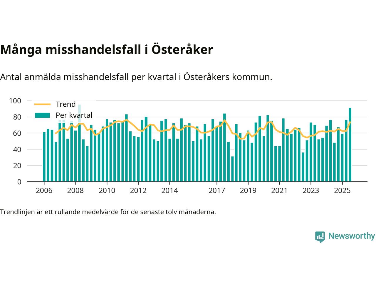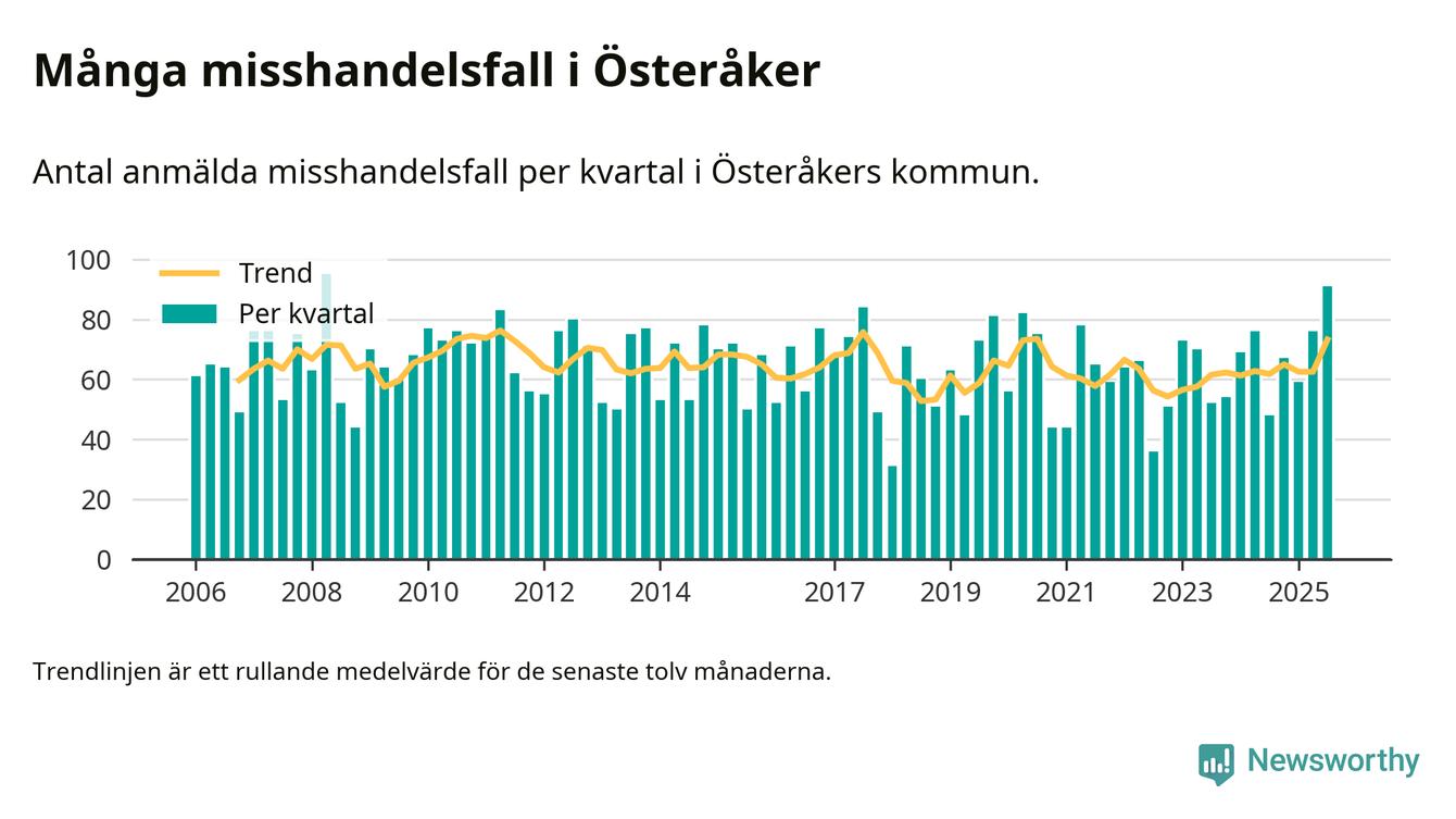 Det anmäldes sammanlagt 91 misshandelsfall i Österåkers kommun under tredje kvartalet 2025. Vi får gå tillbaka till andra kvartalet 2008 för att hitta ett kvartal då det anmäldes lika många misshandelsfall i kommunen.