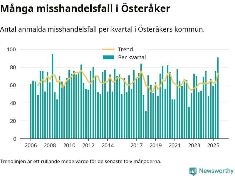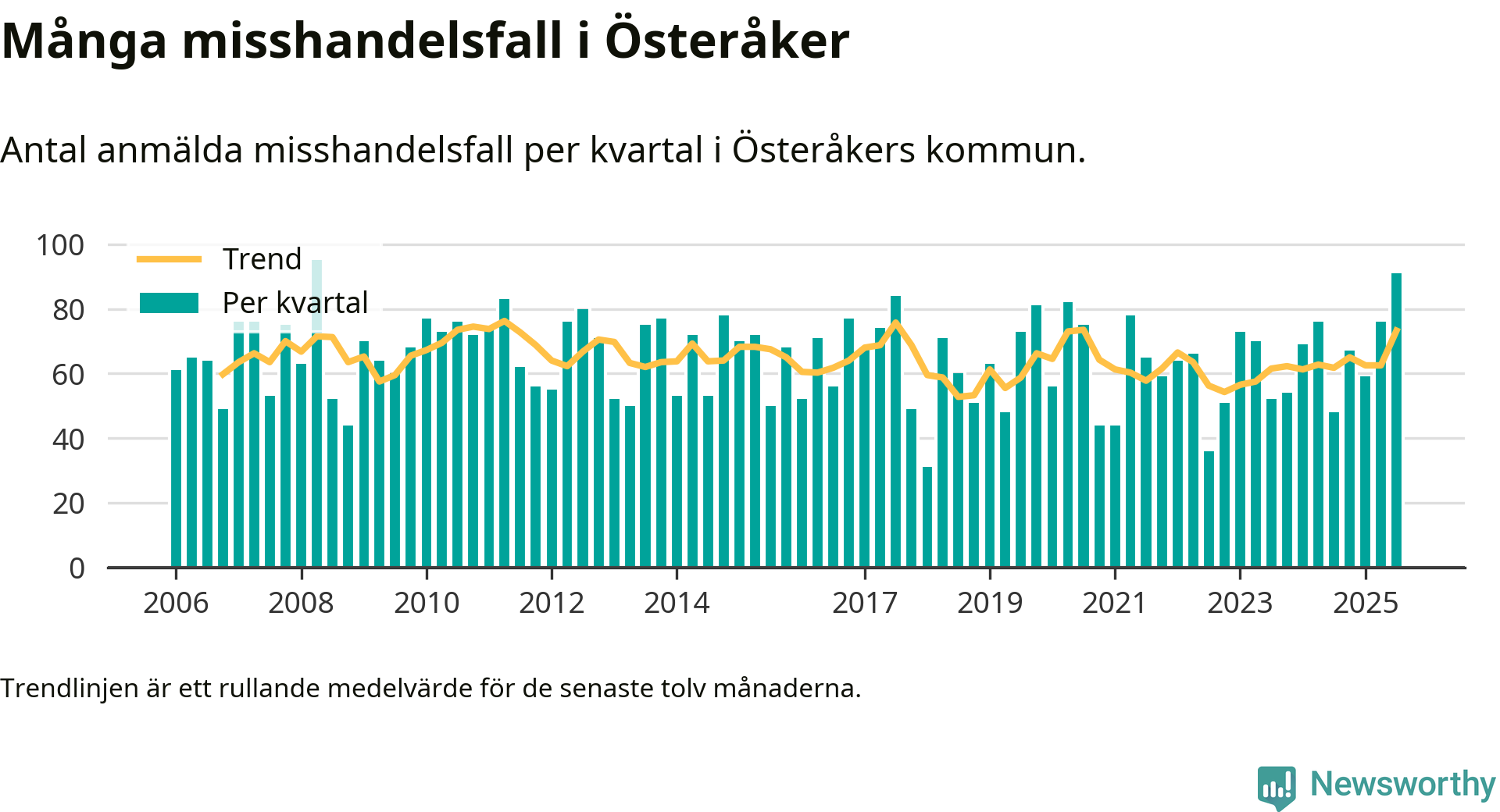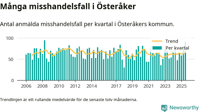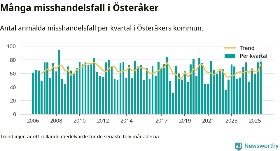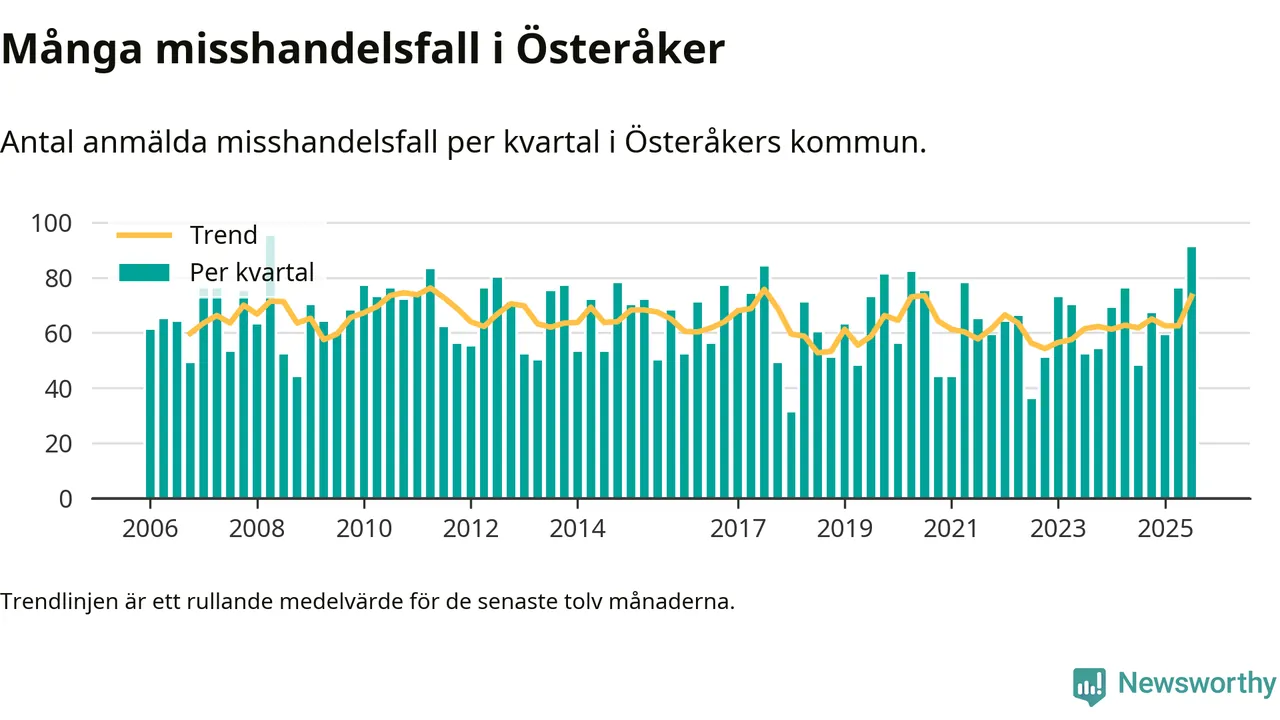 Det anmäldes sammanlagt 91 misshandelsfall i Österåkers kommun under tredje kvartalet 2025. Vi får gå tillbaka till andra kvartalet 2008 för att hitta ett kvartal då det anmäldes lika många misshandelsfall i kommunen.