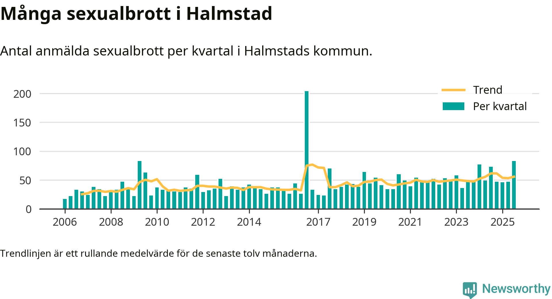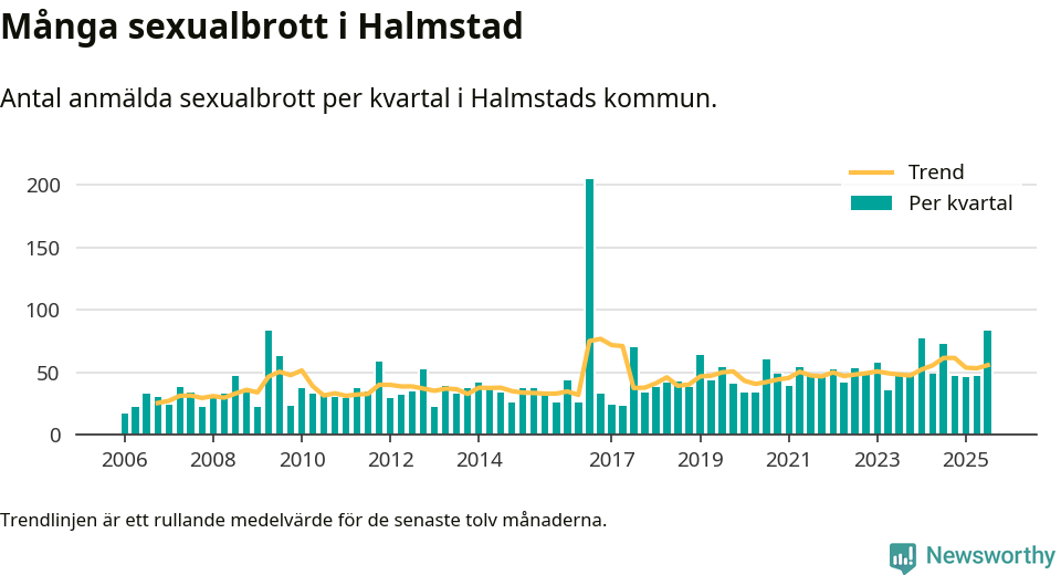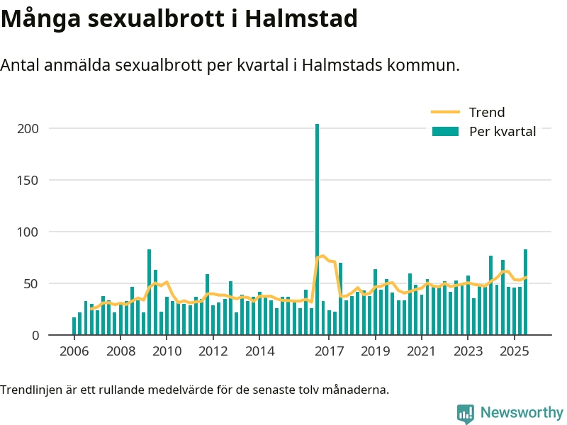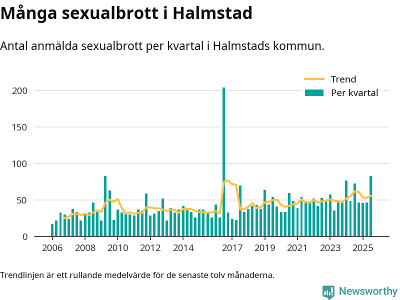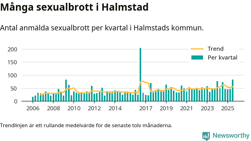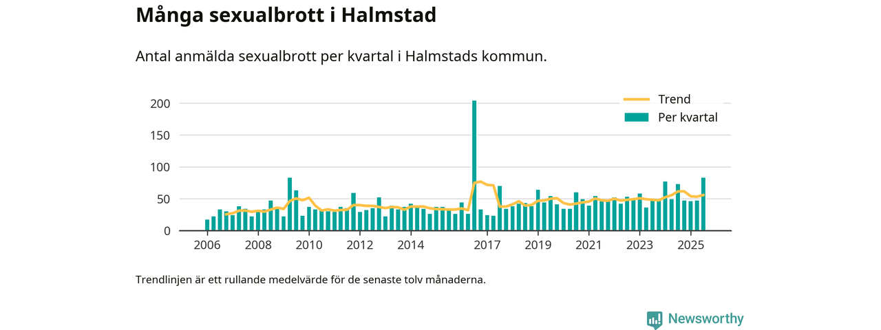 I snitt har det sedan 2006 anmälts 43 sexualbrott per kvartal i Halmstads kommun. Flest anmälningar under ett enskilt kvartal noterades det tredje kvartalet 2016 (204 stycken).