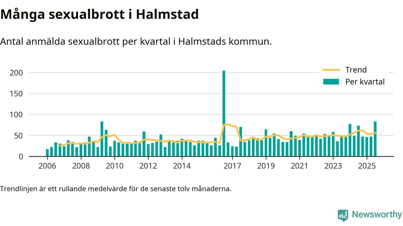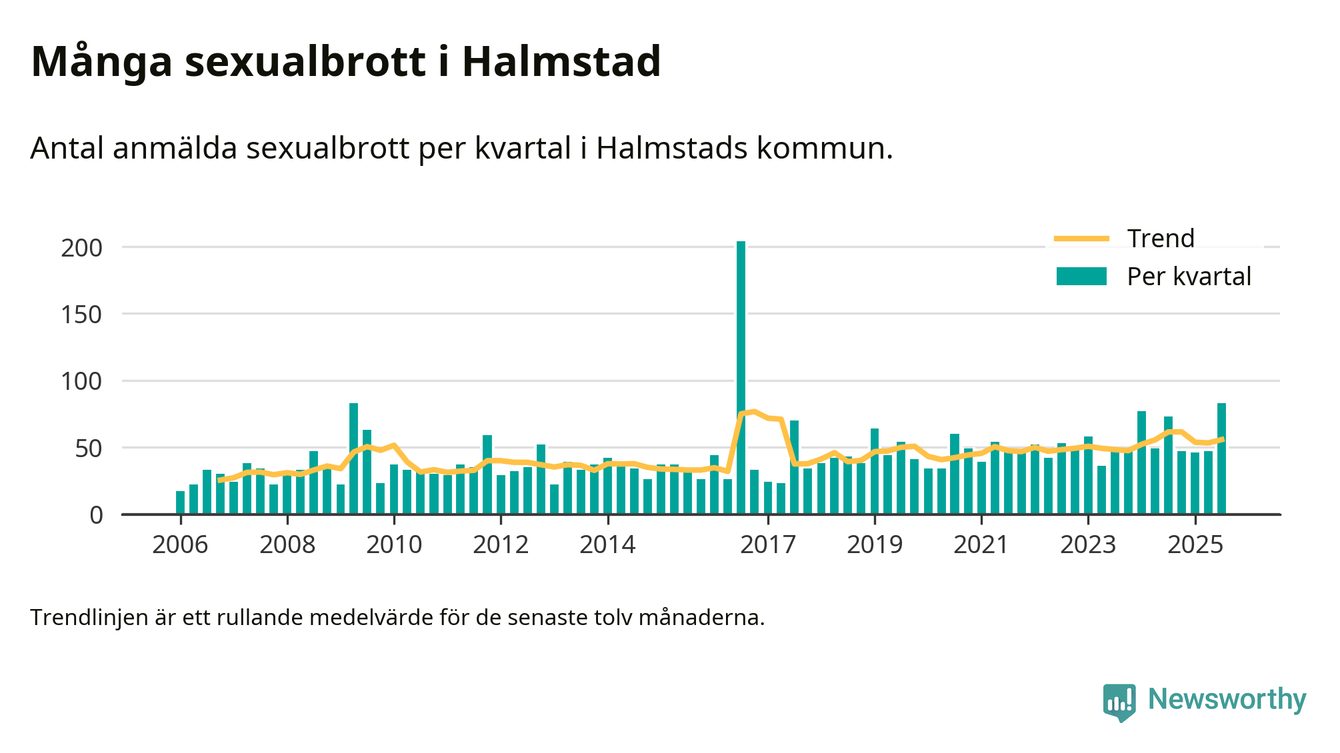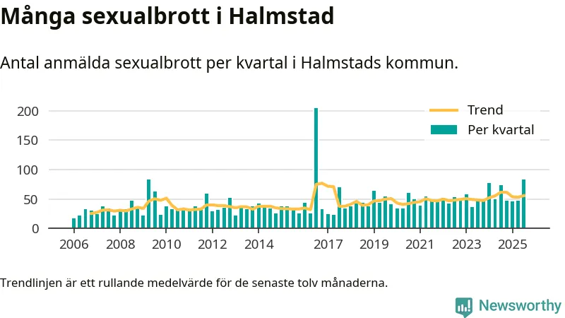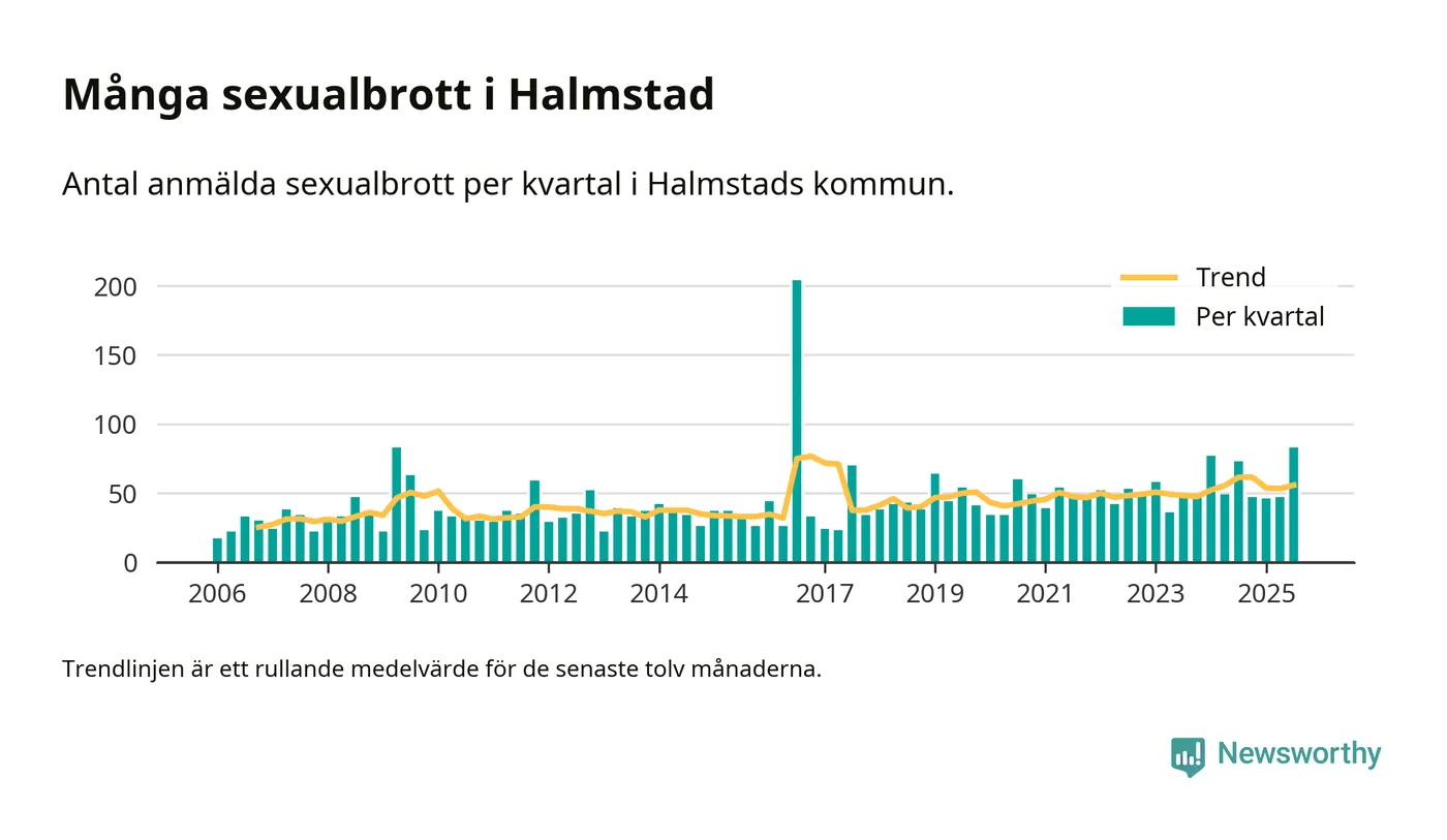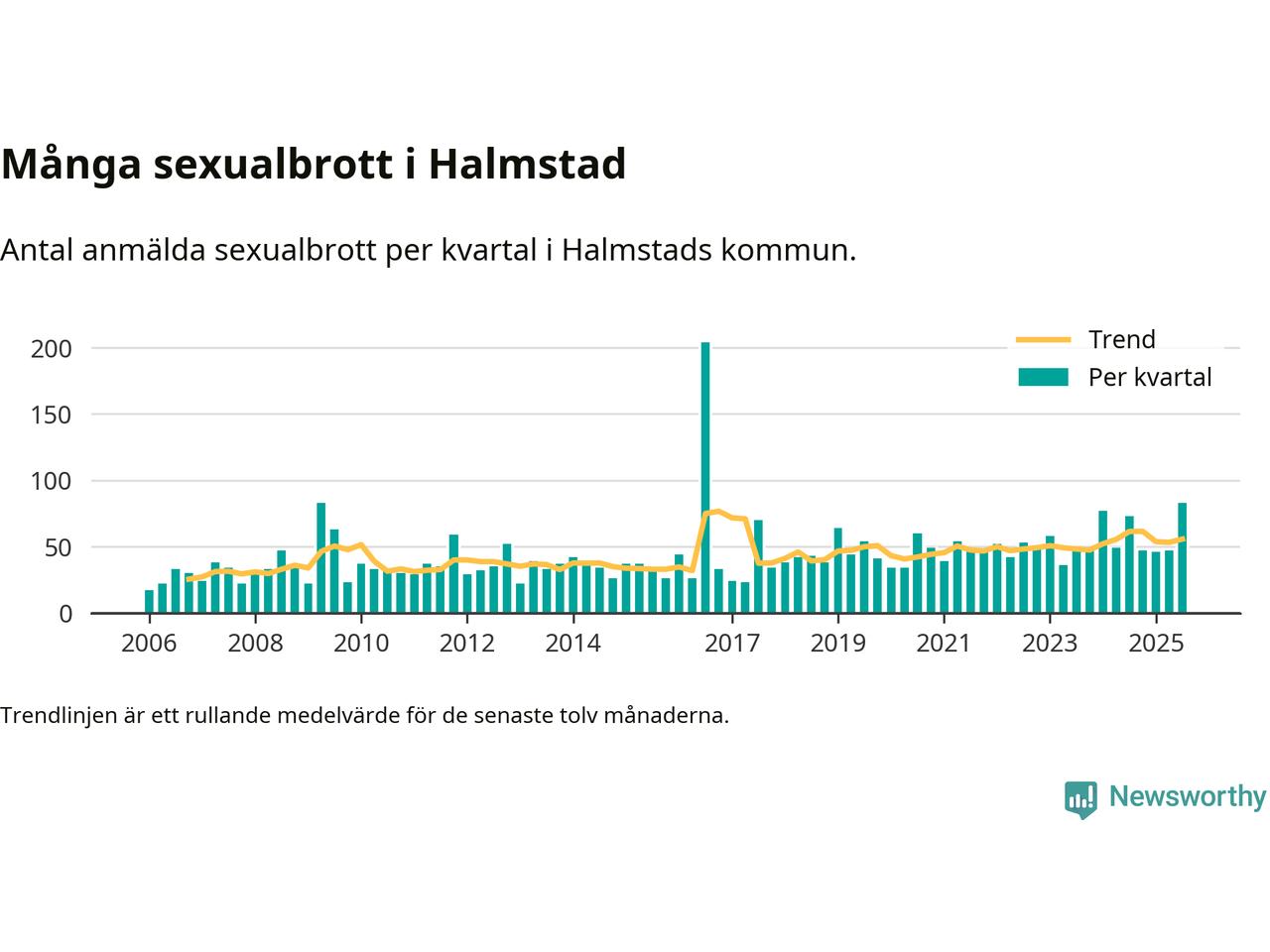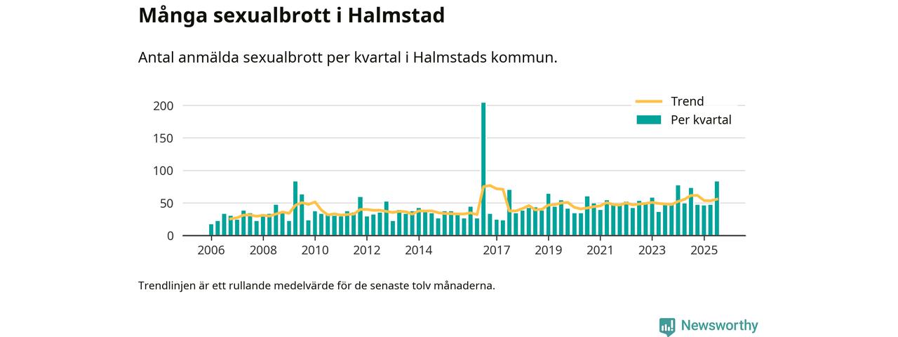 Det anmäldes sammanlagt 83 sexualbrott i Halmstads kommun under tredje kvartalet 2025. Vi får gå tillbaka till tredje kvartalet 2016 för att hitta ett kvartal då det anmäldes lika många sexualbrott i kommunen.